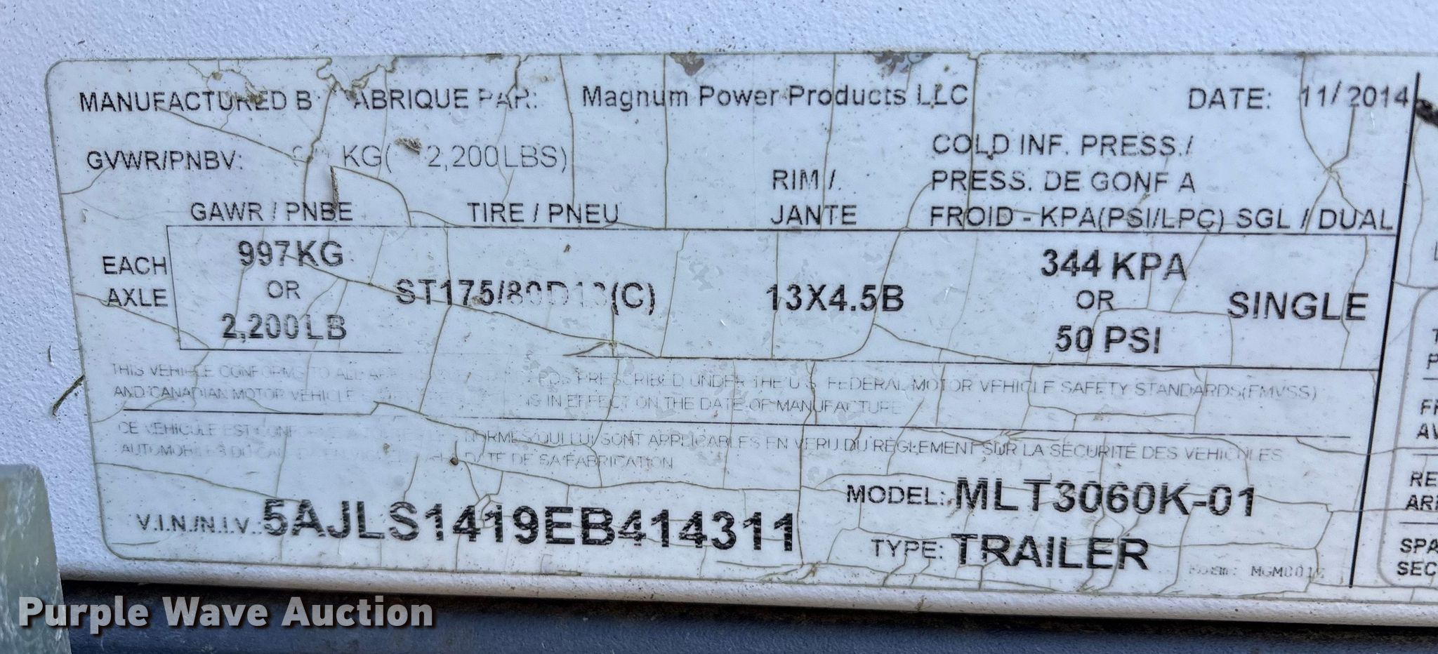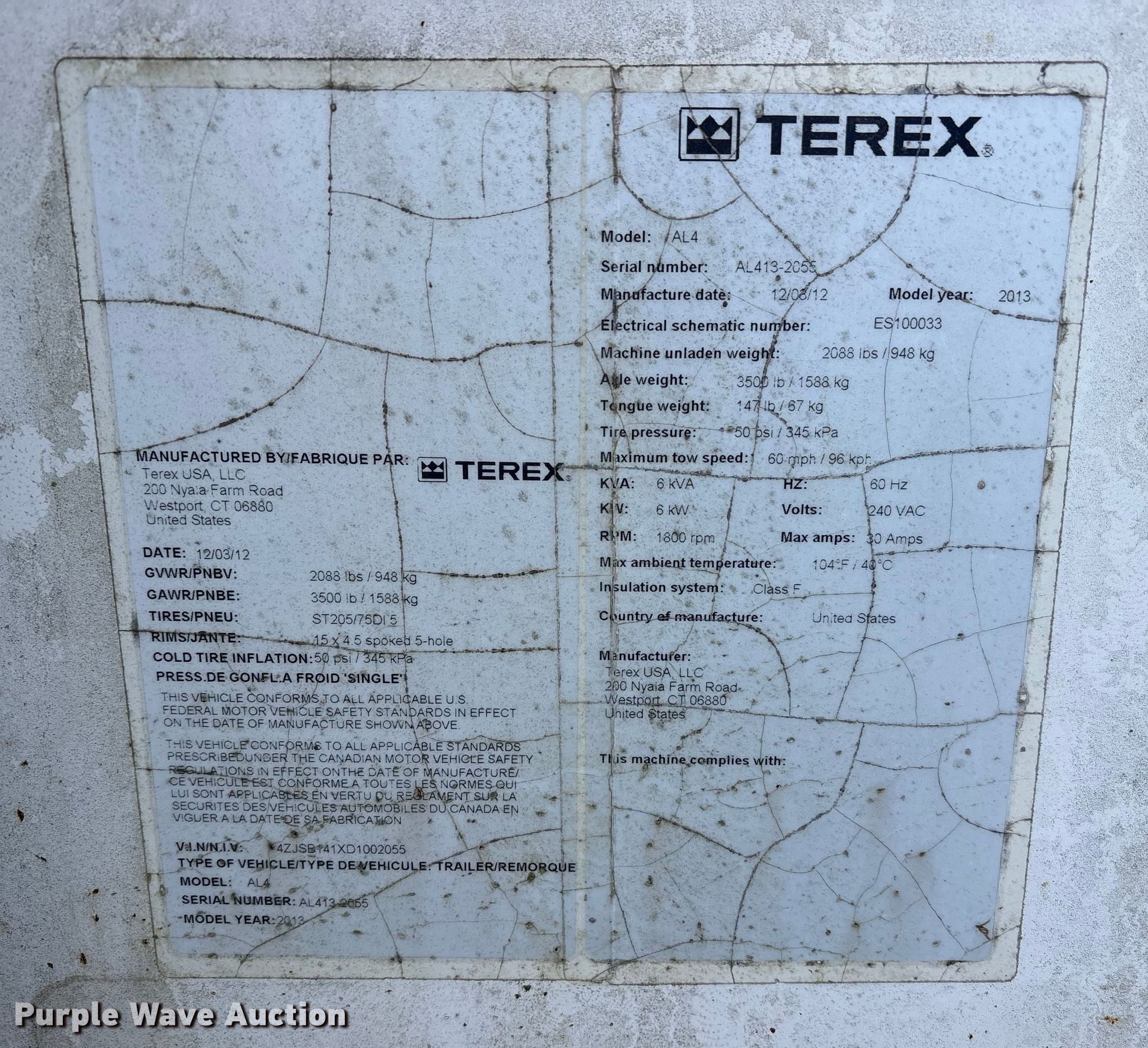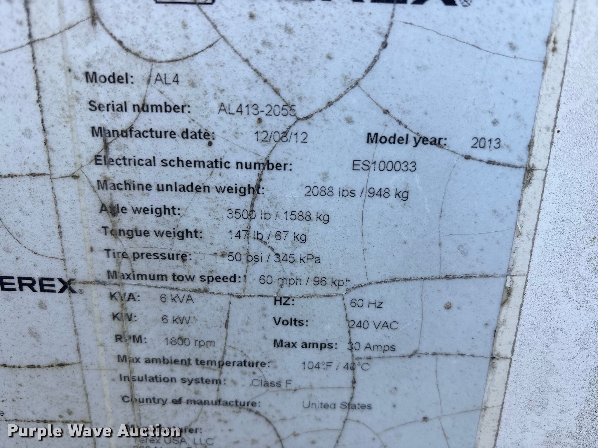 (4) light plants. Unit #: 41705, 48696, 48978, 48192. Magnum power MLT4060 light plant Serial: 5AJLS1417DB303710. Engine Kubota, Cylinders: 3, Fuel type: Diesel. Features Generator, Pancake. Trailer Axles: Single, Suspension: Spring, Tire size: 175/80R13. Terex AL4 light plant Serial: 4ZJSB141XD1002055. Features Generator, Pancake. Trailer Axle: Single, Suspension: Spring. Tires Size: 205/70D1. Wacker Neuson LTV8 light plant Engine Kubota, Cylinders: 3, Fuel type: Diesel. Trailer Axles: Single Suspension: Torsion. Tires Size: 175/80D13. Magnum Power MLT3060K light plant Serial: 5AJLS1419EB414311. Engine Kubota Cylinders: 3, Fuel type: Diesel. Trailer Axle: Single, Suspension: Spring. Tires Size: 175/80D13. Notes Unknown operating condition. This is worksite support equipment and will not come with a title. Transfer of ownership documentation will be a bill of sale. Stallion Infrastructure Services. Williamsport, PA 17701