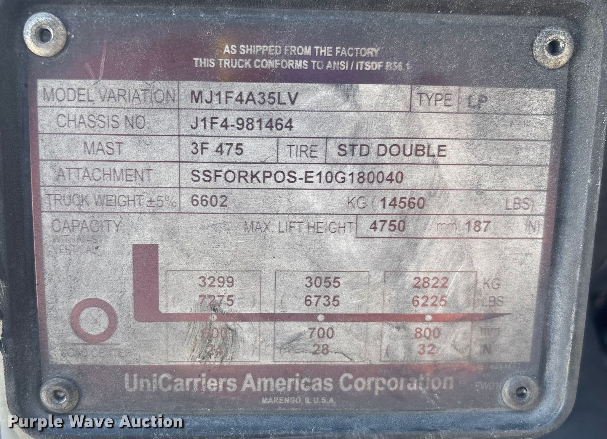 2016 UniCarriers PF80YLP forklift. Hours: 4,608 on meter, Serial: J1F4-981464, Unit #: SFS2901. Engine GCT TB45L, Displacement: 4.5L, Cylinders: 6, Fuel type: LPG LP bottle: Not included. Transmission Automatic. Operators station OROPS, Canopy. Features Maximum lift capacity: 7,275 lbs, Maximum lift height: 187", Collapsed mast height: 90", Mast stages: 3, Side shift, Mast tilt, Fork positioner, Fork length: 59". Tires Front: 8.25–15, Rear: 7.00–12, Solid. Notes Warning indicator: Master warning, Check engine, Oil pressure. Ferguson. Riviera Beach, FL 33404