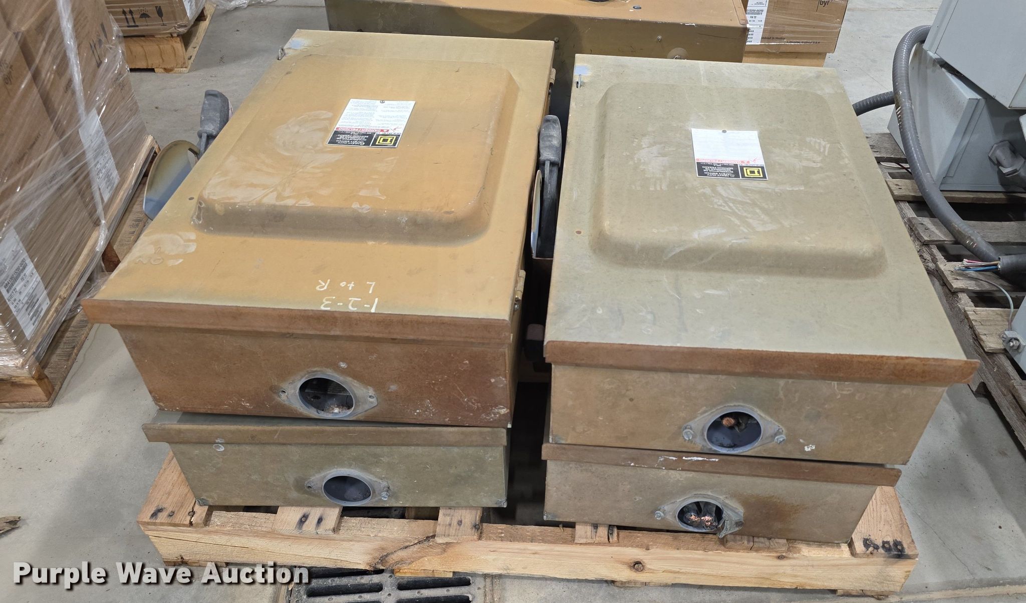 Purple Wave is selling a used Building Materials in Kansas. This item is a Electrical equipment with the following: (23) junction boxes, (4) Square D switches, Unused, (5) Square D switches