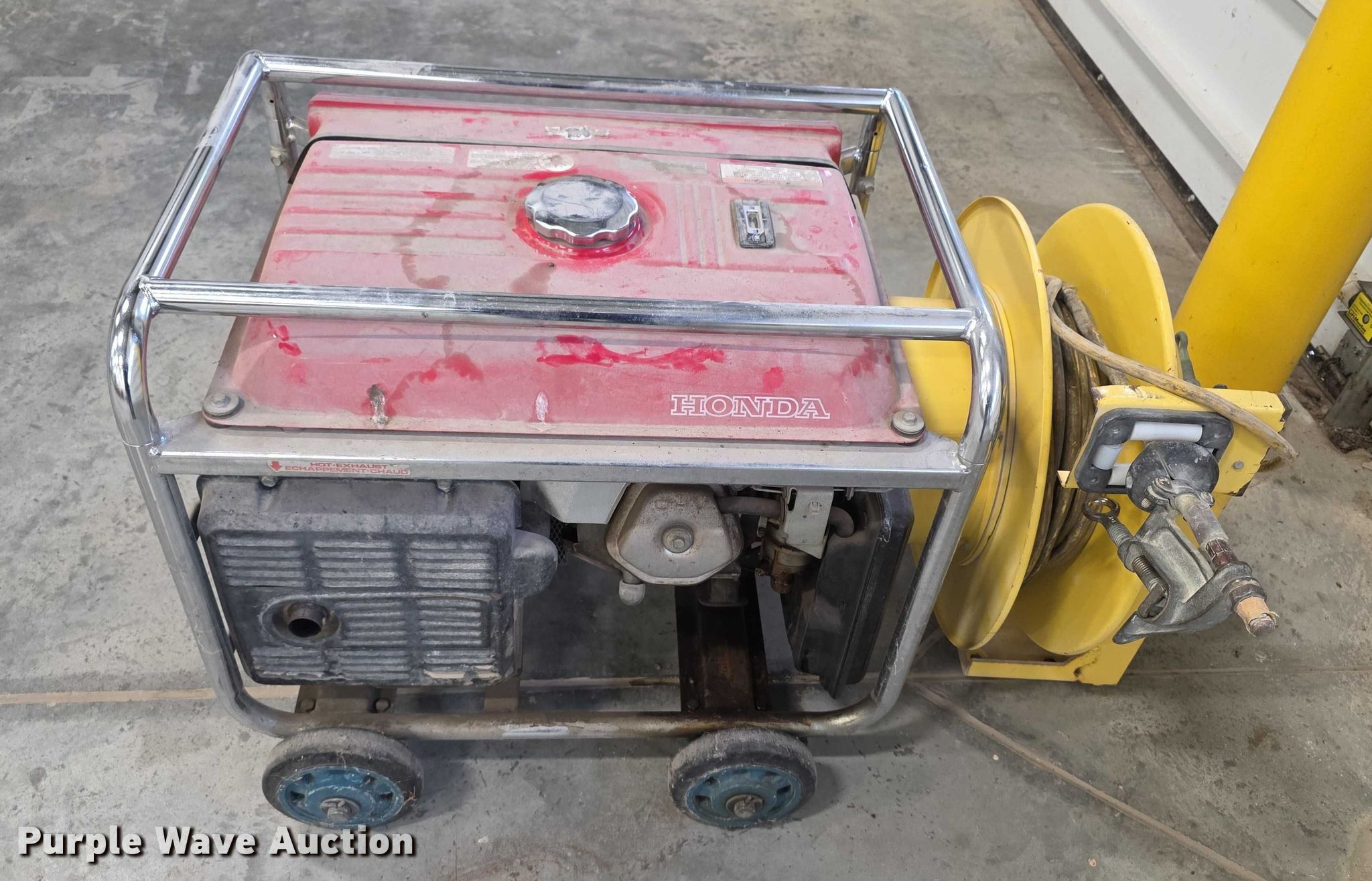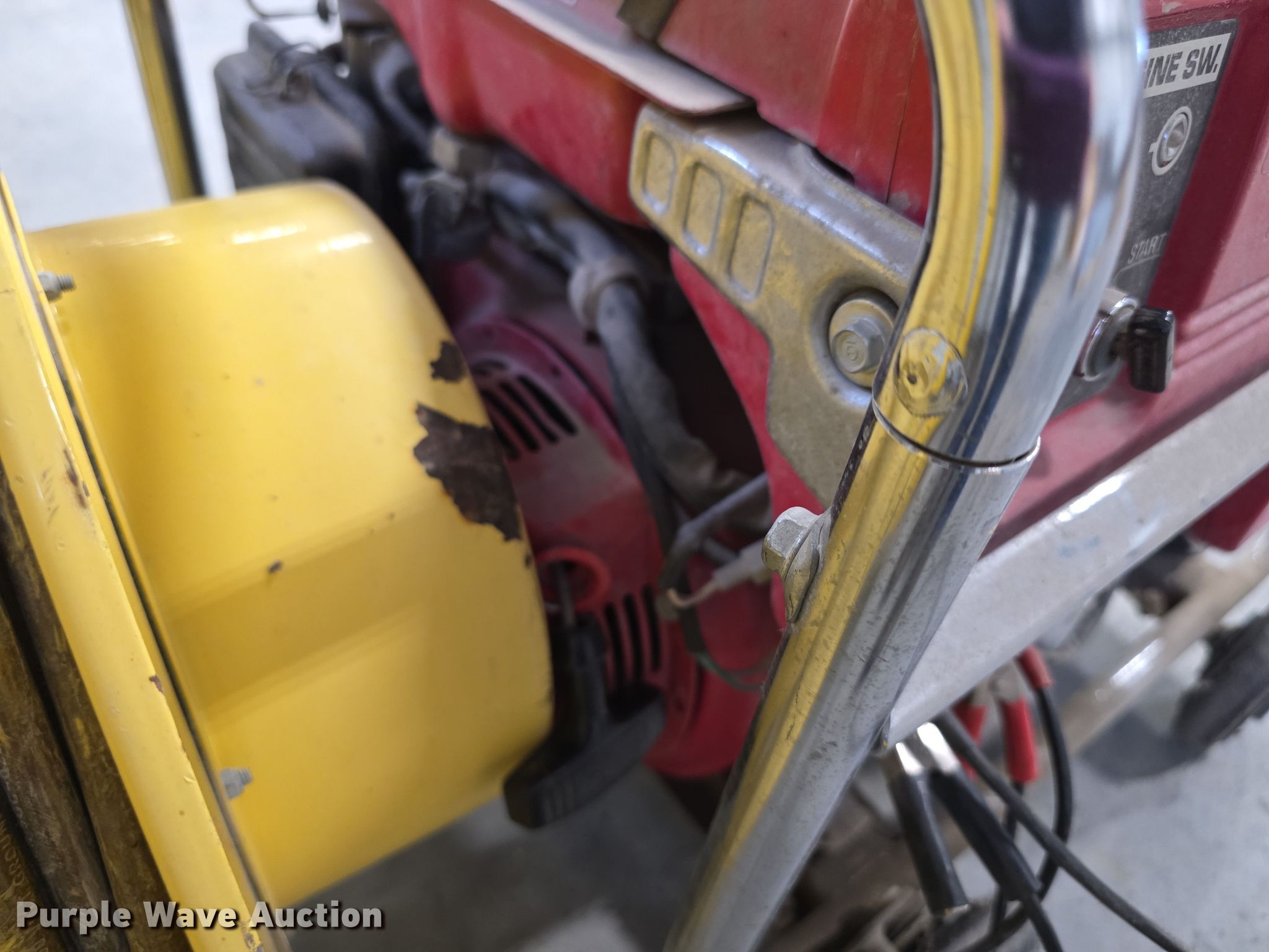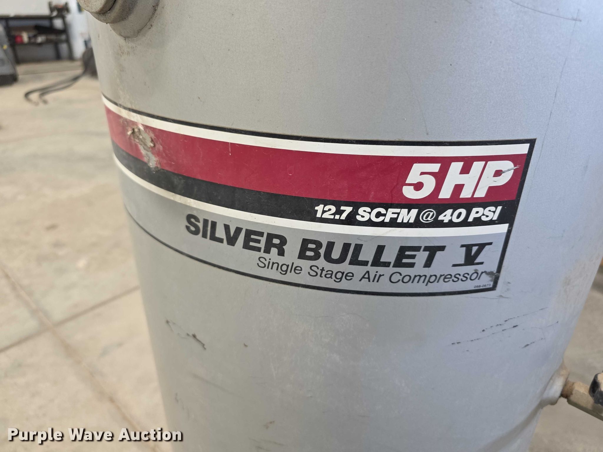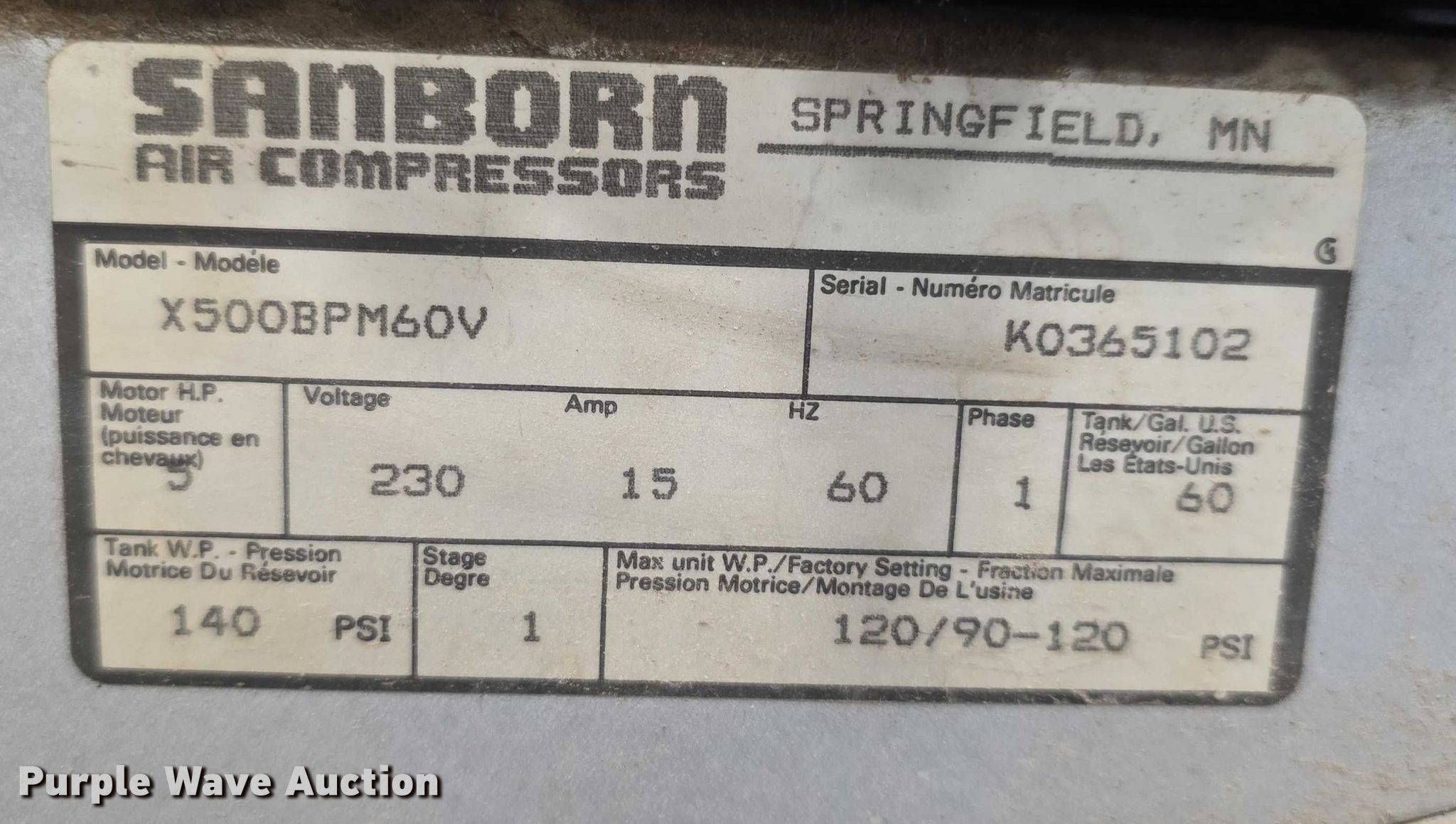 Purple Wave is selling a used Tools in Kansas. This item is a Shop equipment with the following: 1990 Sanborn Silver Bullet V 0210050 air compressor, Capacity: 60 gallons, Phase: SIngle, Magnetek motor, Honda EM 5000 SX Generator, Volts: 120/240, Honda gas engine, Hose reel, UWS toolbox