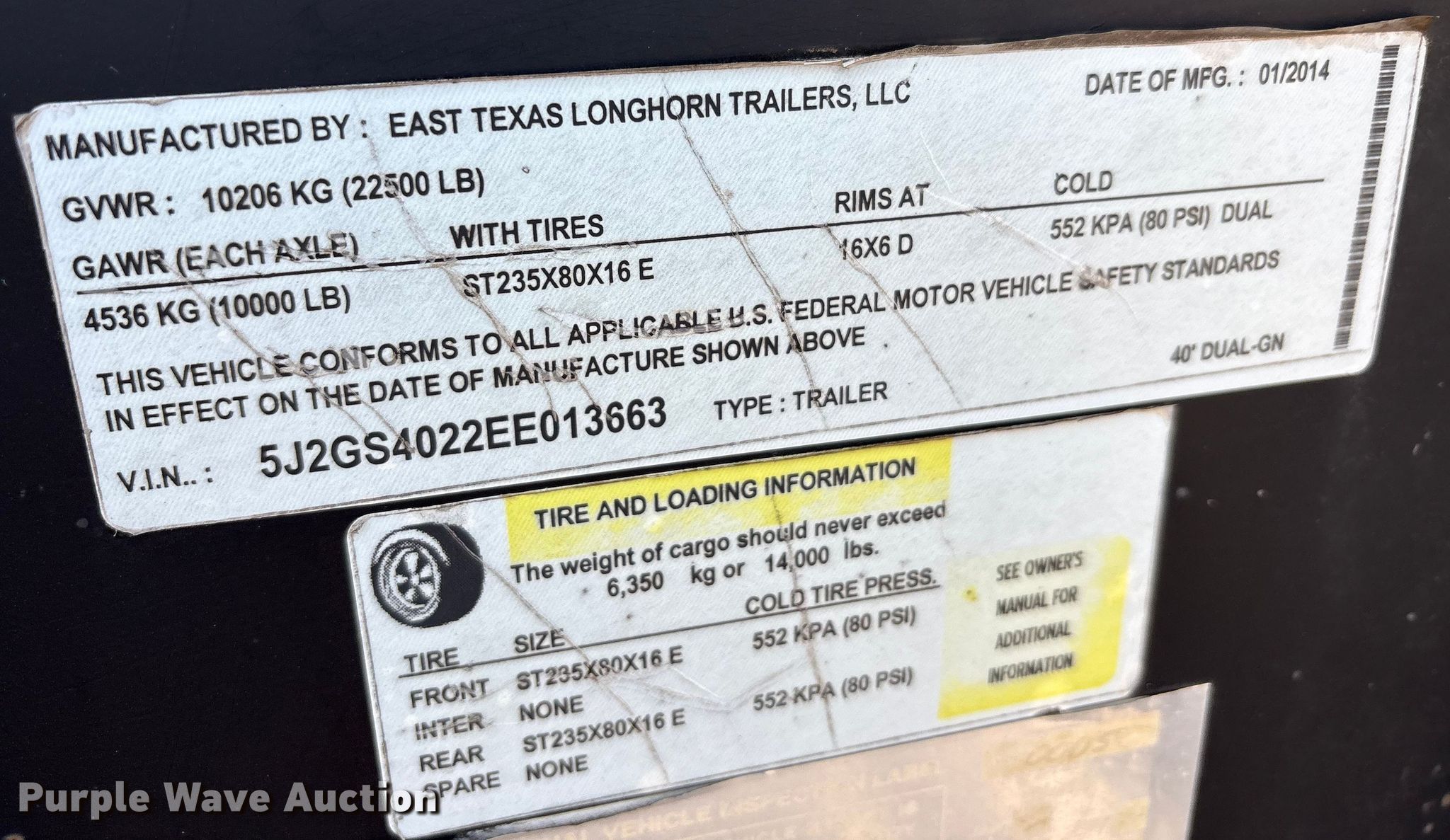 Purple Wave is selling a used Equip. Trailer in Oklahoma. This item is a 2014 East Texas Longhorn Trailers, Llc equipment trailer with the following: VIN: 5J2GS4022EE013663