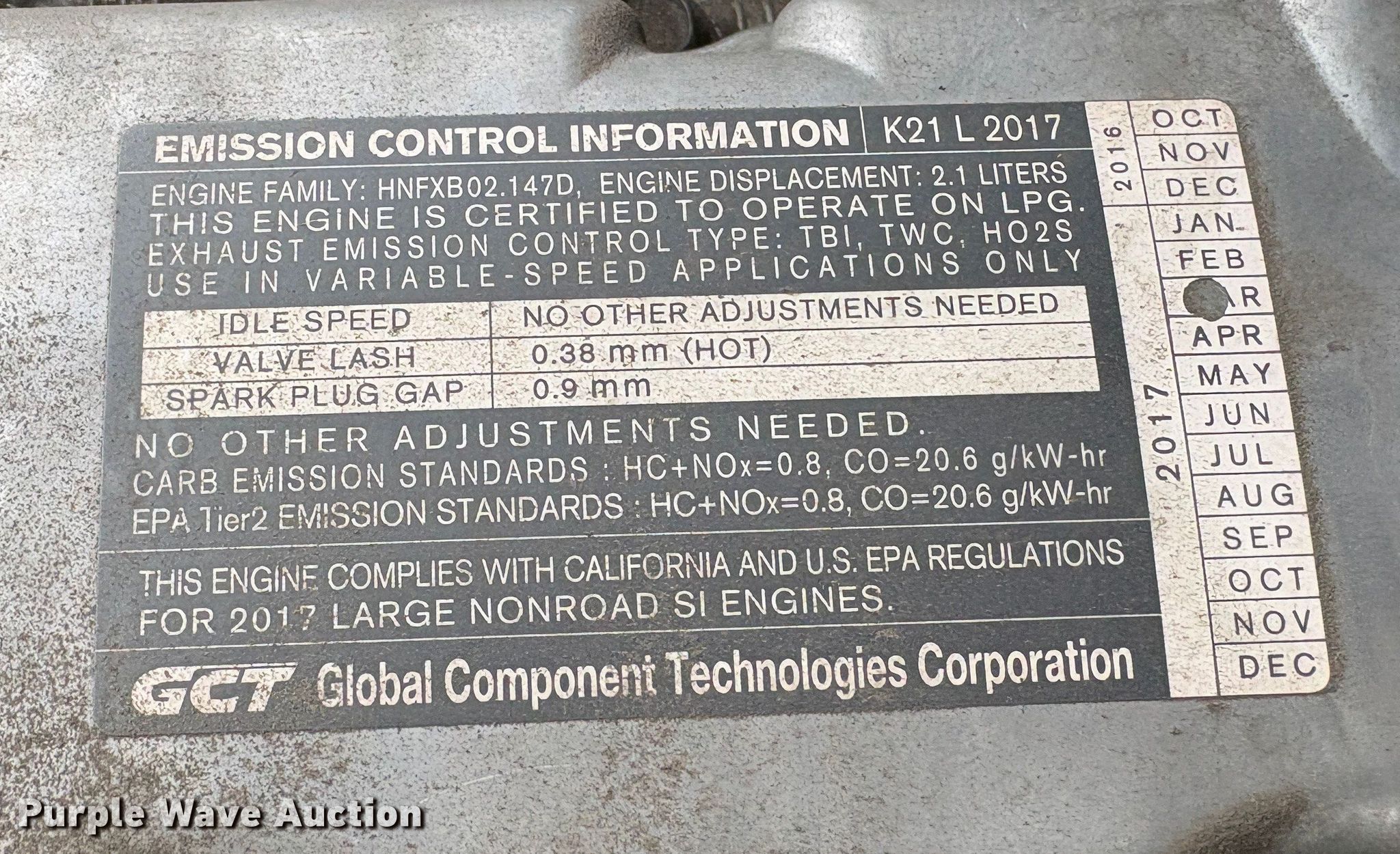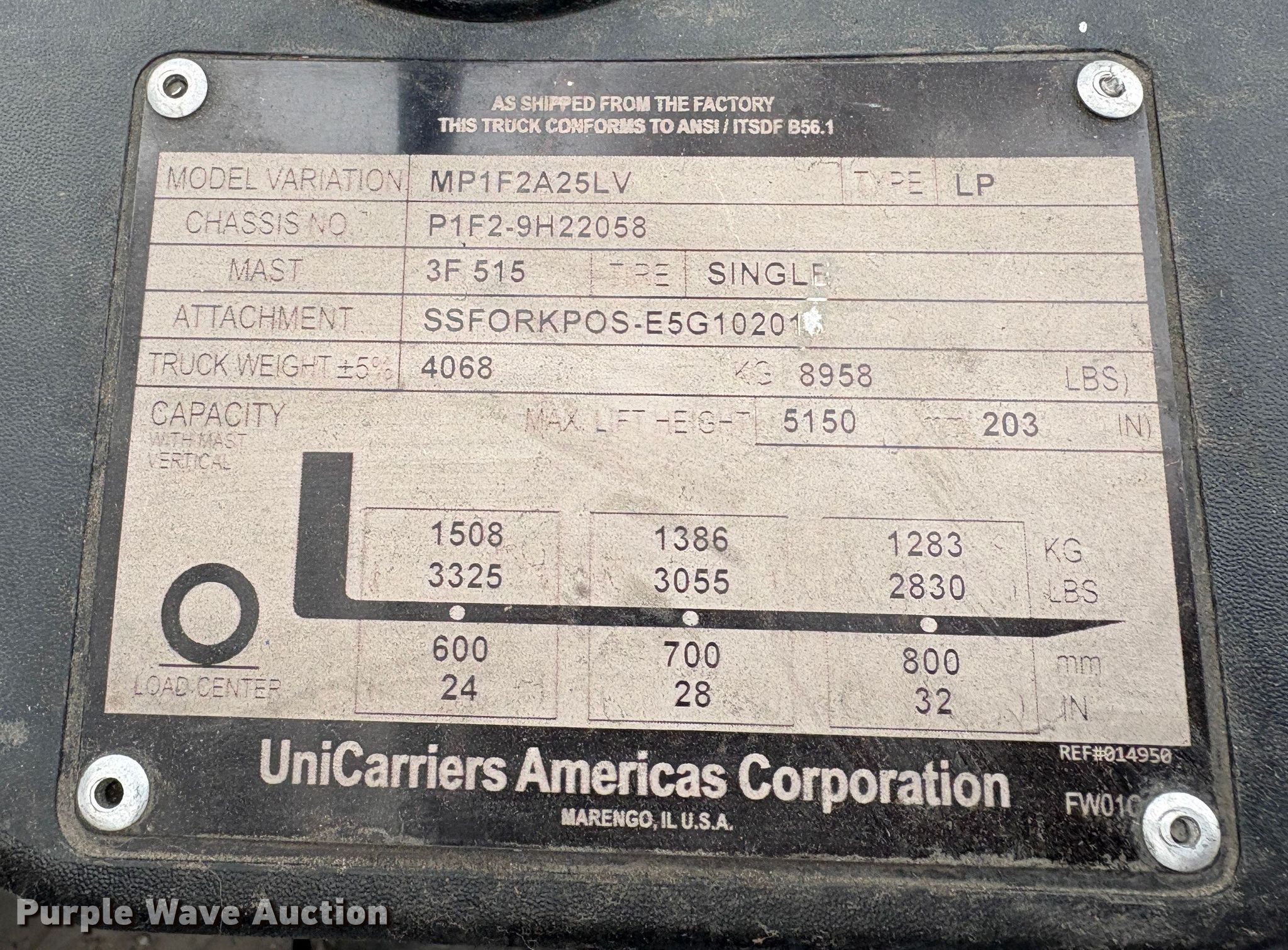 2017 UniCarriers PF50 forklift. Hours: 4,811 on meter, Serial: P1F2-9H22058, Unit #: SFS2834. Engine GCT K21, Displacement: 2.1L, Cylinders: 4, Fuel type: LPG. Transmission Automatic. Operators station OROPS, Canopy. Features Maximum lift capacity: 3,325 lbs, Maximum lift height: 203", Collapsed mast height: 86", Mast stages: 3, Side shift, Mast tilt, Fork positioner, Fork length: 48". Tires Front: 7.00-12, Rear: 6.00-9, Solid. Ferguson. Chico, CA 95928