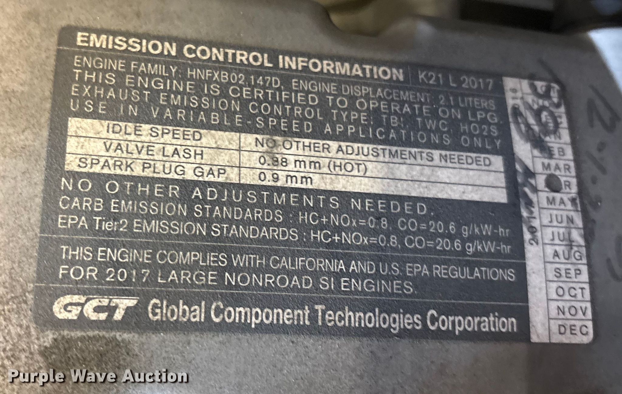 2017 UniCarriers PF50 forklift. Hours: 3,211 on meter, Serial: P1F2-9H22119, Unit #: SFS2852. Engine GCT K21, Displacement: 2.1L, Cylinders: 4, Fuel type: LPG LP bottle: Not included. Transmission Automatic. Operators station OROPS, Canopy. Features Maximum lift capacity: 3,325 lbs, Maximum lift height: 203", Collapsed mast height: 85", Mast stages: 3, Side shift, Mast tilt, Fork positioner, Fork length: 48". Tires Front: 7.00-12, Rear: 6.00-9, Solid. Ferguson. Clovis, CA 93611