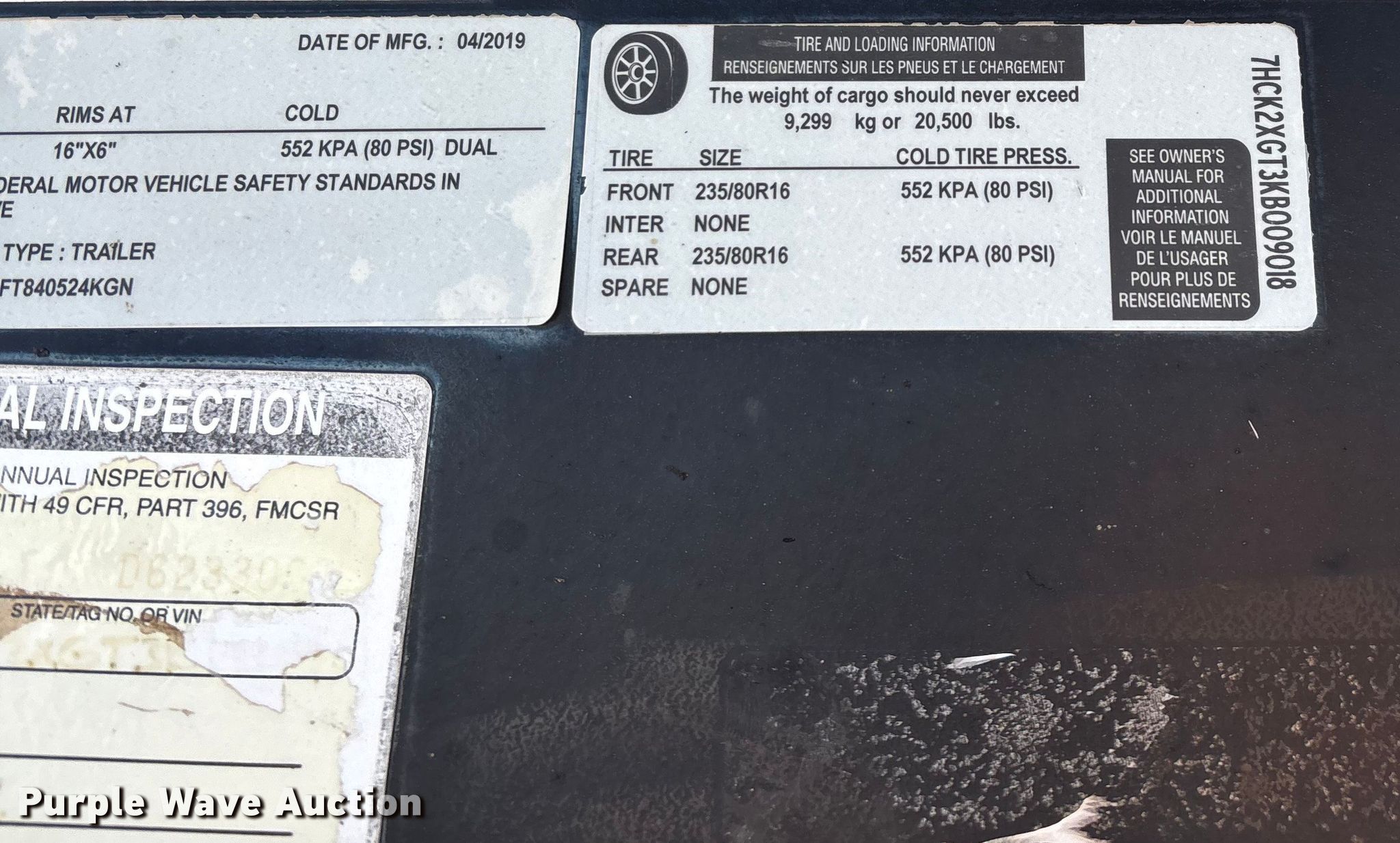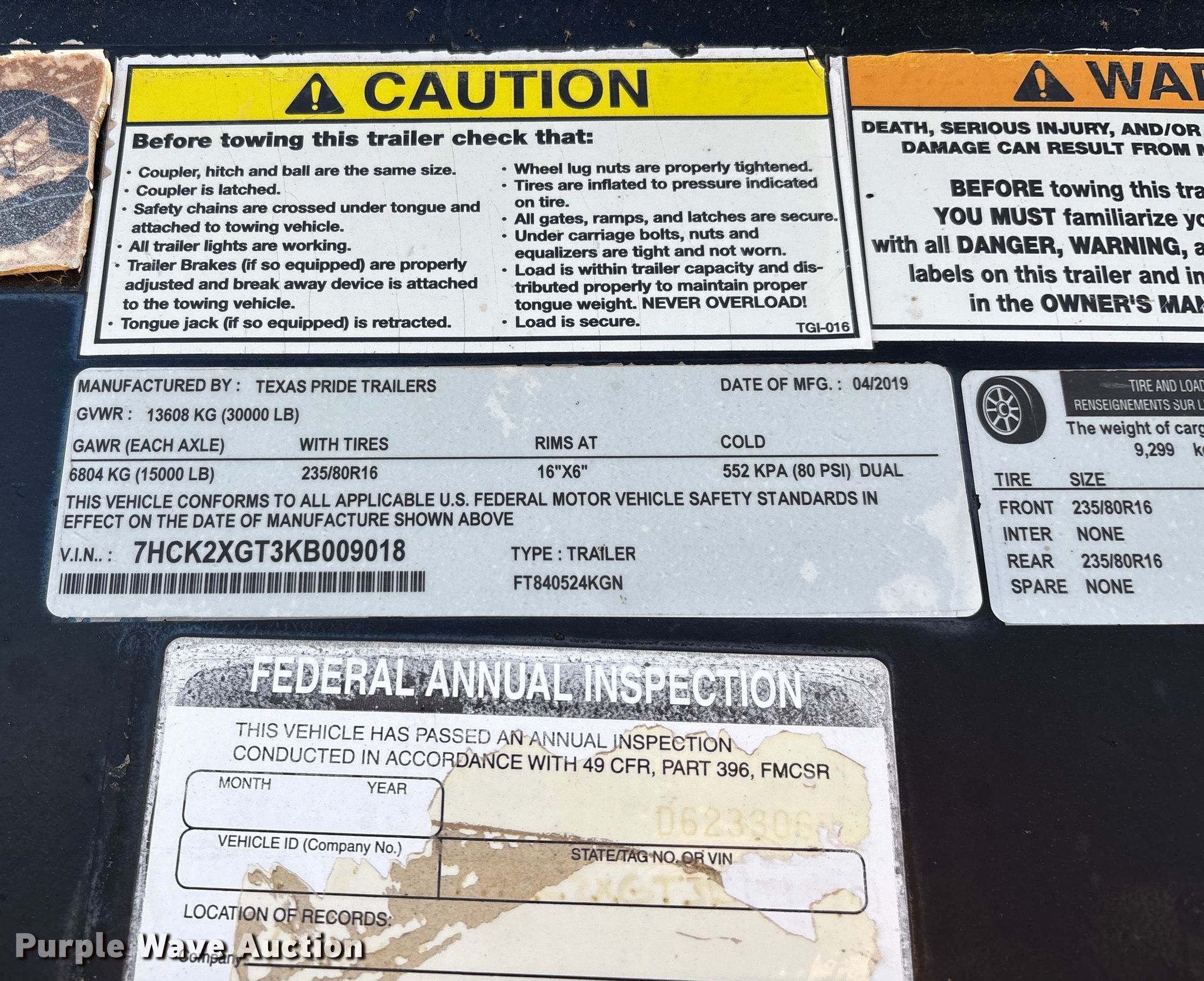 Purple Wave is selling a used Equip. Trailer in Oklahoma. This item is a 2019 Texas Pride FT840524KGN equipment trailer with the following: VIN: 7HCK2XGT3KB009018