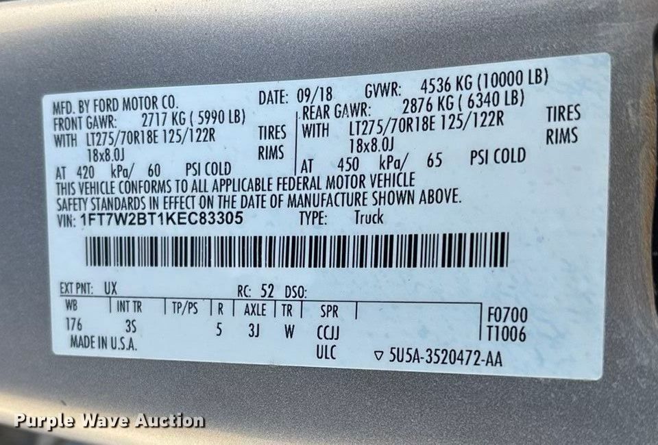 Purple Wave is selling a used 3/4 or 1 Ton Pickup or Van in Oklahoma. This item is a 2019 Ford F250 Super Duty Crew Cab utility bed pickup truck with the following: Miles: 148,171 on odometer, Hours: 16,486 on meter, VIN: 1FT7W2BT1KEC83305