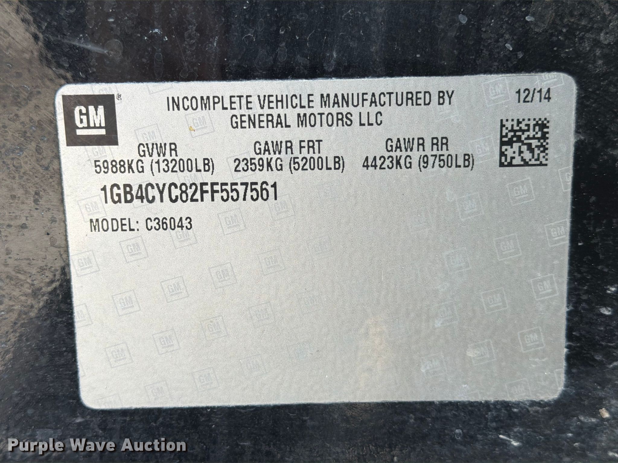 2015 Chevrolet Silverado 3500HD Crew Cab flatbed pickup truck. Miles: 180,160 on odometer, VIN: 1GB4CYC82FF557561, Unit #: P-192. Engine Displacement: 6.6L, Cylinders: 8, Fuel type: Diesel. Transmission Automatic. Interior AC, Heat, Power windows, Power locks, Cruise control, Brake controller. Features Bed Length: 9', Width: 96". Tires Size: 235/80R17. Missouri title. Title distribution may be delayed up to 30 days from verification of funds. Ace Pipe Cleaning, Inc.. Kansas City, MO 64120
