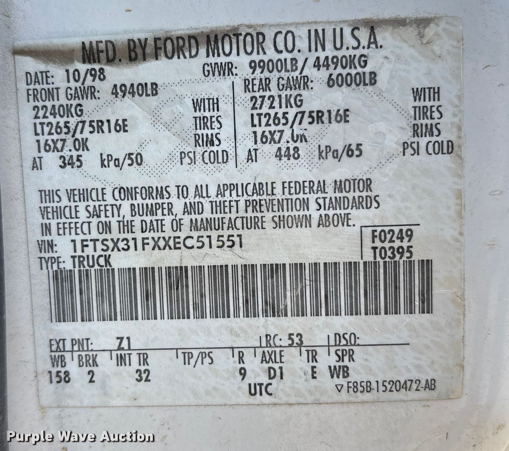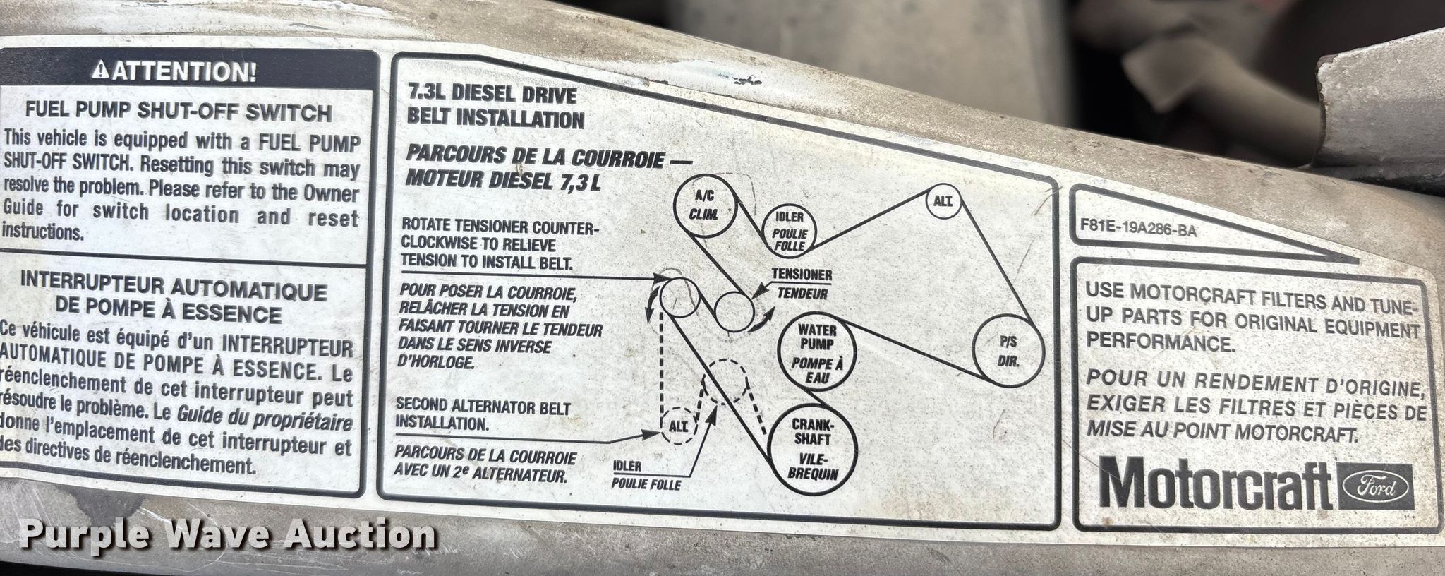 1999 Ford F350 Super Duty XLT Ext. Cab pickup truck. Miles: 277,962 on odometer, VIN: 1FTSX31FXXEC51551. Engine Displacement: 7.3L, Cylinders: 8, Fuel type: Diesel. Transmission Automatic, Four wheel drive. Interior AC, Heat, Power windows, Power locks, Cruise control, Brake controller. Tires Size: 265/75R16. Missouri title. Title distribution may be delayed up to 30 days from verification of funds. Ace Pipe Cleaning, Inc.. Kansas City, MO 64120