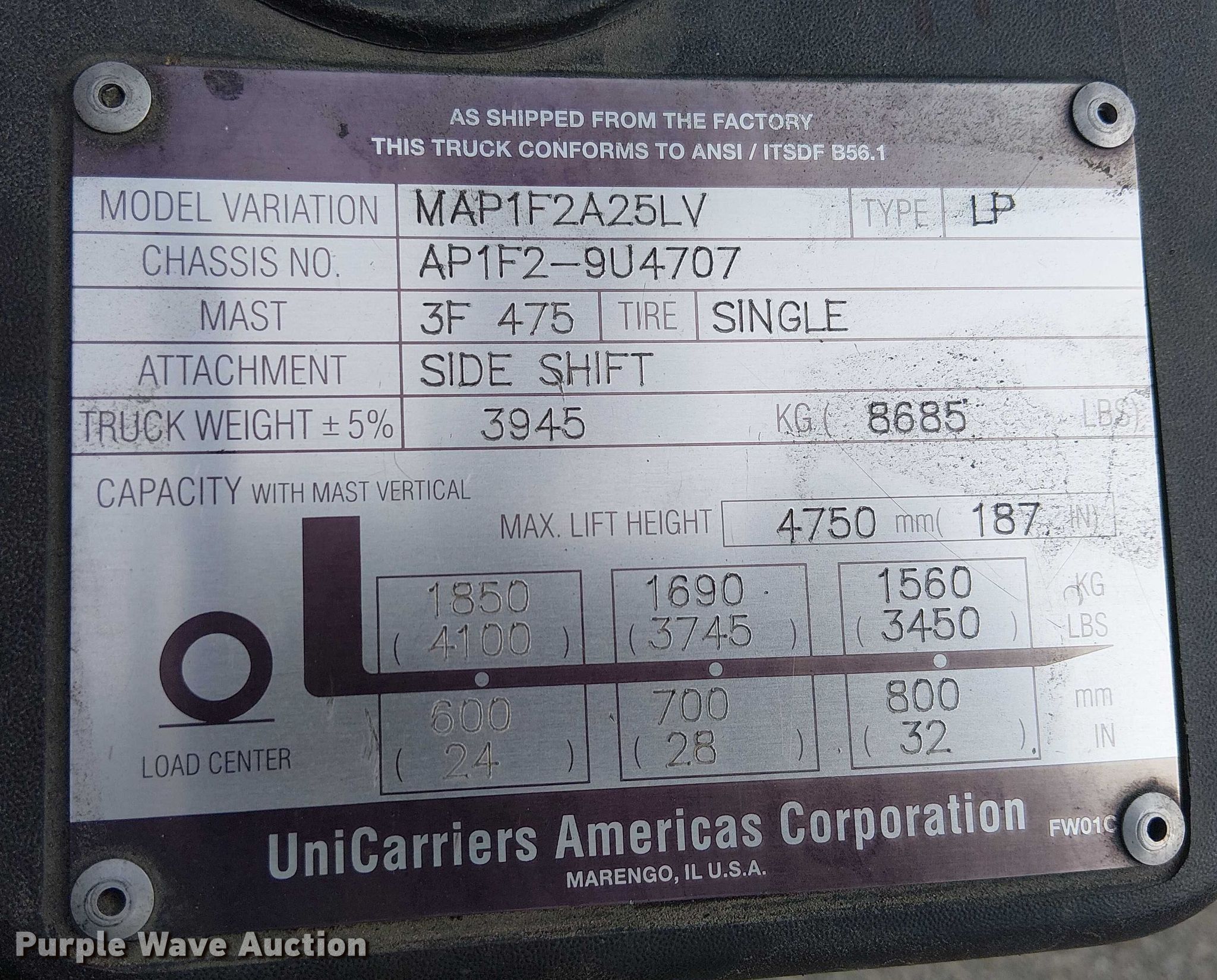 2015 UniCarriers AF50 forklift. Hours: 4,598 on meter, Miles or hours may vary, unit still in use, Serial: AP1F2-9U4707, Unit #: SFS2856. Engine GCT K21L, Displacement: 2.1L, Cylinders: 4, Fuel type: LPG LP bottle: Not included. Transmission Automatic. Operators station OROPS. Features Maximum lift capacity: 4,100 lbs, Maximum lift height: 187", Collapsed mast height: 180", Mast stages: 3, Side shift, Mast tilt, Fork length: 48". Tires Front: 21x18-9, Rear: 18x7-8, Solid. Notes Warning indicator: Master warning. Ferguson. Santa Ana, CA 92705