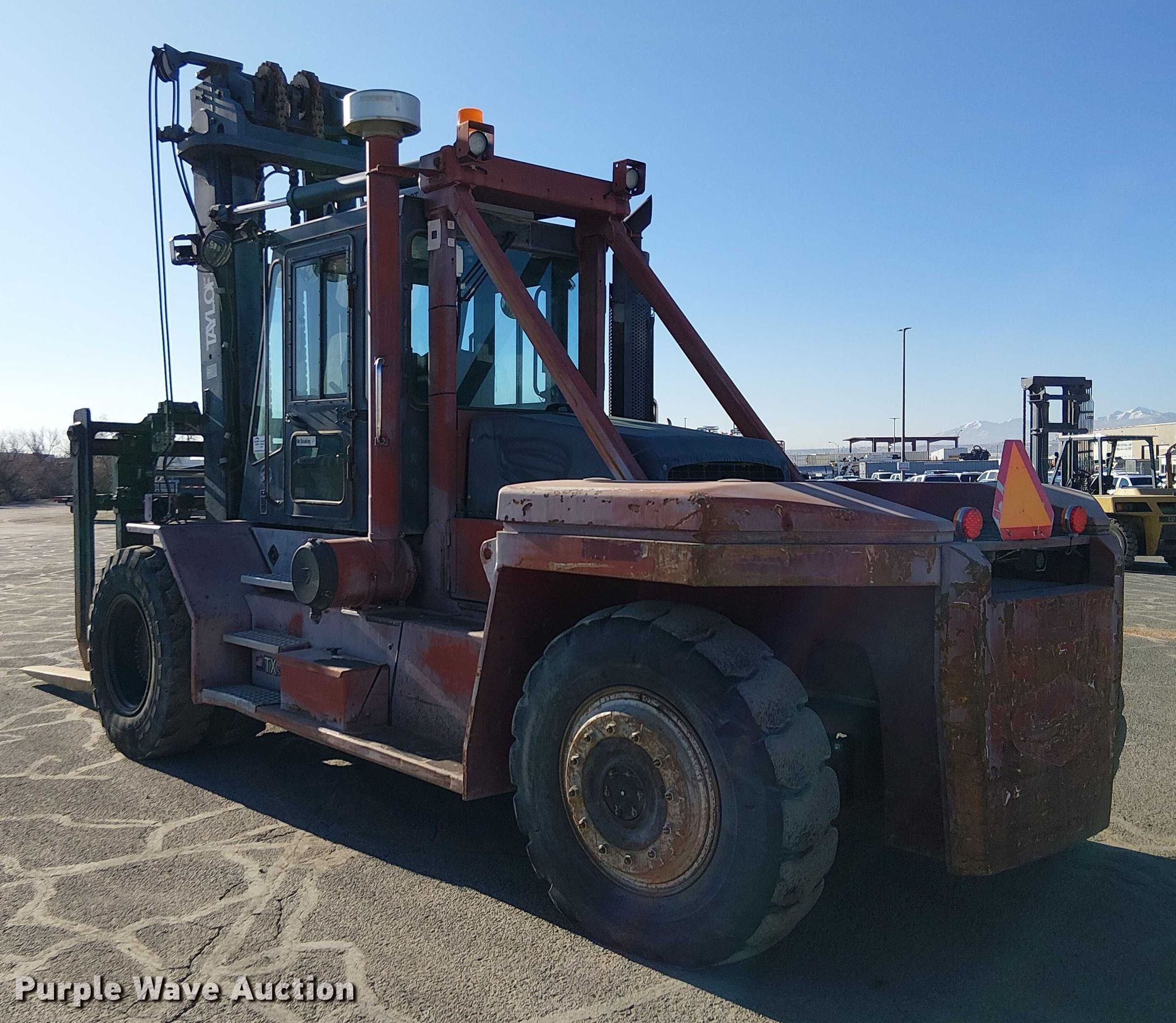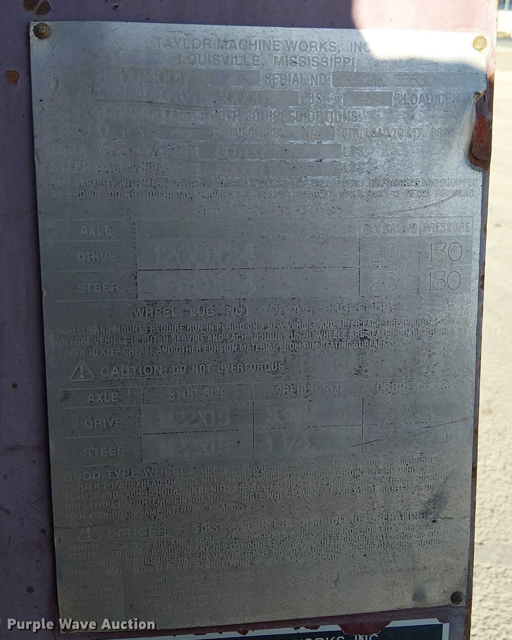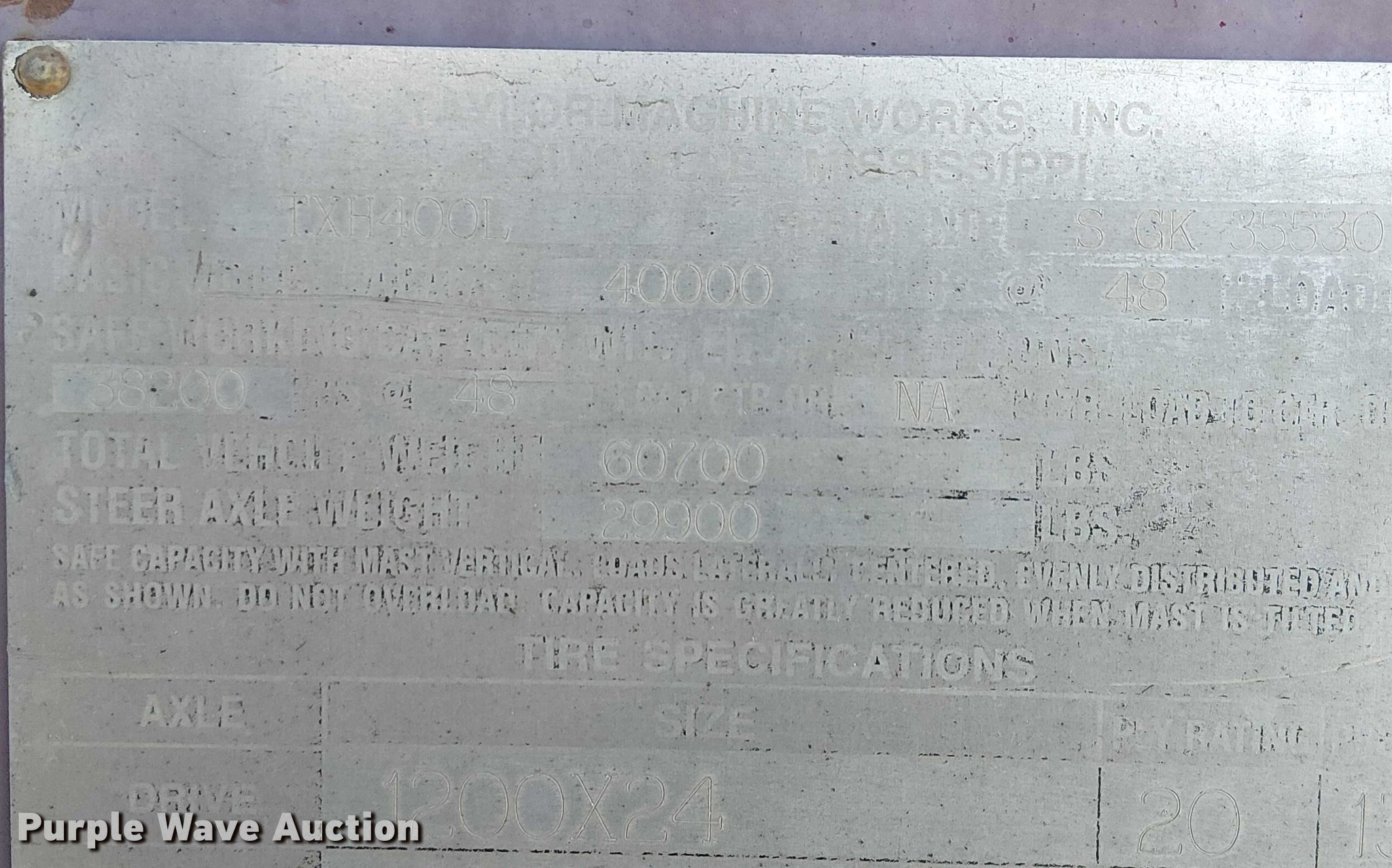 2009 Taylor TXH400L forklift. Hours: 25,436 on meter, Serial: S CK 35530. Engine Cummins ISB, Serial: 46806123, Displacement: 6.7L, Cylinders: 6, Fuel type: Diesel, HP: 190, kW: 142. Transmission Powershift. Operators station Enclosed cab, AC, Heat. Features Maximum lift capacity: 38,200 lbs, Maximum lift height: 132", Collapsed mast height: 166", Mast stages: 2, Side shift, Mast tilt, Fork positioner, Fork length: 80". Tires Front: 12.00-24, Rear: 12.00R24. Wheeler Machinery Co.. Salt Lake City, UT 84104