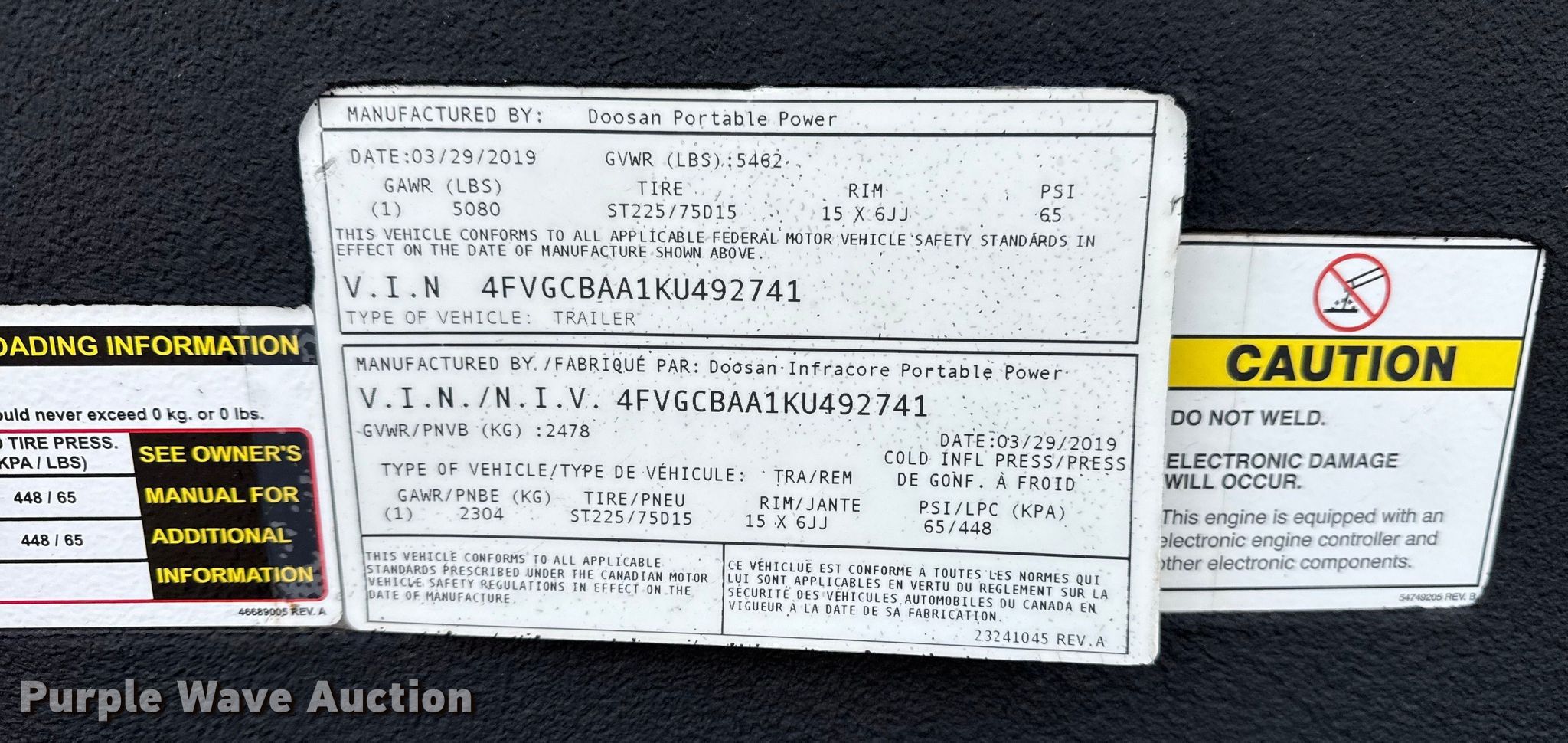 2019 Doosan Portable Power Infracore generator. Hours: 1,437 on meter, VIN: 4FVGCBAA1KU492741. Engine Doosan, Displacement: 1.8L, Cylinders: 4, Fuel type: Diesel. Features Generator MatelliMotori MJB160SB4, kVA: 27, Phase: Three, Electric start. Trailer 11' L x 70" W, Suspension: Torsion, Brakes: Electric, Axles: Single, Tire size: ST225/75D15, GVWR: 5,462 lbs, GAWR: 5,080 lbs. Oklahoma title. Seller is an Oklahoma licensed motor vehicle dealer. Buyers may be required to provide identification to the licensed dealer to comply with state laws. Title will be assigned and distributed by the dealer. Please contact the seller for distribution questions. Title distribution may be delayed up to 30 days from verification of funds. Collinsville, OK 74021