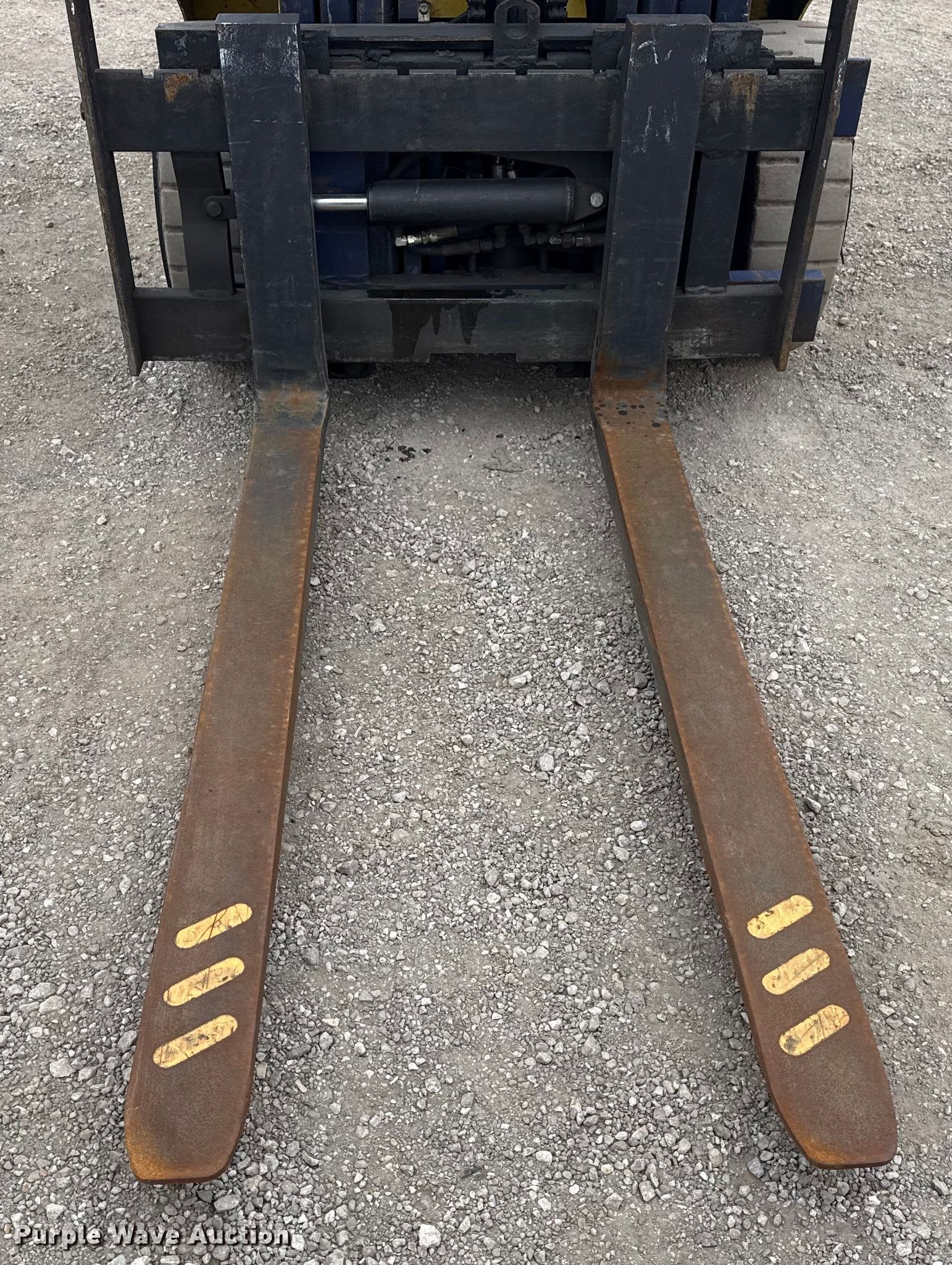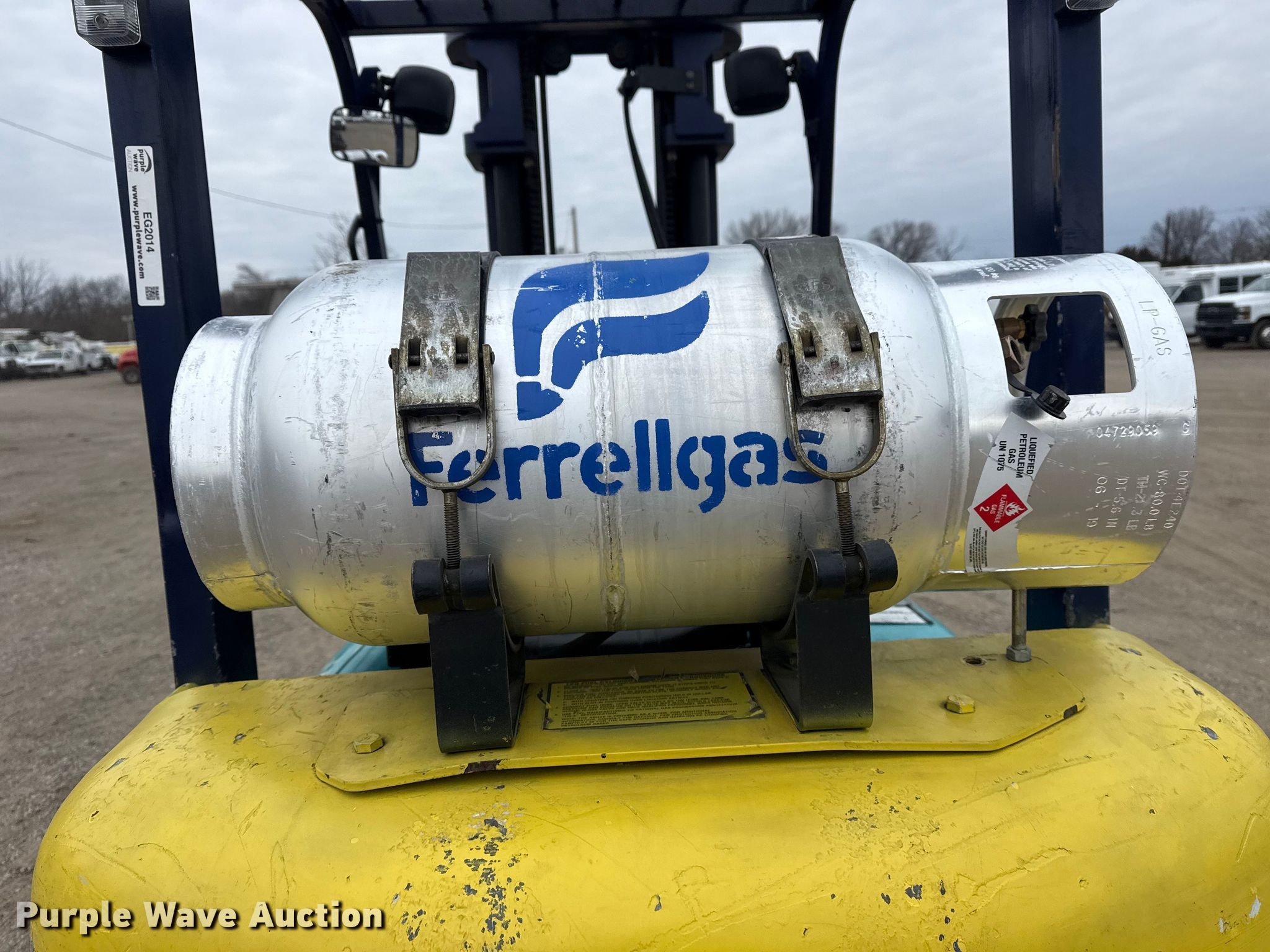 Komatsu FG25ST-12 forklift. Hours: 8,395 on meter, Serial: 508417A. Engine Cylinders: 4, Fuel type: LPG. Transmission Powershift. Operators station Canopy. Features Maximum lift capacity: 8,540 lbs, Maximum lift height: 188", Collapsed mast height: 85", Mast stages: 3, Side shift, Mast tilt, Fork length: 48". Tires Front: 21x7x15, Rear: 16.25x5x11.25, Solid, Rear tires non-marking. Collinsville, OK 74021