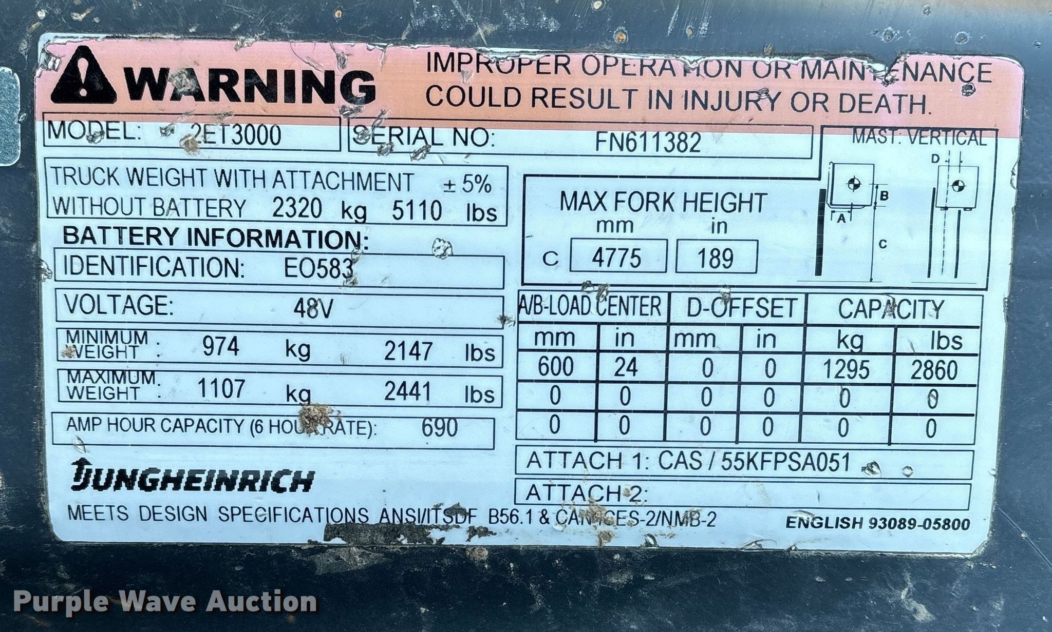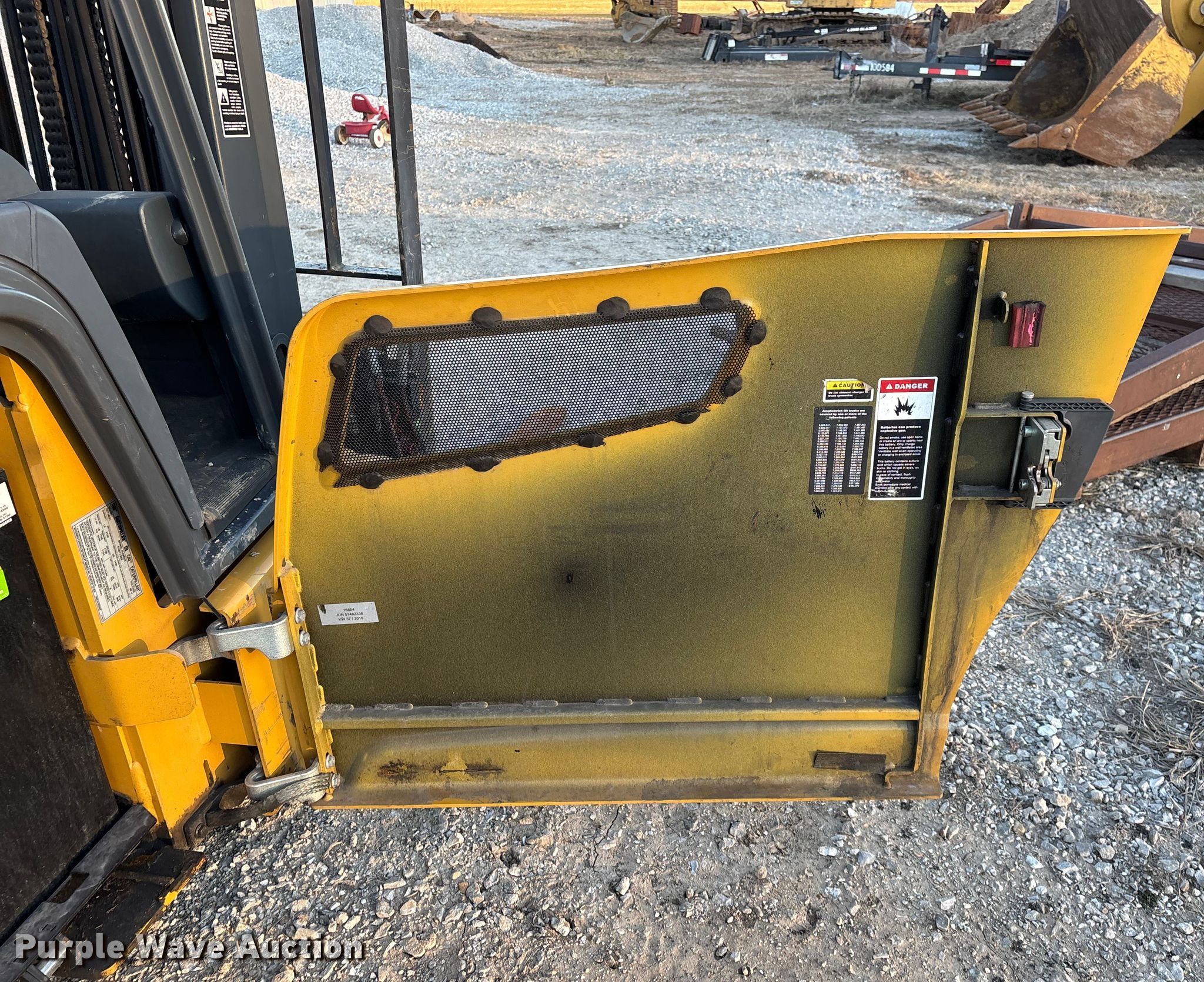 Caterpillar 2ET3000 forklift. Hours: Unknown, Serial: FN611382. Electric Motor Volts: 48. Transmission Electric drive. Features Maximum lift capacity: 2,860 lbs, Maximum lift height: 189", Collapsed mast height: 85", Mast stages: 3, Side shift, Mast tilt, Fork positioner, Fork length: 42". Tires Front: 8x7-8, Rear: 140/55-9/4.00, Solid. Notes Dash cluster illumination issues, Dead battery, Non-operational unit. Bar J Sales. Milo, MO 64767