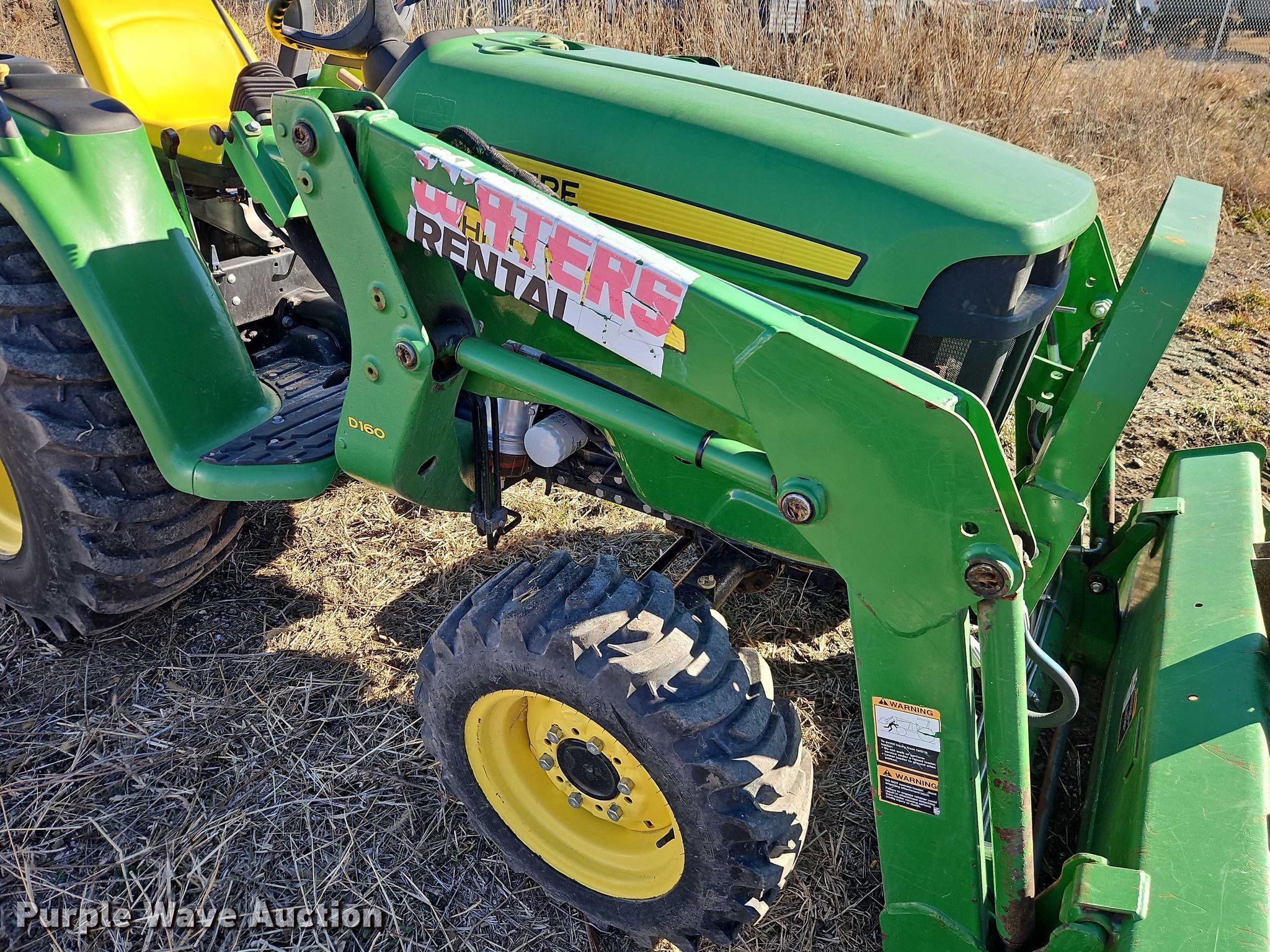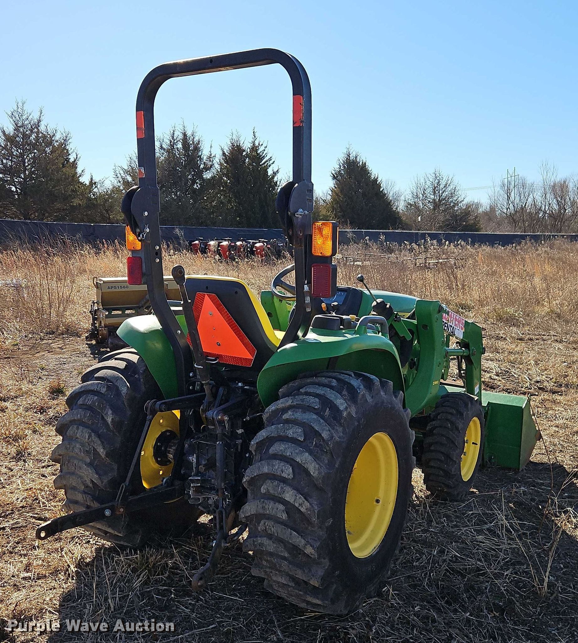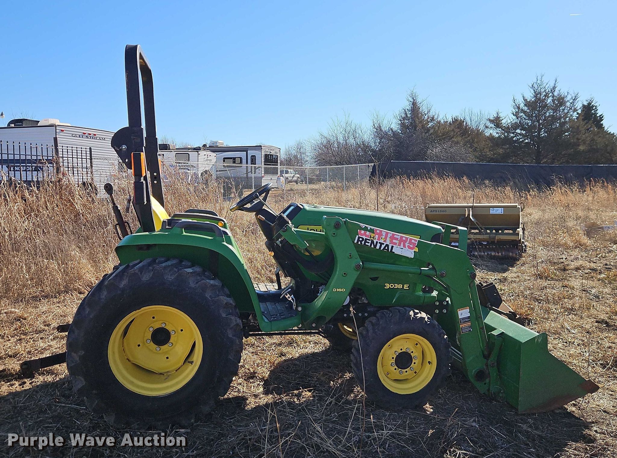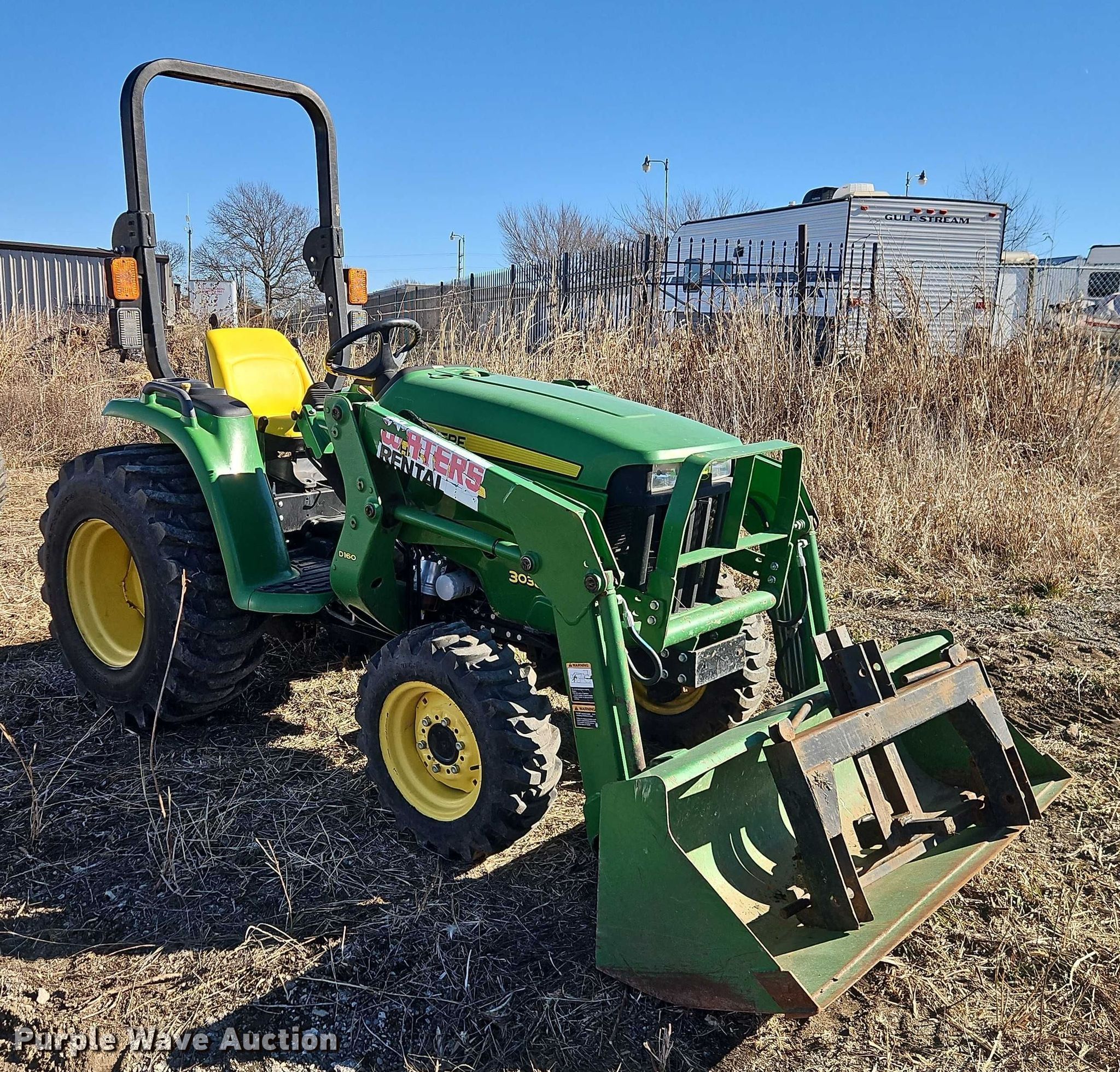 John Deere 3038E MFWD tractor. Hours: 920 on meter, Serial: 1LV3038EJGG101632. Engine Yanmar 3TNV86CT, Cylinders: 3, Fuel type: Diesel. Transmission Hydrostatic, Differential lock. Features PTO: 540, Three point Top link, Quick attach, Front: 2, Loader John Deere D160, Controls: Joystick, Bucket Width: 62".. Tires Front: 25x8.50-14, Rear: 15-19.5. Gerken Rent-All. Paola, KS 66071