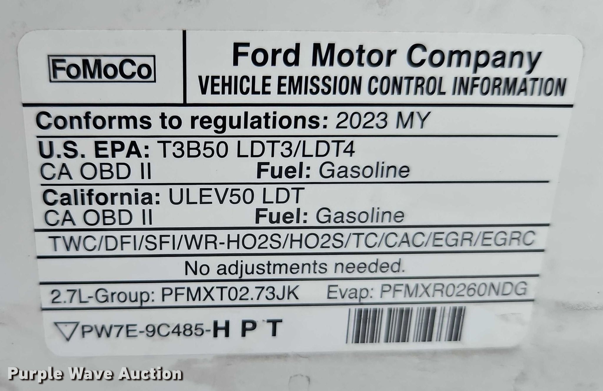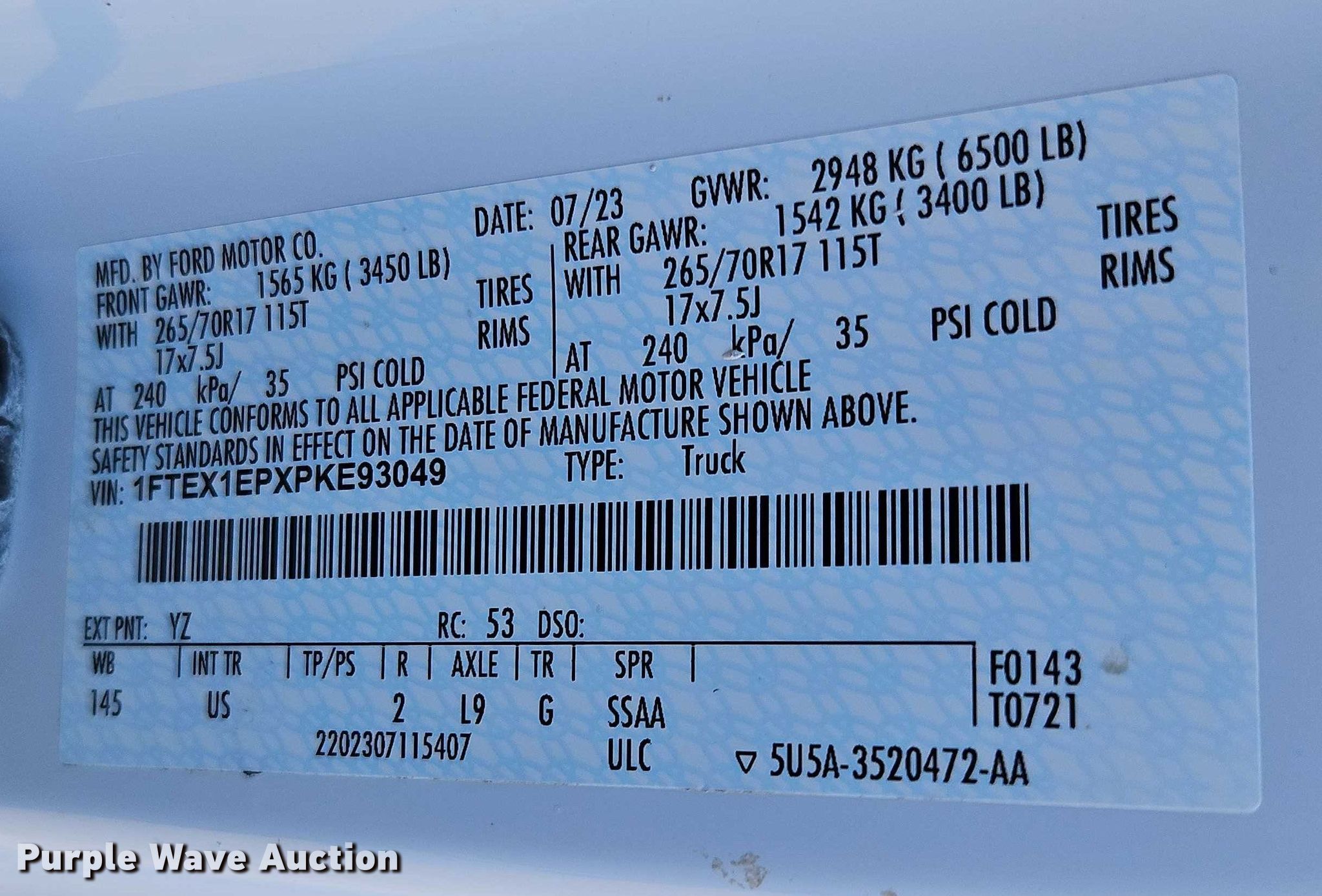 2023 Ford F150 Ext. Cab pickup truck. Miles: 81,079 on odometer, VIN: 1FTEX1EPXPKE93049. Engine Displacement: 2.7L, Cylinders: 6, Fuel type: Gas. Transmission Automatic, Four wheel drive. Interior AC, Heat, Seat: Power driver, Power windows, Power locks, Cruise control, Backup camera. Tires Size: 265/70R17. Missouri title. Title distribution may be delayed up to 14 days from verification of funds. Beyers Construction. Grandview, MO 64030