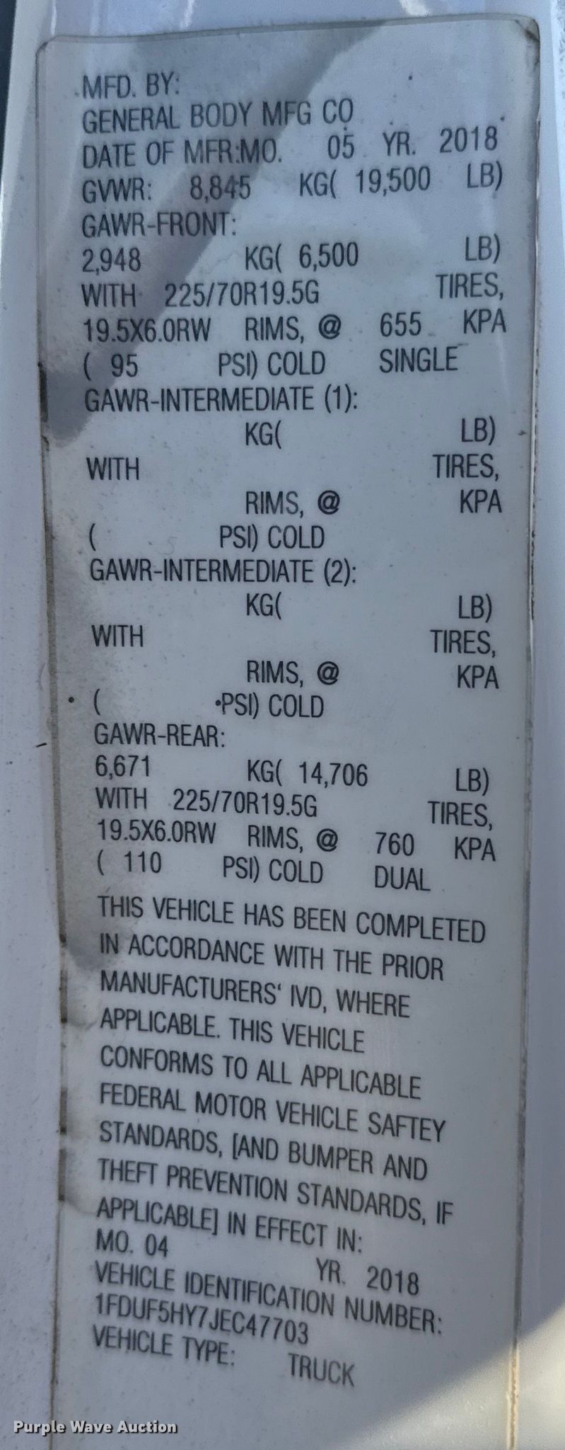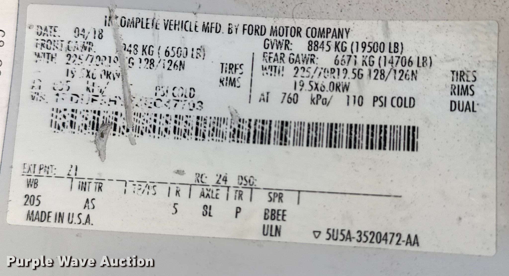 2018 Ford F550 Super Duty XL flatbed truck. Miles: 173,694 on odometer, VIN: 1FDUF5HY7JEC47703. Engine Displacement: 6.8L, Cylinders: 10, Fuel type: Gas. Transmission Automatic. Chassis Four wheel drive, Axles: Single, Suspension: Spring, Brakes: Hydraulic. Interior AC, Heat, Power windows, Power locks, Cruise control. Features Bed Flatbed, Length: 18', Width: 95". Tires Size: 225/70R19.5. Kansas title. Title distribution may be delayed up to 14 days from verification of funds. Sunnys Mobile Service LLC. Dodge City, KS 67801