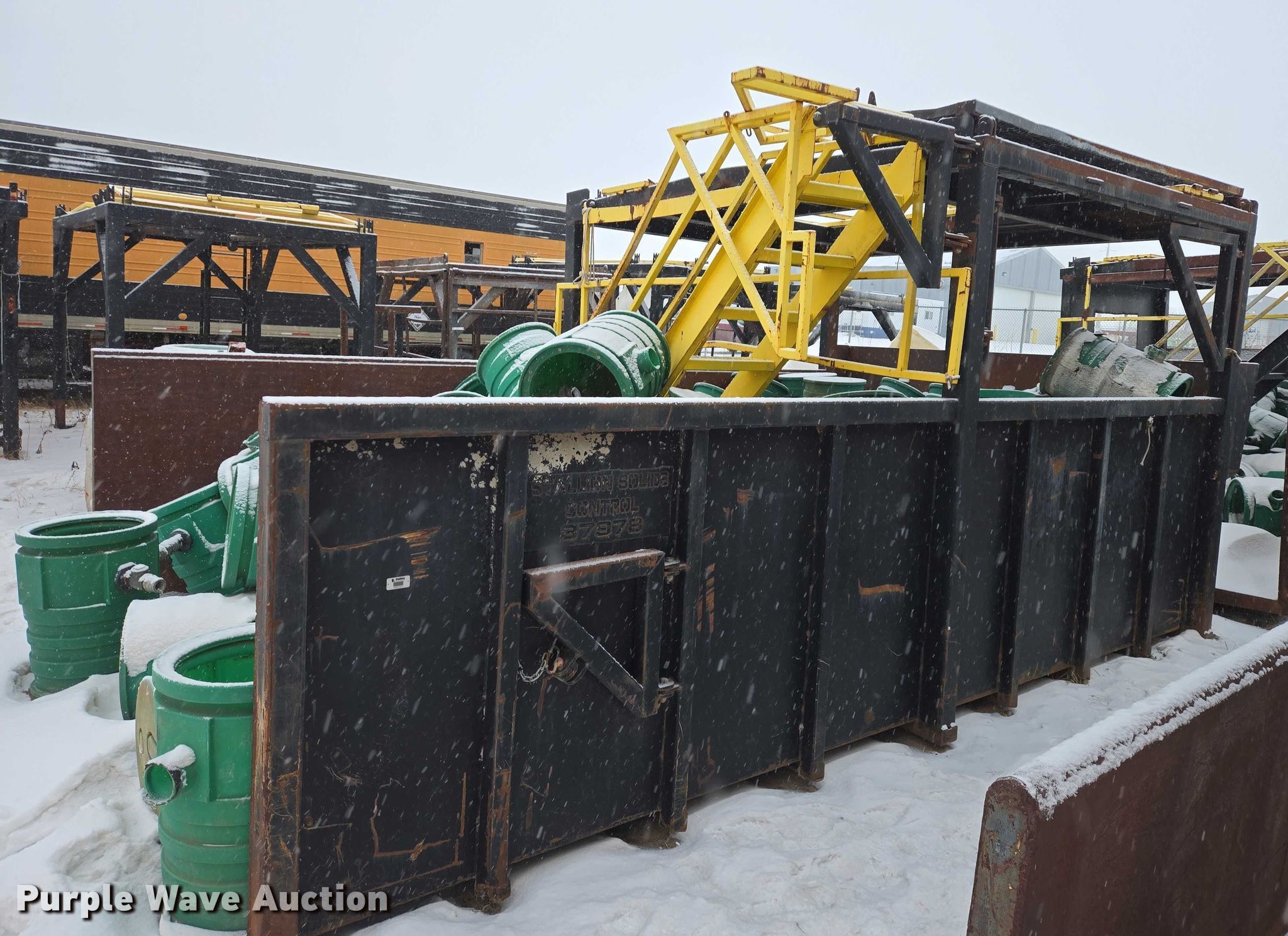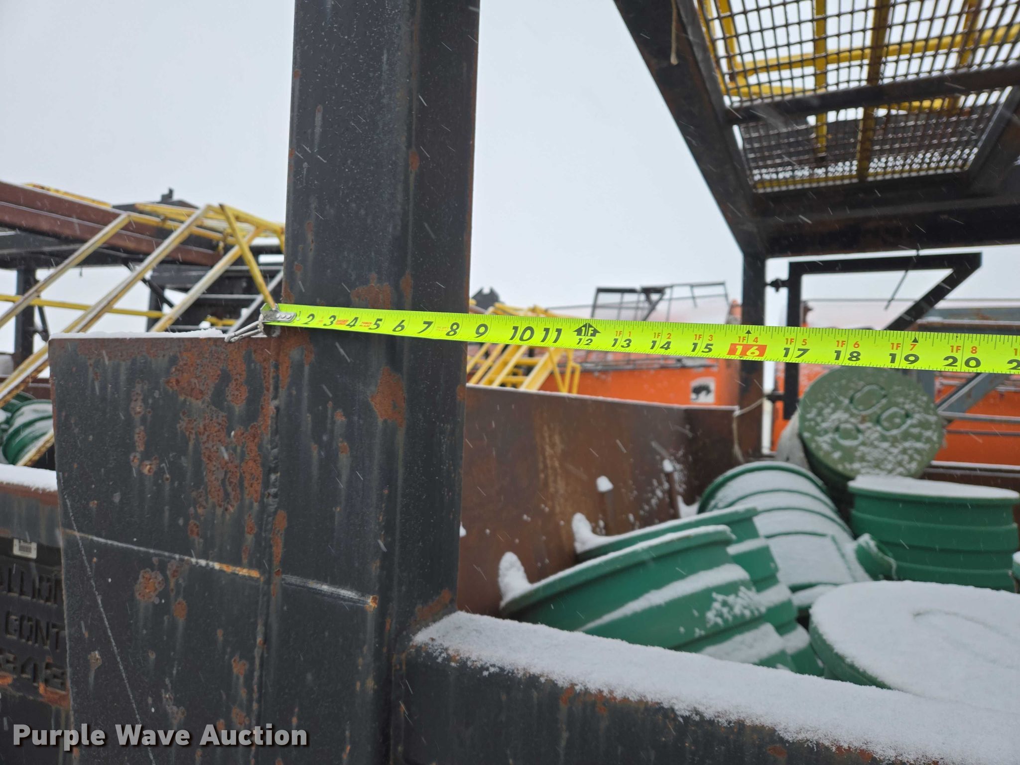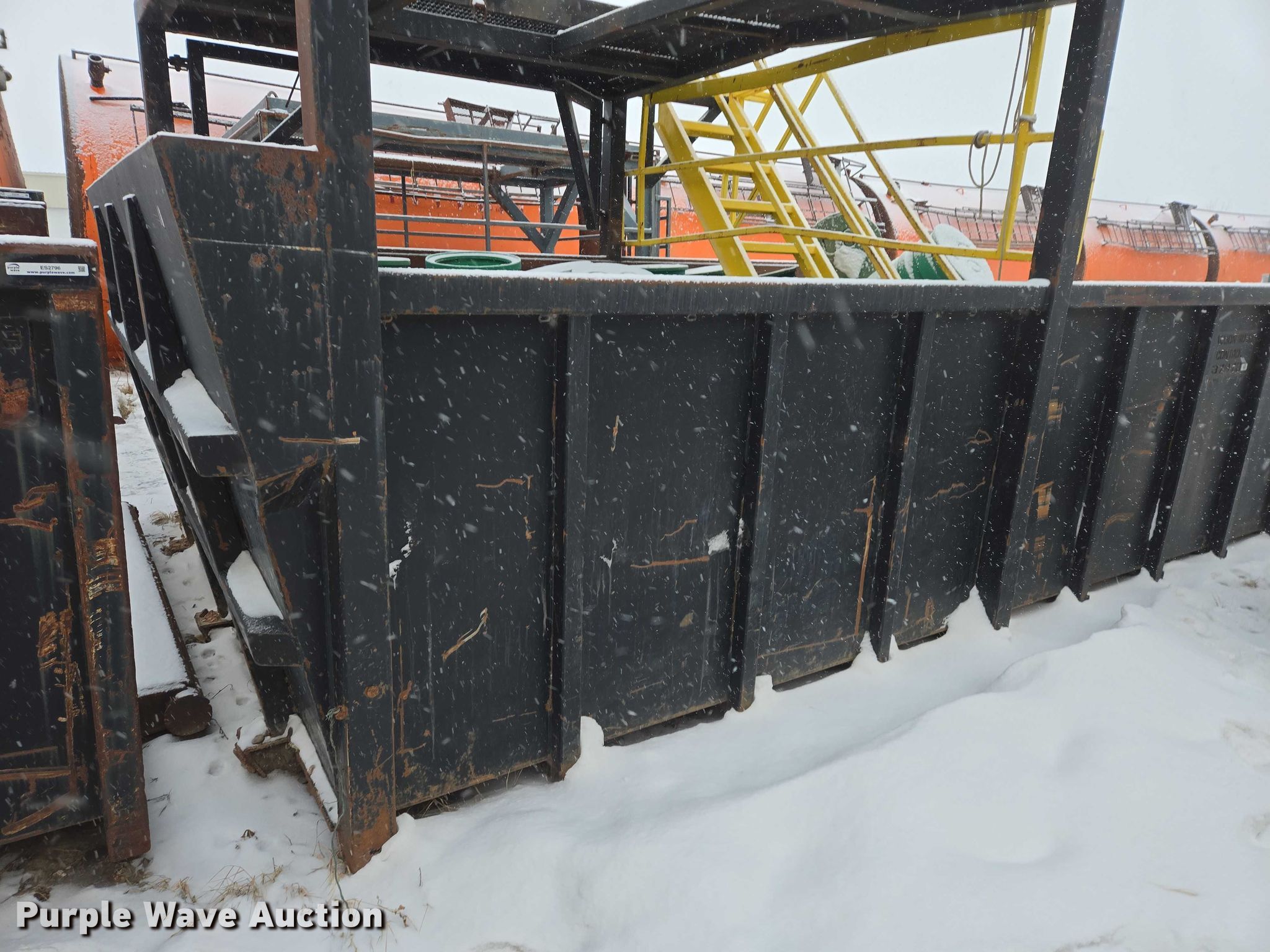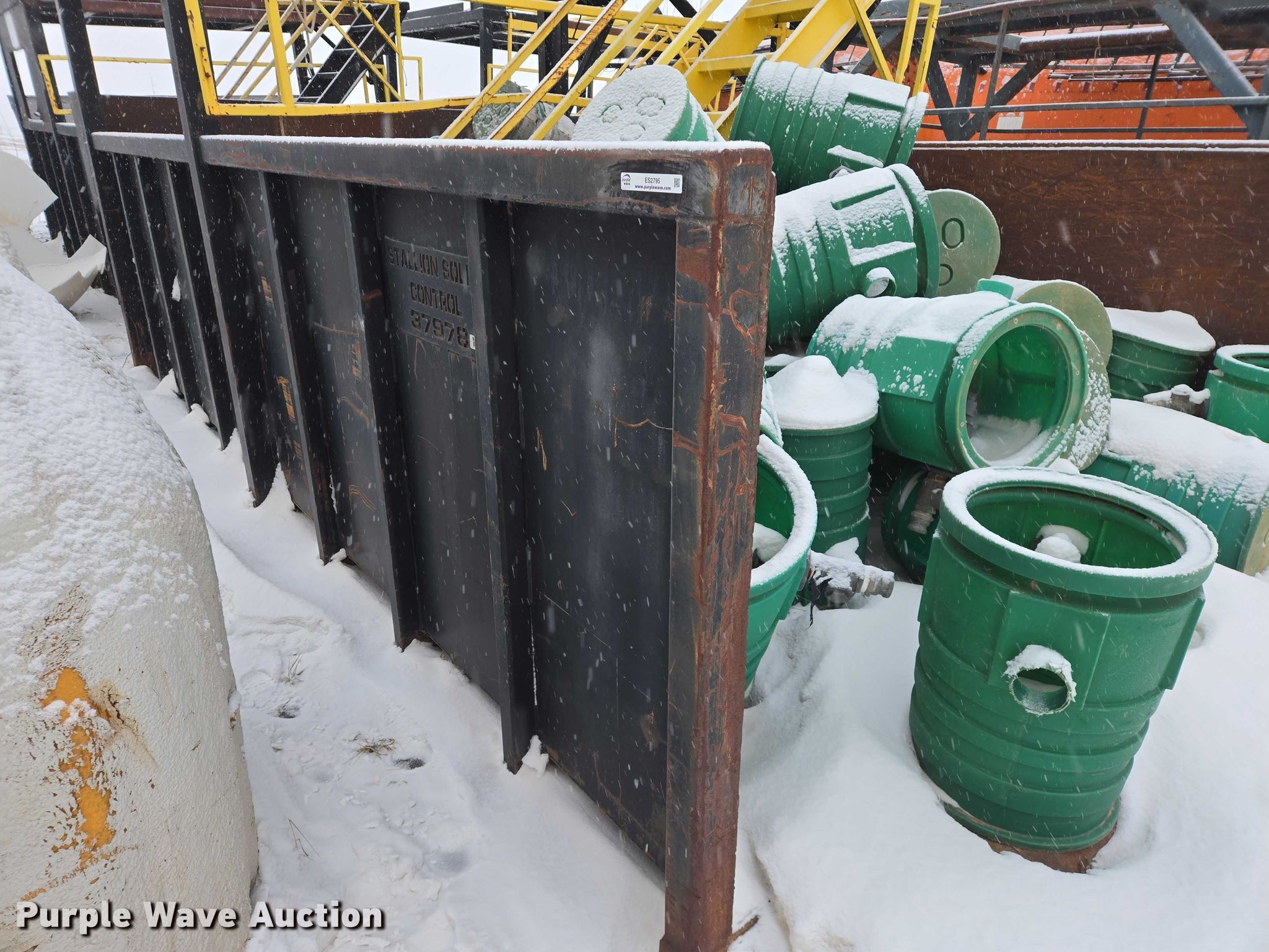 Roll-off container. Unit #: 37978. Dimensions Overall Length: 21', Width: 11' 11", Height: 64". Features Platform 11' 11"W x 10'L x 9'5"H, Skid mounted. Notes Barrels will be removed prior to auction date. Stallion Infrastructure Services. Williston, ND 58801