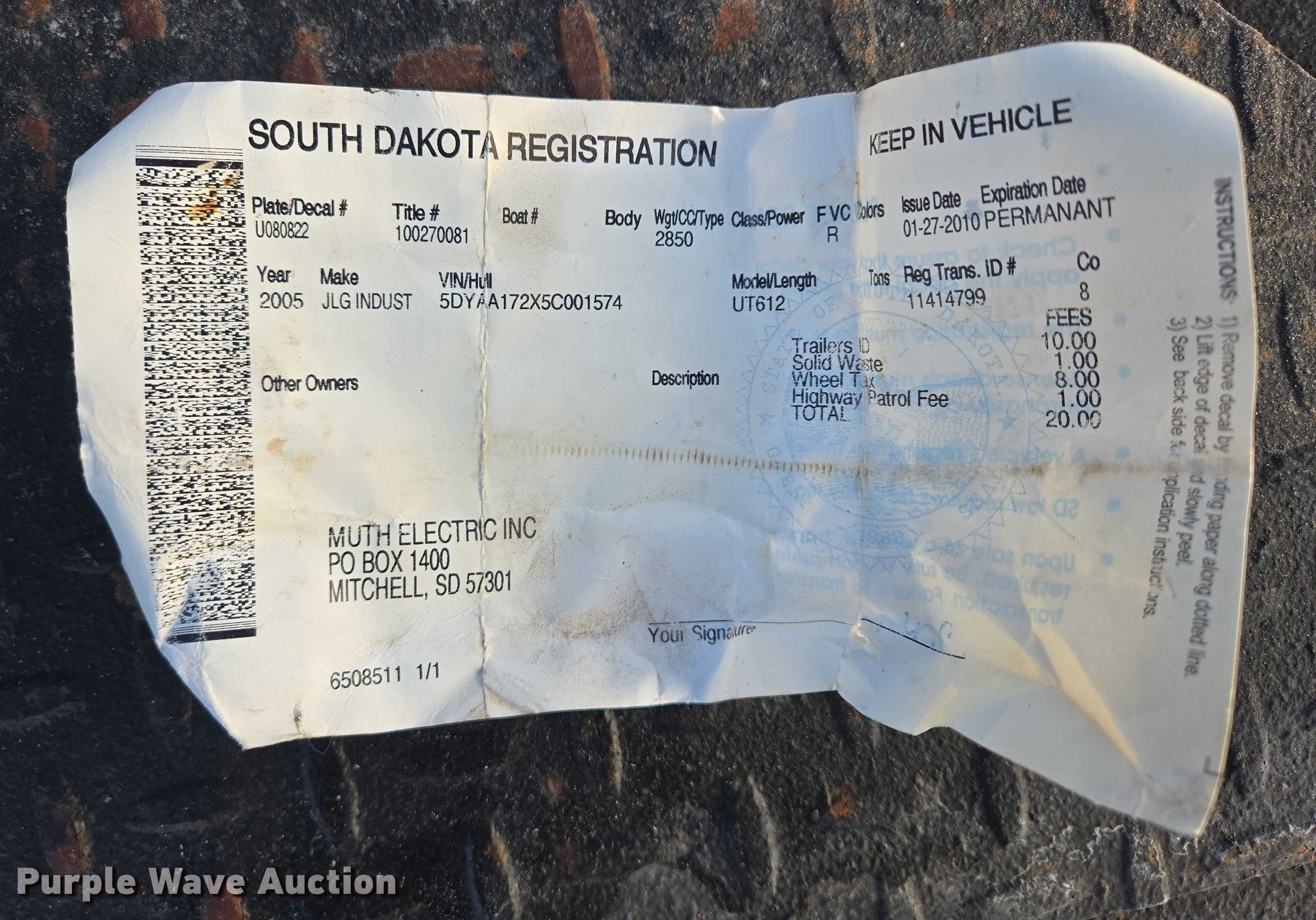 2005 JLG utility trailer. VIN: 5DYAA172X5C001574, Unit #: C975T. Dimensions Overall Length: 17' 6", Width: 100", Deck Length: 10' 8", Width: 75", Side height: 24". Features Deck type: Steel. Chassis Ball hitch: 2 5/16", Landing gear: Single, Suspension: Spring, Brakes: Electric, Axles: Tandem. Tires Steel wheels, Size: 225/75R15. Notes Rust damage, Possible axle damage. South Dakota title. Title distribution may be delayed up to 14 days from verification of funds. Muth Electric. Box Elder, SD 57719