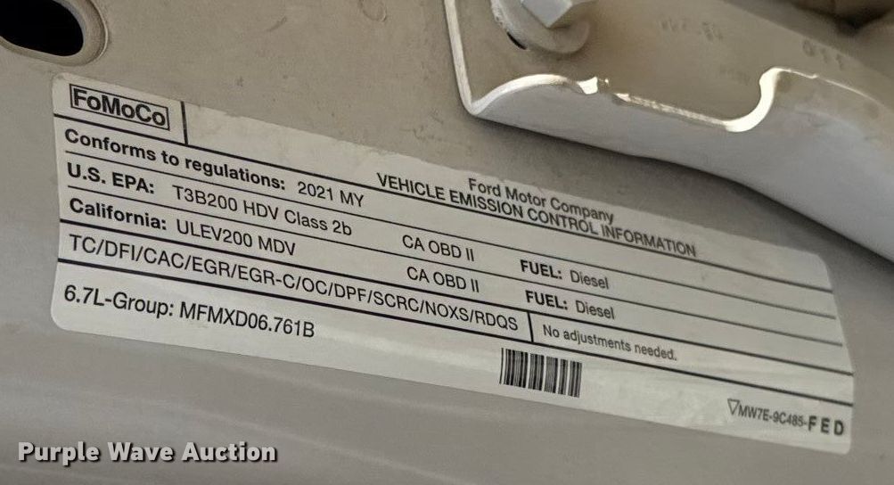 2021 Ford F250 Super Duty Crew Cab pickup truck. Miles: 173,651 on odometer, VIN: 1FT7W2BT3MED05534. Engine Displacement: 6.7L, Cylinders: 8, Fuel type: Diesel. Transmission Automatic, Four wheel drive. Interior AC, Heat, Heated mirrors, Power windows, Power locks, Cruise control, Backup camera, Brake controller. Tires Size: LT295/70R18. Notes Service records available, mailing to PW, Windshield chipped or cracked, Right brake light damaged. Cherokee Nation title. Title distribution may be delayed up to 14 days from verification of funds. Green Country Powerline Constr. Henryetta, OK 74437
