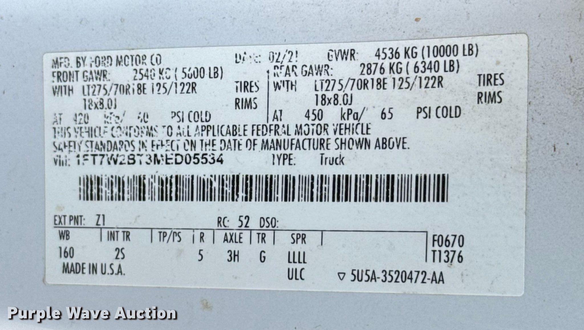 Purple Wave is selling a used 3/4 or 1 Ton Pickup or Van in Oklahoma. This item is a 2021 Ford F250 Super Duty Crew Cab pickup truck with the following: Miles: 173,651 on odometer, VIN: 1FT7W2BT3MED05534