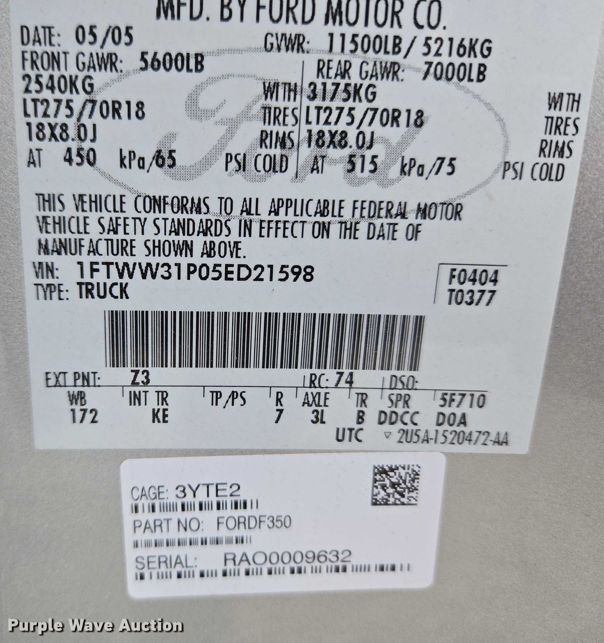 - VIN: 1FTWW31P05ED21598