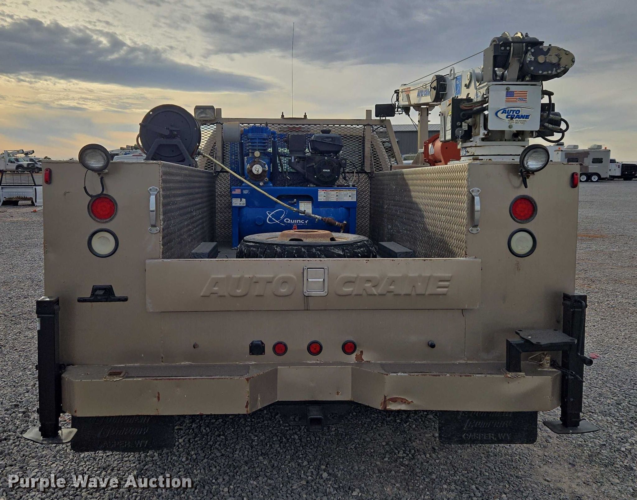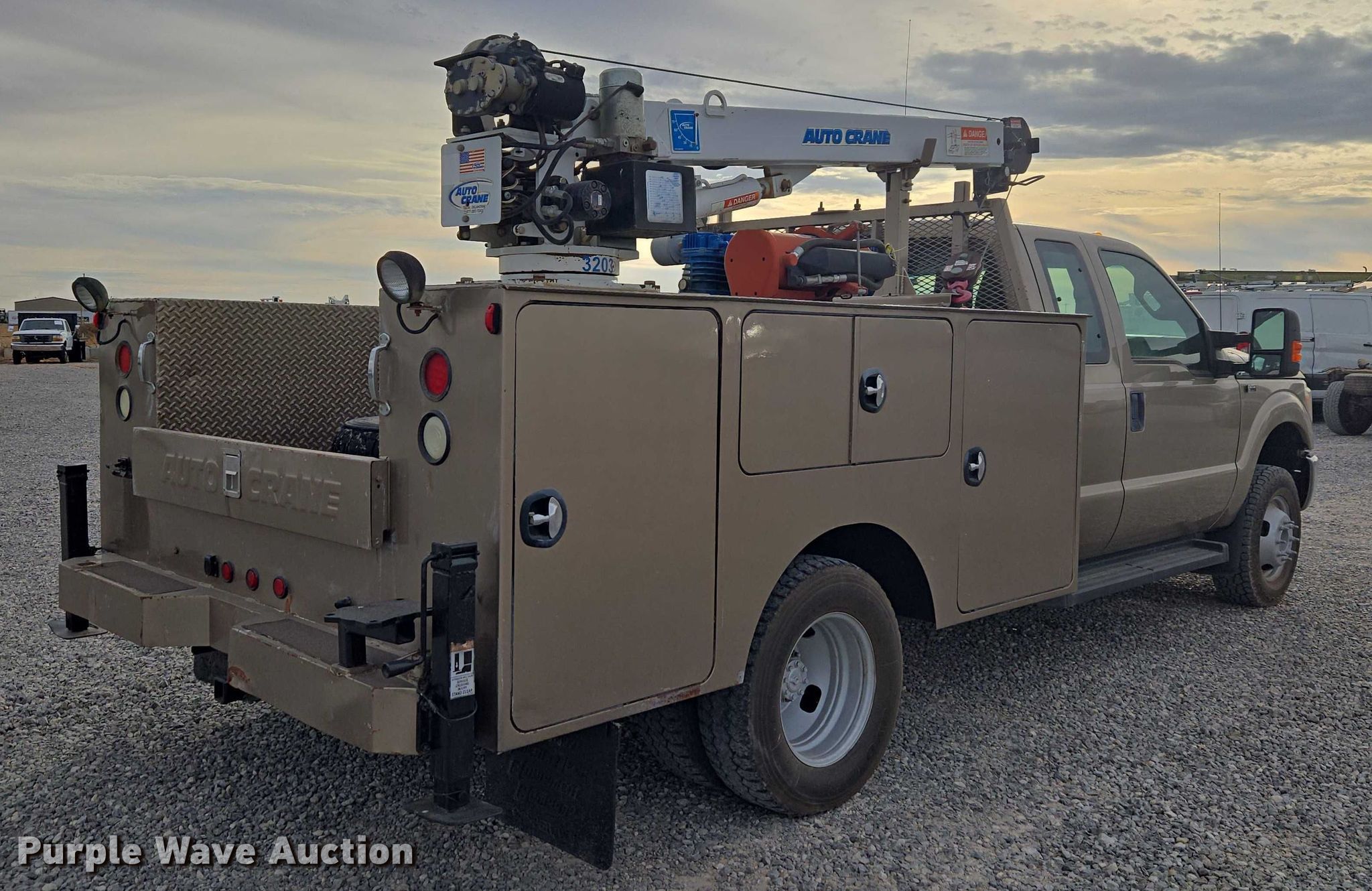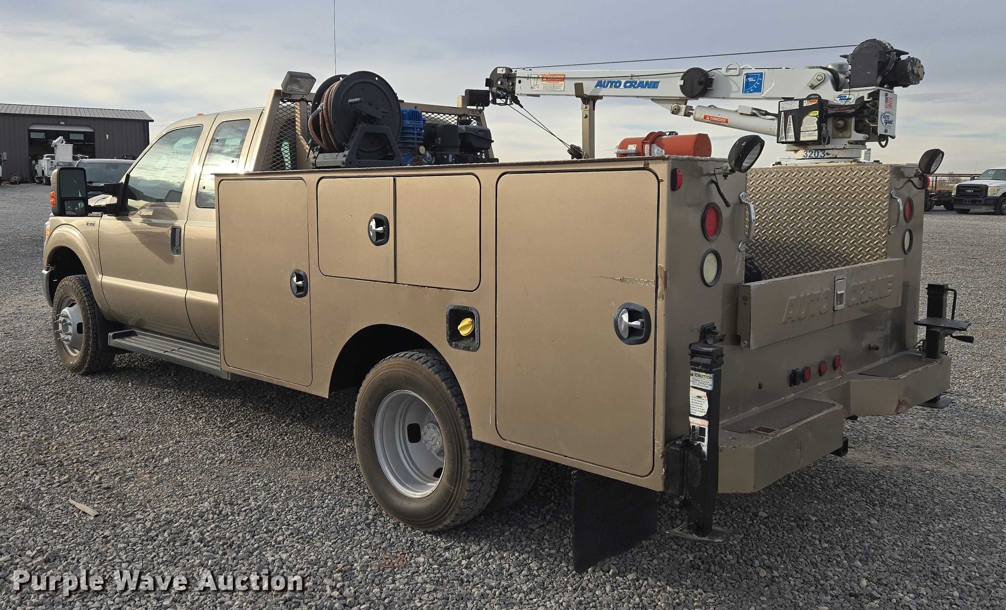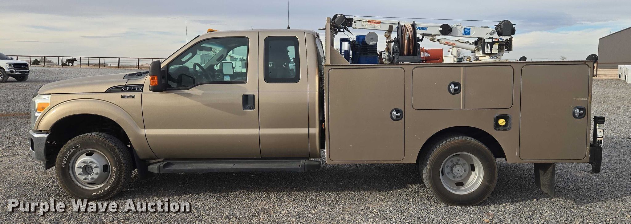 2012 Ford F350 Ext. Cab utility bed pickup truck. Miles: 171,337 on odometer, VIN: 1FD8X3H66CEC15684. Engine Displacement: 6.2L, Cylinders: 8, Fuel type: Gas. Transmission Automatic. Chassis Four wheel drive. Interior AC, Heat, Heated mirrors, Power windows, Power locks, Cruise control, Auxiliary controls. Features Bed Utility bed, Length: 9' 9", Width: 8', Air compressor Quincy Compressor QPG-14K-30AM Kohler, Kohler, Oil/lube system Hose reels, Crane Auto Crane 3203, Maximum boom length: 16' Maximum lift capacity: 3,200 lbs.. Tires Size: LT245/75R17. Notes Hail damage, Air compressor issues, Carburetor issues, Oil leak. Oklahoma title. Seller is an Oklahoma licensed motor vehicle dealer. Buyers may be required to provide identification to the licensed dealer to comply with state laws. Title will be assigned and distributed by the dealer. Please contact the seller for distribution questions. Title distribution may be delayed up to 14 days from verification of funds. FWAuto Remarketing LLC. Yukon, OK 73099