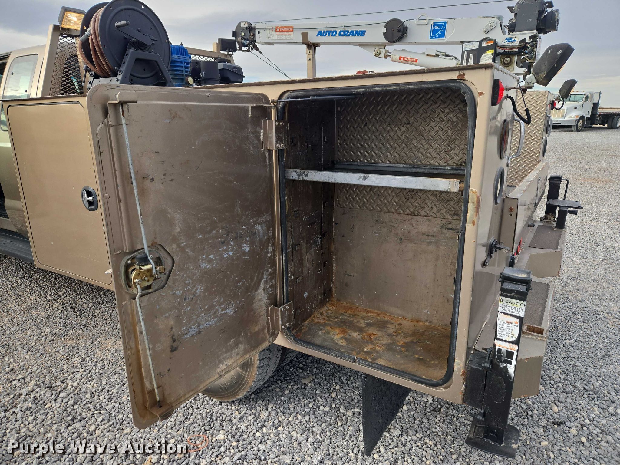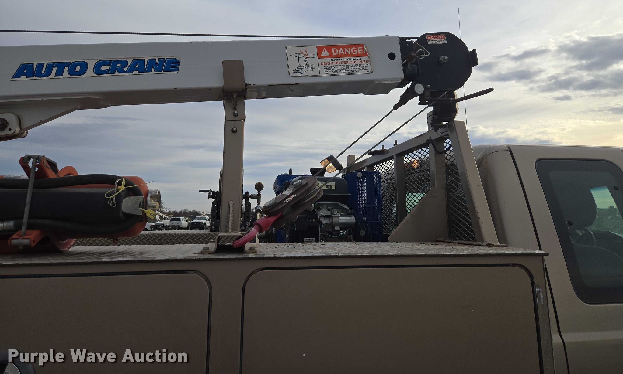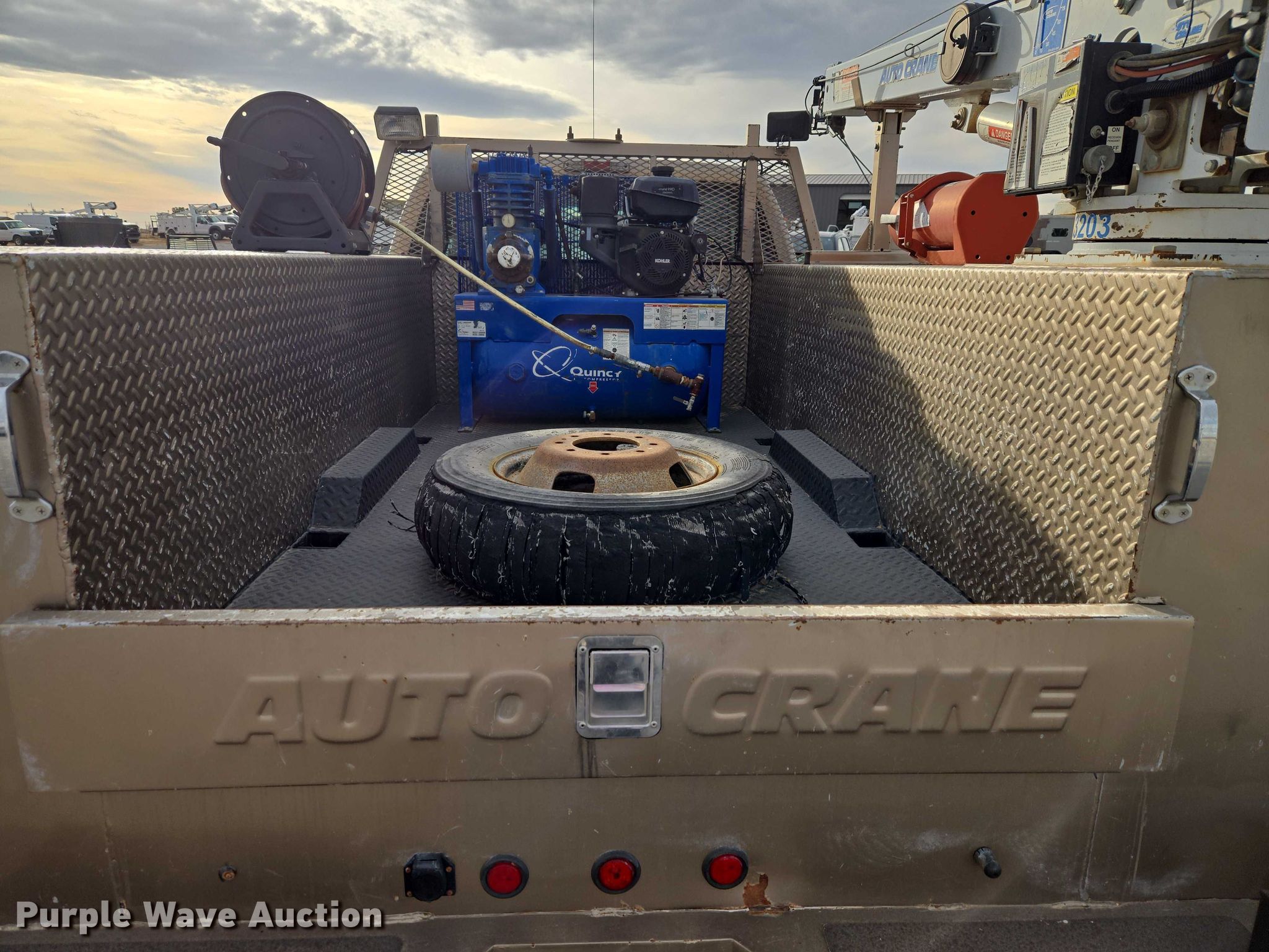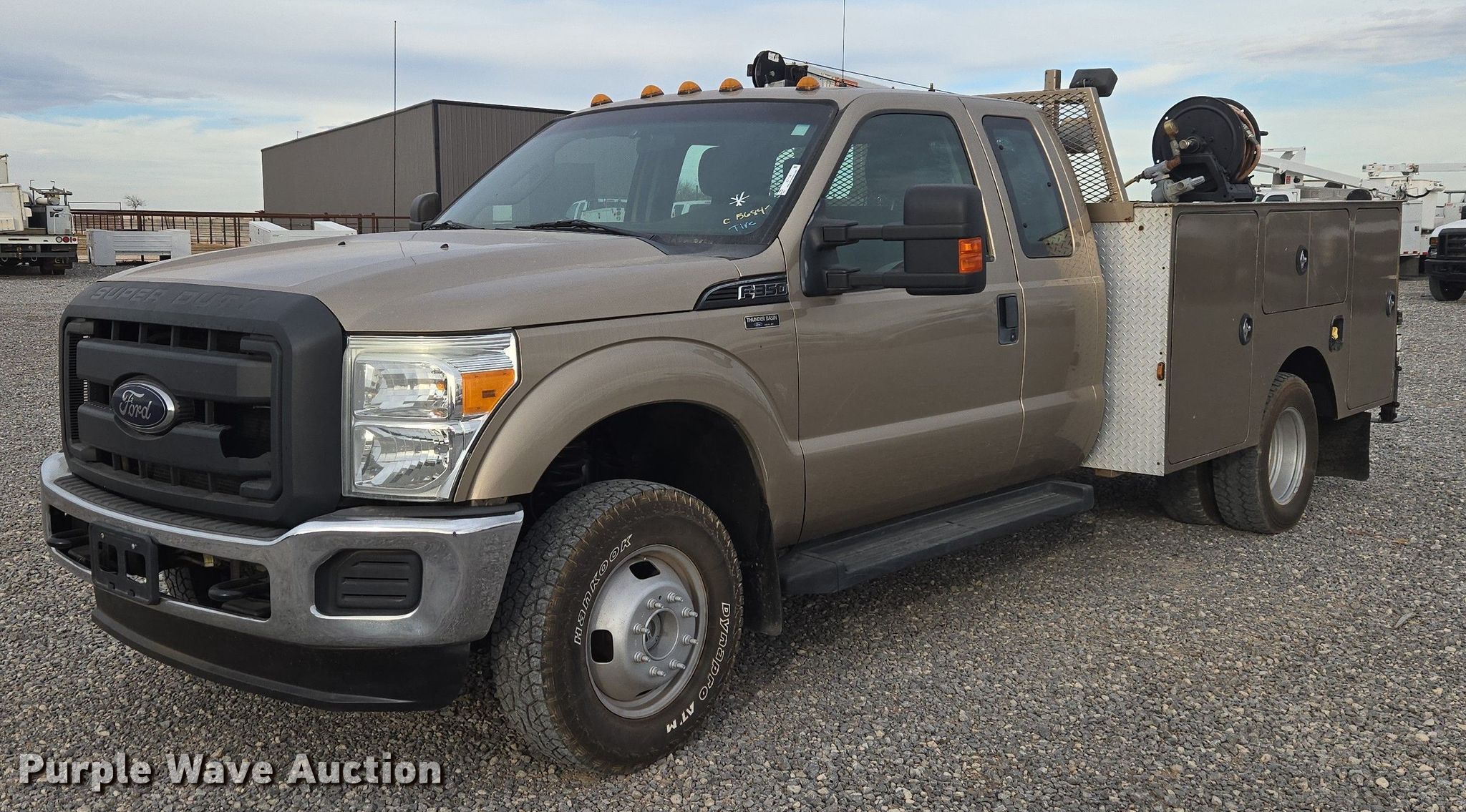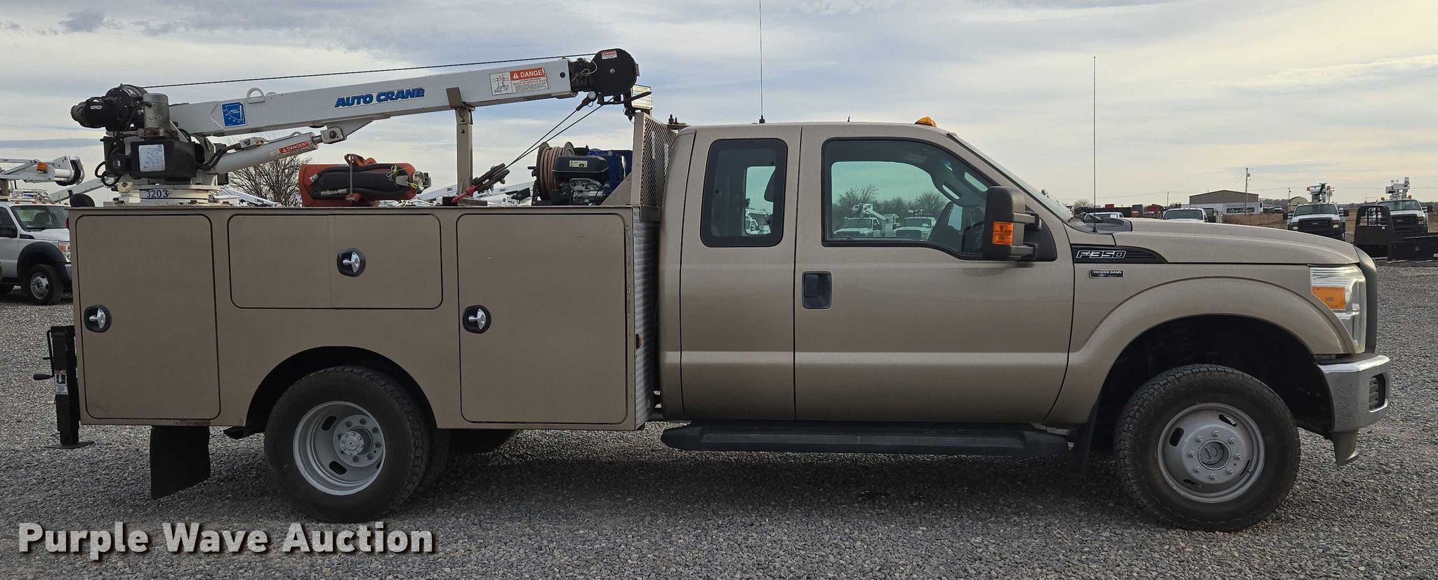2012 Ford F350 Ext. Cab utility bed pickup truck. Miles: 171,337 on odometer, VIN: 1FD8X3H66CEC15684. Engine Displacement: 6.2L, Cylinders: 8, Fuel type: Gas. Transmission Automatic. Chassis Four wheel drive. Interior AC, Heat, Heated mirrors, Power windows, Power locks, Cruise control, Auxiliary controls. Features Bed Utility bed, Length: 9' 9", Width: 8', Air compressor Quincy Compressor QPG-14K-30AM Kohler, Kohler, Oil/lube system Hose reels, Crane Auto Crane 3203, Maximum boom length: 16' Maximum lift capacity: 3,200 lbs.. Tires Size: LT245/75R17. Notes Hail damage, Air compressor issues, Carburetor issues, Oil leak. Oklahoma title. Seller is an Oklahoma licensed motor vehicle dealer. Buyers may be required to provide identification to the licensed dealer to comply with state laws. Title will be assigned and distributed by the dealer. Please contact the seller for distribution questions. Title distribution may be delayed up to 14 days from verification of funds. FWAuto Remarketing LLC. Yukon, OK 73099