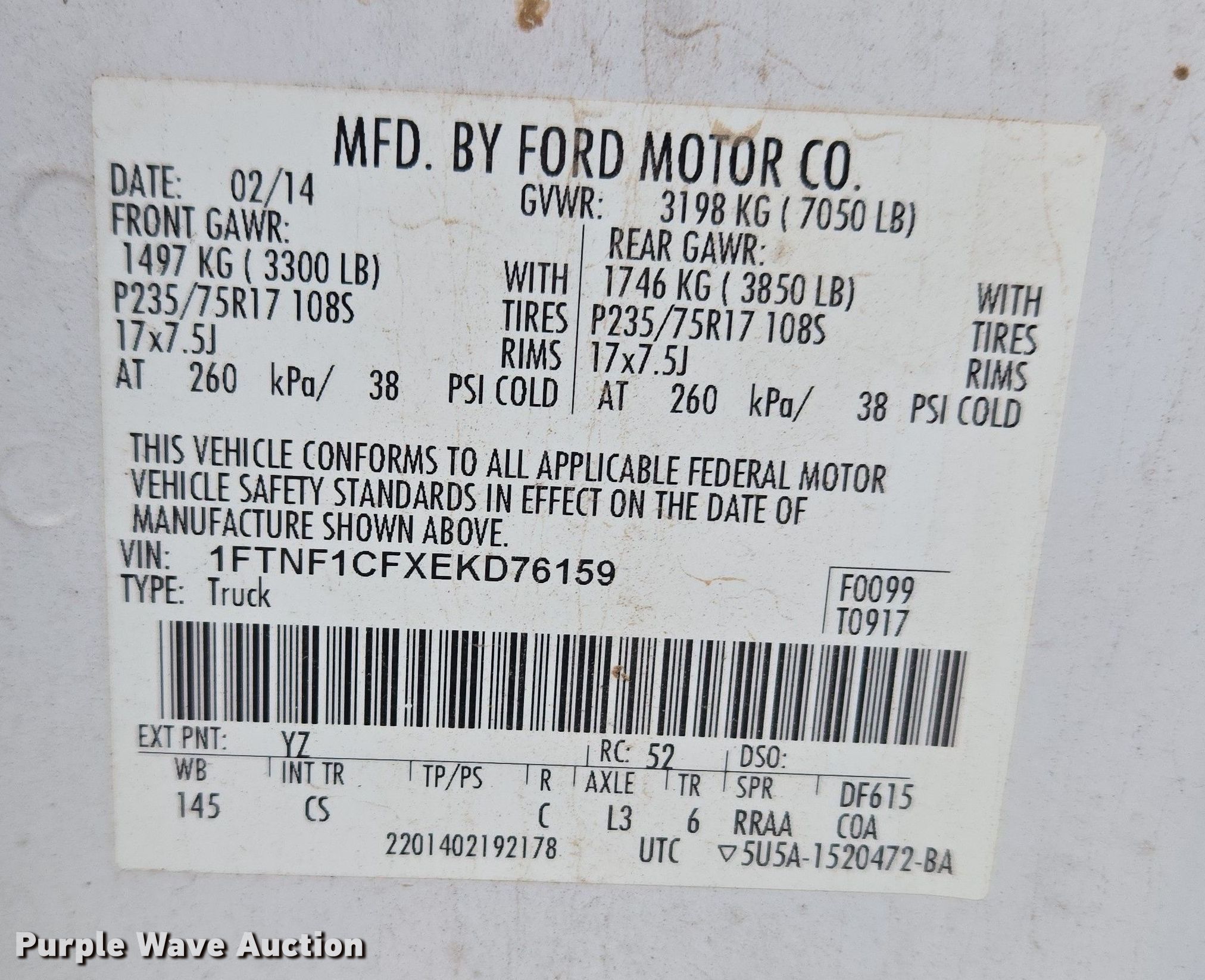 2014 Ford F150 pickup truck. Miles: 210,669 on odometer, VIN: 1FTNF1CFXEKD76159. Engine Displacement: 5.0L, Cylinders: 8, Fuel type: Gas. Transmission Automatic. Interior AC, Heat, Power windows, Power locks, Cruise control, Backup camera, Brake controller. Tires Size: 245/75R17. Notes Windshield chipped or cracked, Jump start required during on-site data collection. Oklahoma title. Title distribution may be delayed up to 30 days from verification of funds. 3700 S Broadway. Edmond, OK 73013