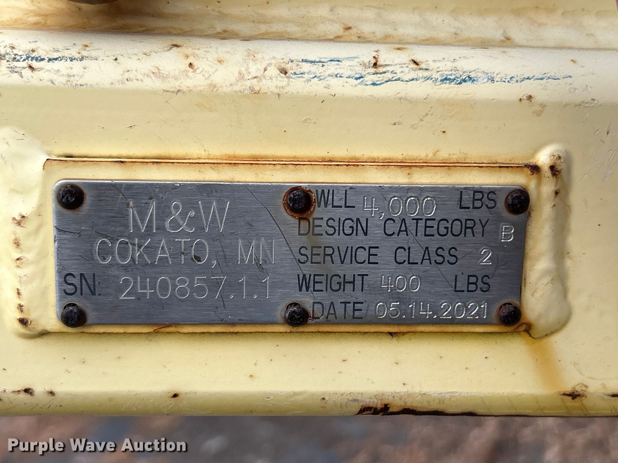 Purple Wave is selling a used Tools in Missouri. This item is a M&W pallet lift with the following: Capacity: 4,000 lbs, Serial: 240857.1.1