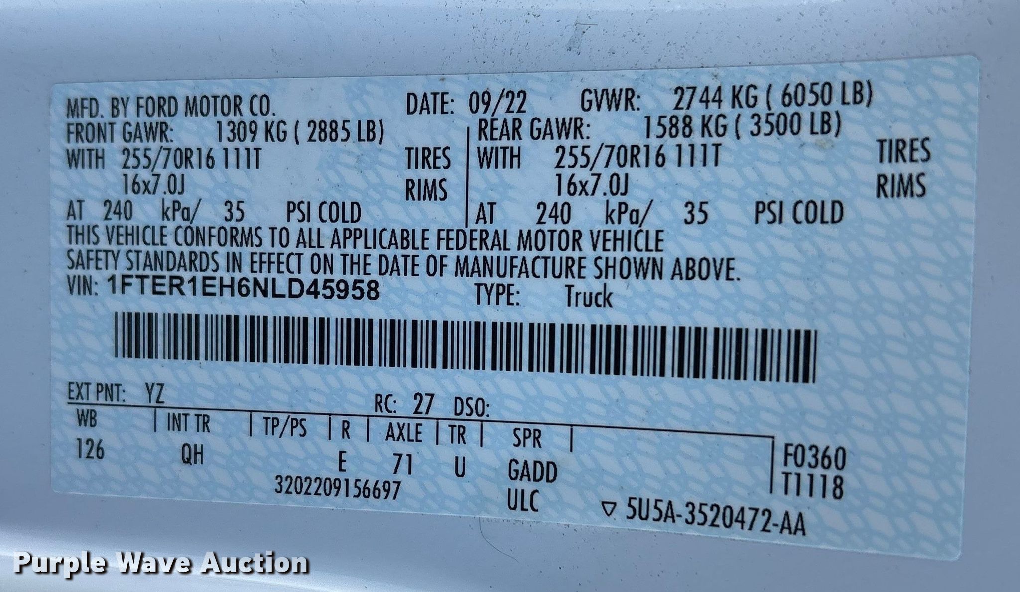 2022 Ford Ranger Ext. Cab pickup truck. Miles: 56,769 on odometer, VIN: 1FTER1EH6NLD45958. Engine Displacement: 2.3L, Cylinders: 4, Fuel type: Gas. Transmission Automatic. Interior AC, Heat, Power windows, Power locks, Cruise control, Backup camera. Features Bed Length: 6', Decked storage system. Tires Size: 255/70R16. Notes Windshield chipped or cracked. Delaware title. Title has a lien that will be released following the close of the auction. Title distribution may be delayed up to 30 days from verification of funds. Compass energy. Laurel, DE 19956