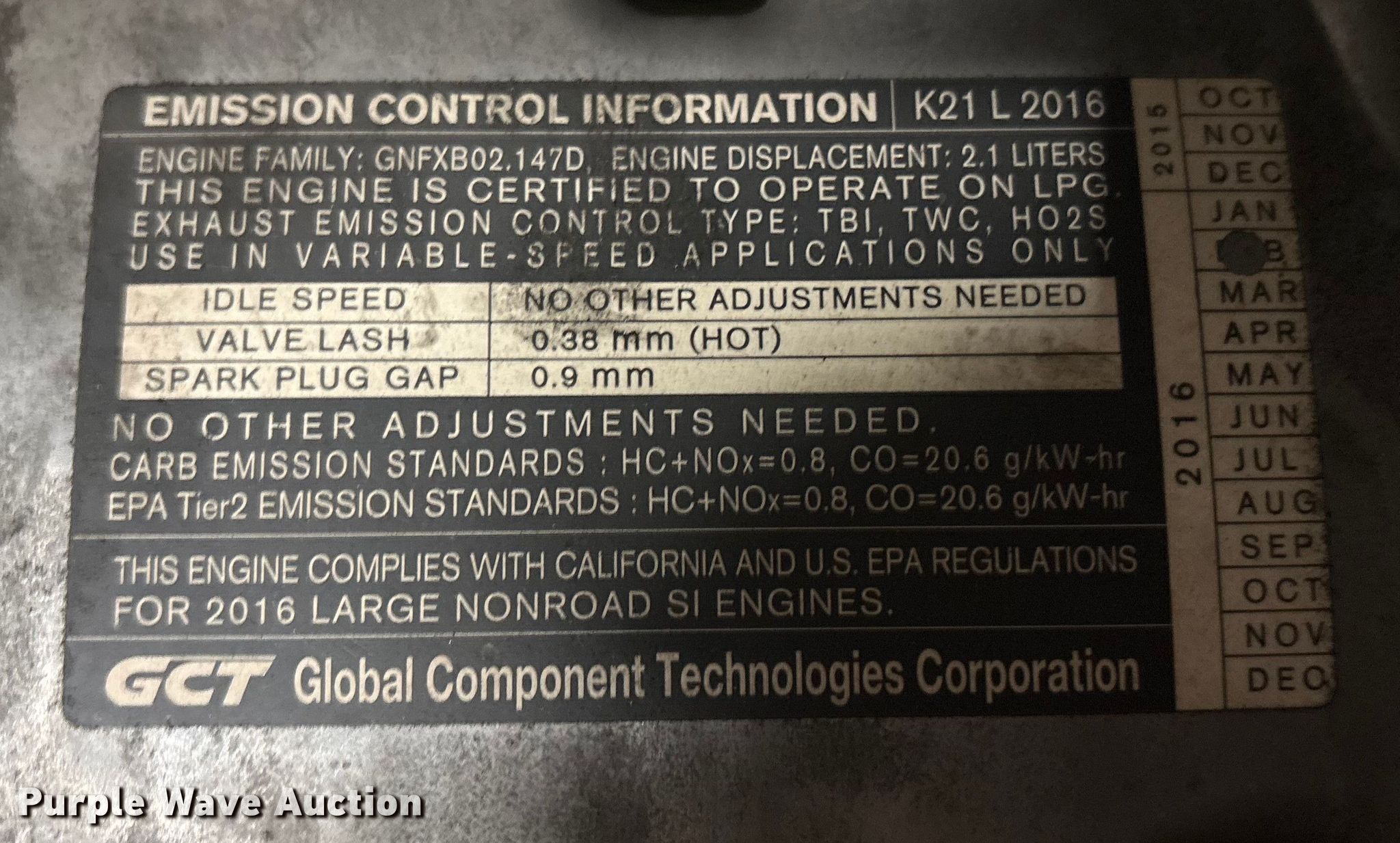 2016 UniCarriers CFS40 forklift. Hours: 4,755 on meter, Serial: CP1F1-9N20329, Unit #: SFS2897. Engine GCT K21L, Displacement: 2.1L, Cylinders: 4, Fuel type: LPG. Transmission Automatic. Operators station Canopy. Features Maximum lift capacity: 3,000 lbs, Maximum lift height: 203", Collapsed mast height: 87", Mast stages: 3, Side shift, Mast tilt, Fork length: 48". Tires Front: 18x6x12 1/8, Rear: 14x5x10, Solid. Notes Warning indicator: Master warning, Battery, Check engine, Oil pressure. Ferguson. Pennsauken, NJ 08110