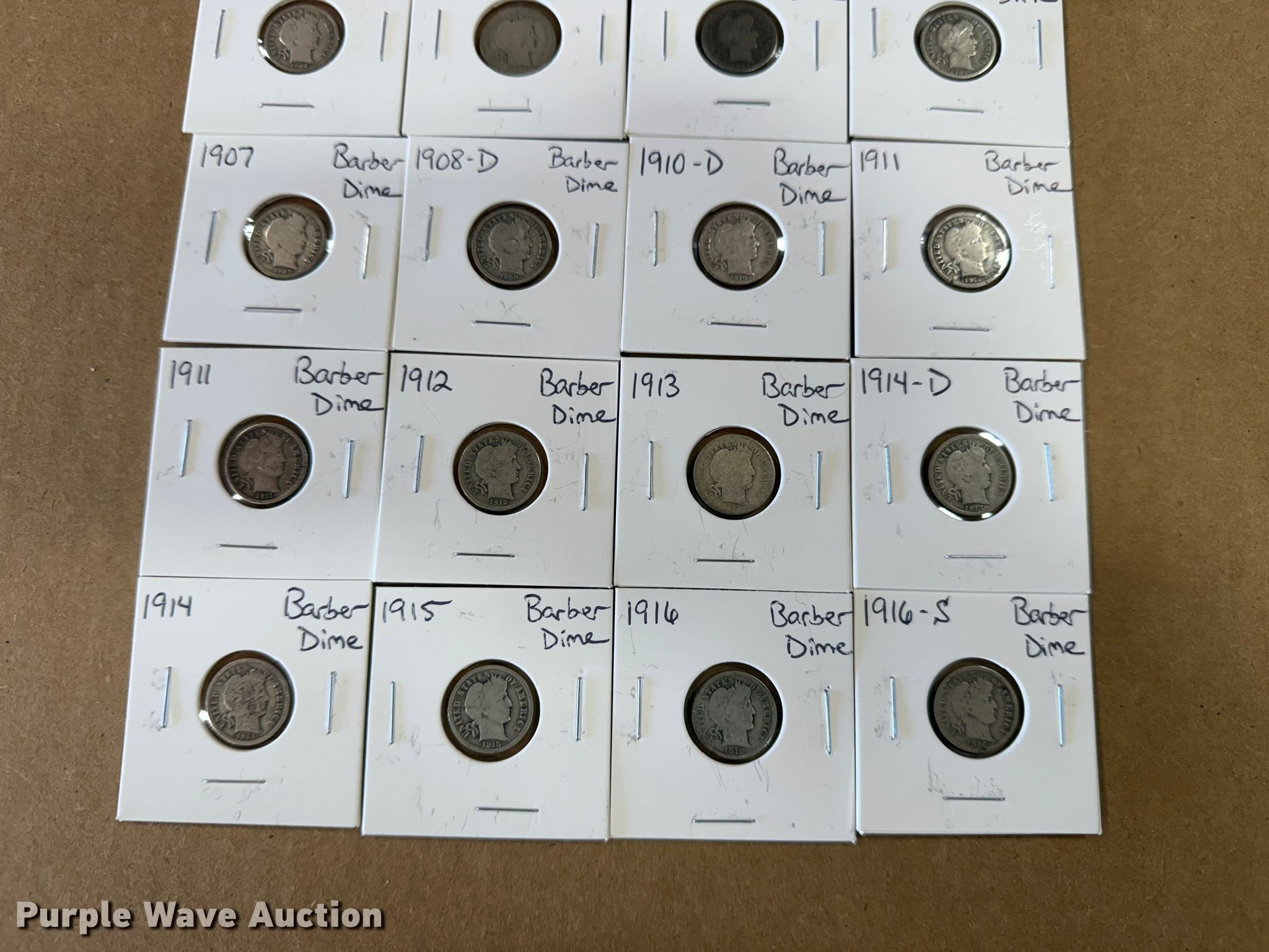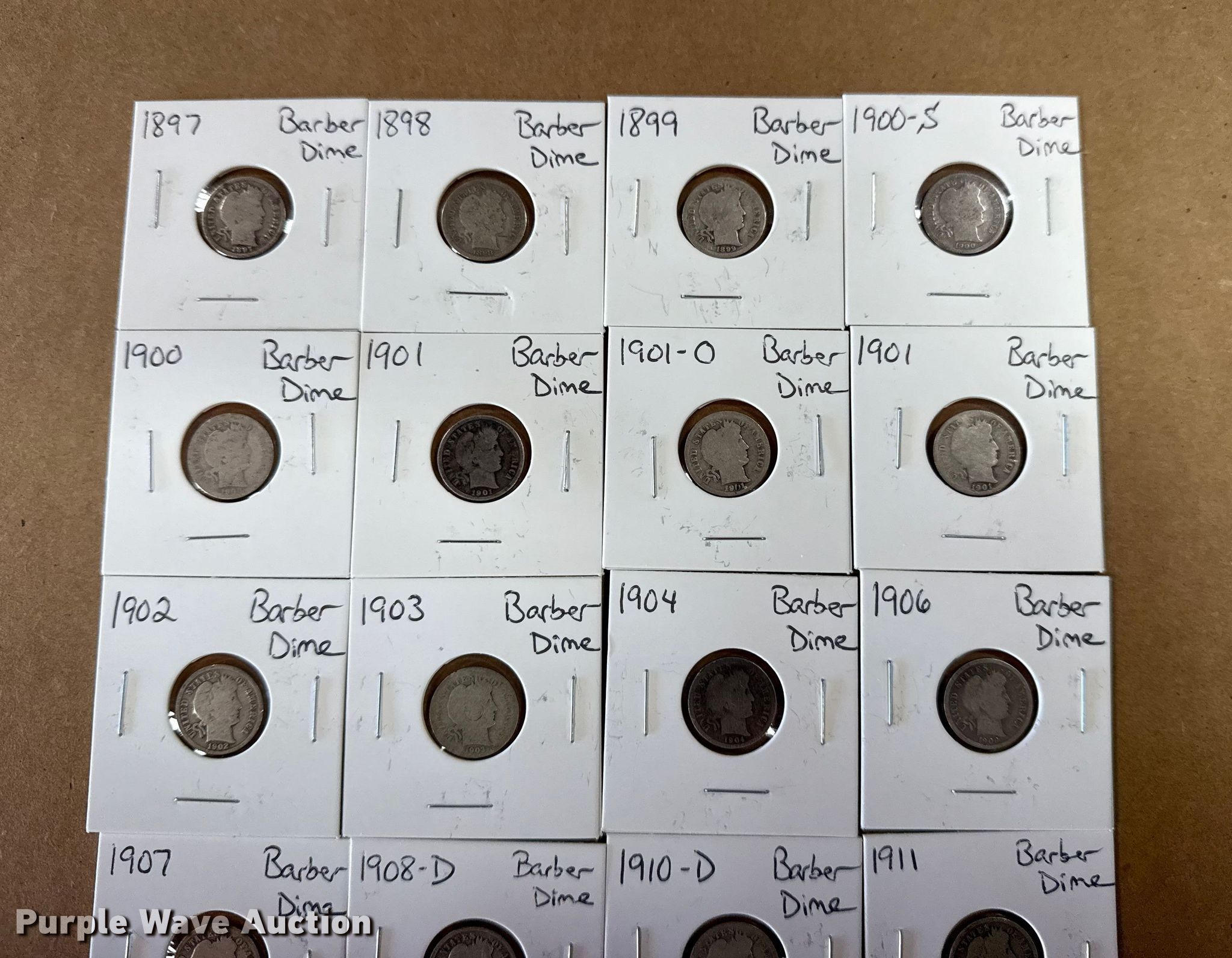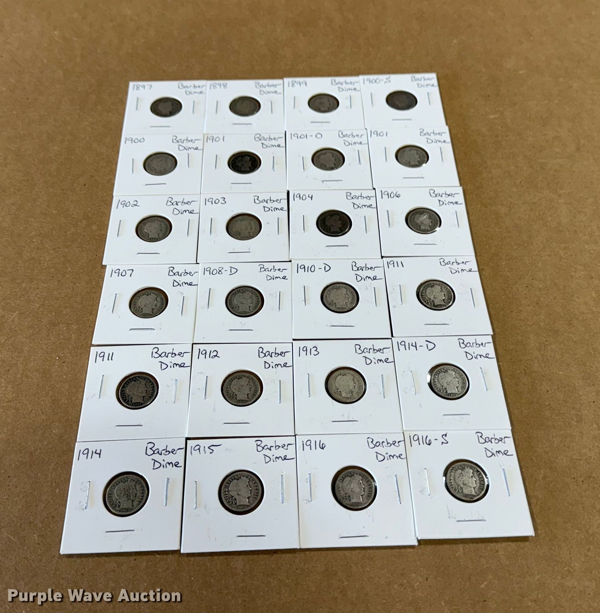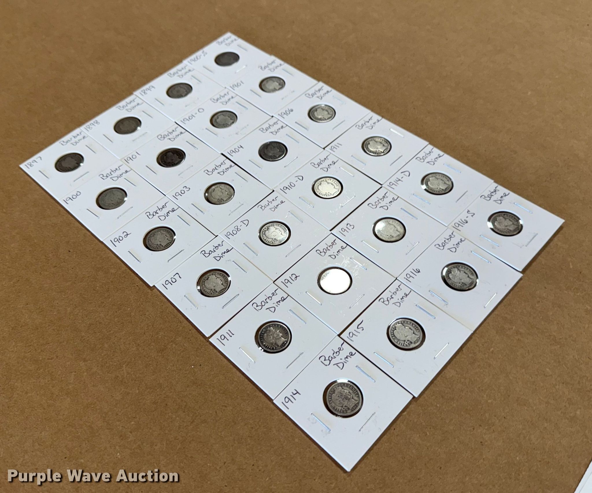 Purple Wave is selling a used Jewelery in Oklahoma. This item is a (24) Silver Barber dimes coins with the following: (24) Silver Barber dimes coins. Authenticity cannot be confirmed. JPSurplus LLC. Dewey, OK 74029