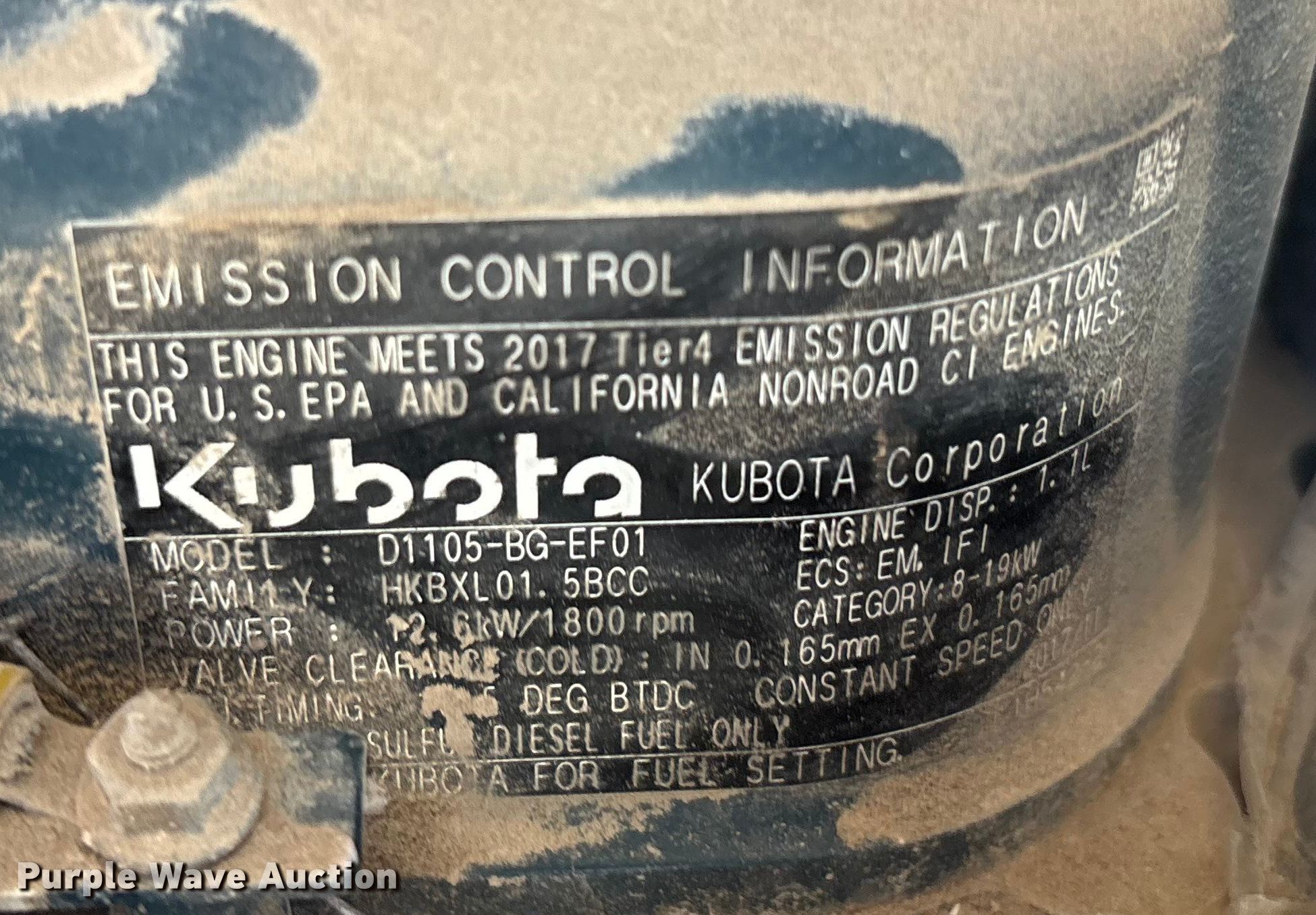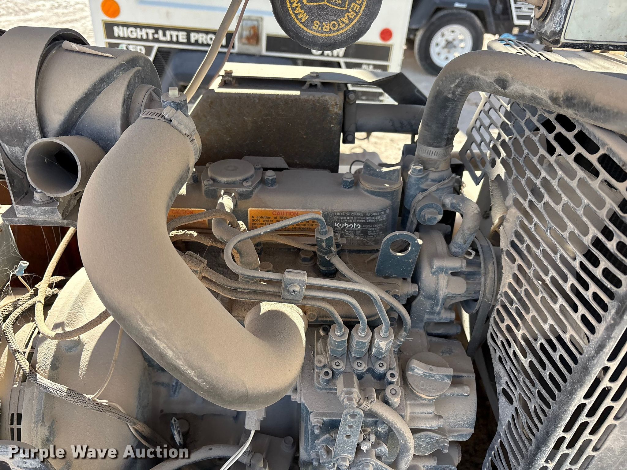 2018 Allmand Bros Inc Night Light Pro 2 V light plant. Hours: 14,744 on meter, VIN: 5AEA1AA16JH000875, Unit #: 46518. Engine Kubota D1105, Displacement: 1.1L, Cylinders: 3, Fuel type: Diesel. Features Generator Pancake 201CSA5420, kW: 8, Light plant Bulbs: 4, Hoist: Power, Stabilizers. Trailer Ball hitch size: 2", Suspension: Spring, Axles: Single, Tire size: ST175/80R13, GVWR: 2,200 lbs. Notes Engine cranks but won't start, Front stabilizers missing, Axle damaged, bent , Unit must be hauled , Unknown operating condition. This is worksite support equipment and will not come with a title. Transfer of ownership documentation will be a bill of sale. Stallion Infrastructure Services. Hobbs, NM 88240