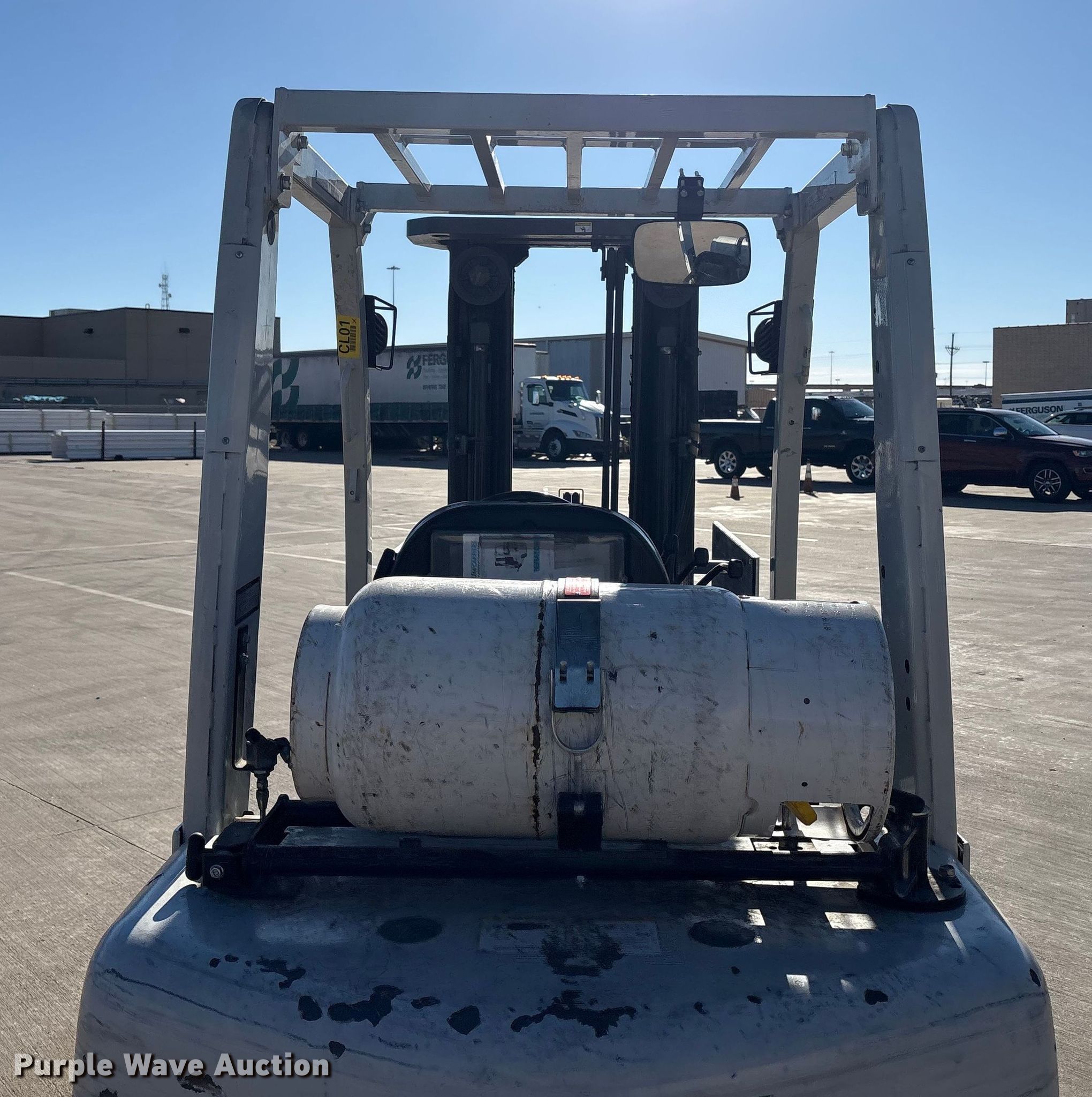 2015 Nissan PF50 forklift. Hours: 4,344 on meter, Miles or hours may vary, unit still in use, Serial: P1F2-9H9946, Unit #: SFS2617. Engine GCT, Displacement: 2.1L, Cylinders: 4, Fuel type: LPG LP bottle: Not included. Transmission Automatic. Operators station OROPS. Features Maximum lift capacity: 2,500 lbs, Maximum lift height: 187", Collapsed mast height: 84", Mast stages: 3, Side shift, Mast tilt, Fork positioner, Carton clamp Length: 47". Tires Front: 7.00-12, Rear: 6.00-9, Solid. Notes Warning indicator: Master warning. Ferguson. Lubbock, TX 79407