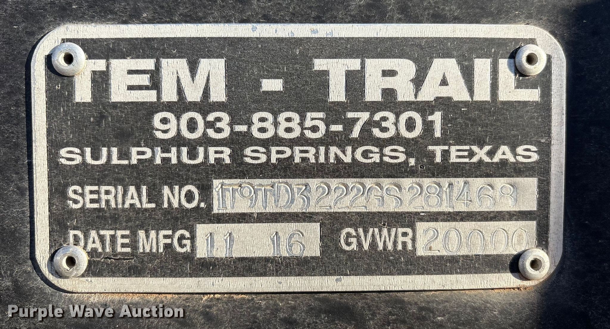 Purple Wave is selling a used Equip. Trailer in Texas. This item is a 2016 TEM equipment trailer with the following: VIN: 1T9TD3222GS281468