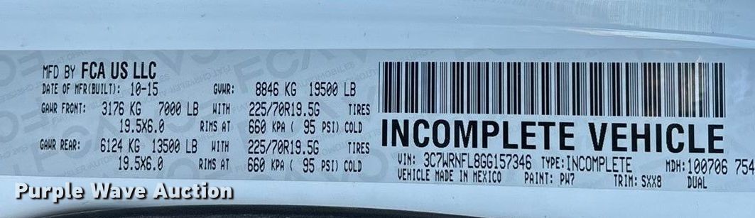 Purple Wave is selling a used Truck Chassis in Texas. This item is a 2016 RAM 5500HD truck cab and chassis with the following: Miles: 132,530 on odometer, Hours: 3,577 on meter, VIN: 3C7WRNFL8GG157346