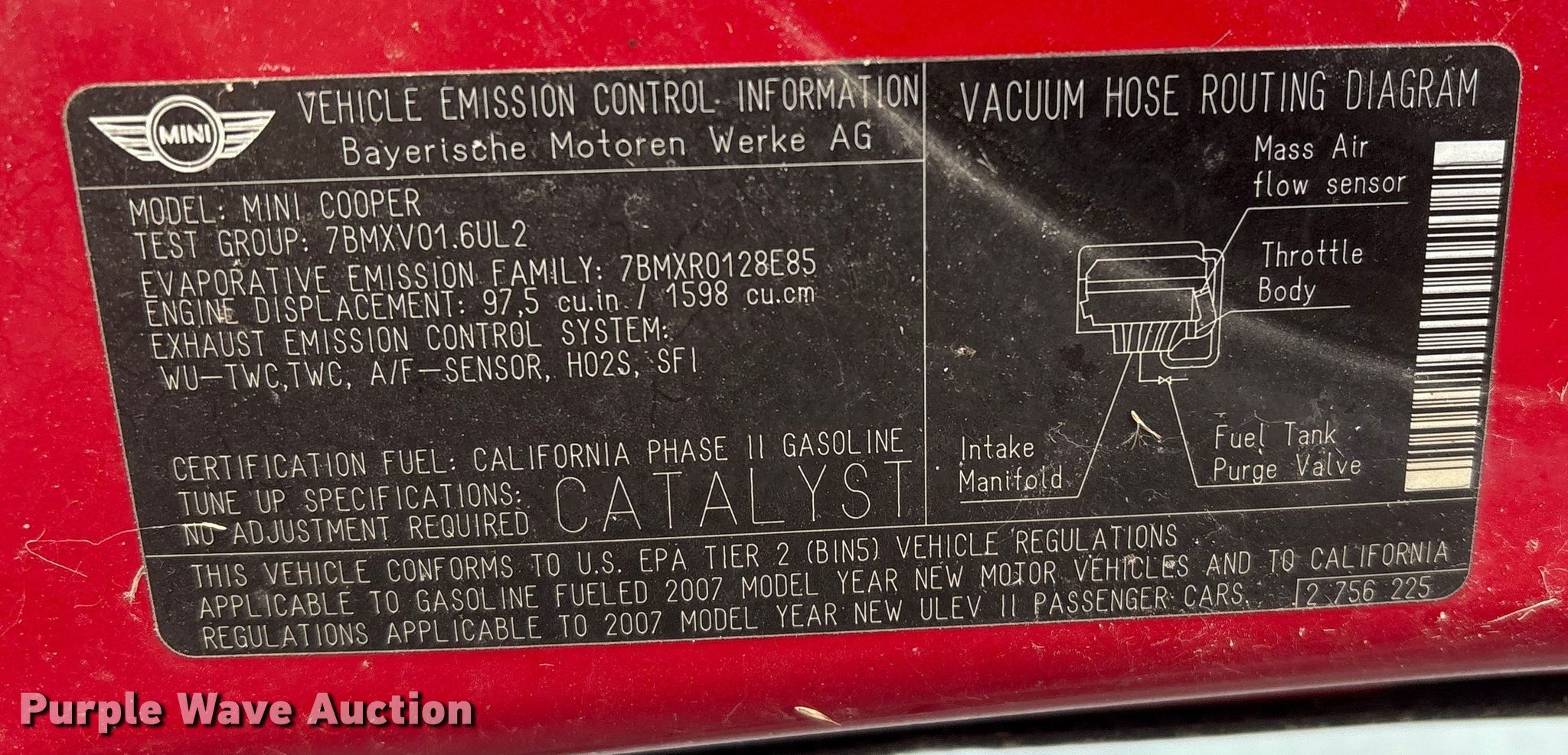 2007 Mini Cooper. Miles: 79,133 on odometer, VIN: WMWMF33587TT57974. Engine Displacement: 1.6L, Cylinders: 4, Fuel type: Gas, HP: 120. Transmission Automatic. Interior AC, Heat, Power windows, Power locks, Cruise control. Tires Size: 175/65R15. Notes Dead battery, Non-operational unit. Kansas title. Hipfl Construction Inc... Frontenac, KS 66763