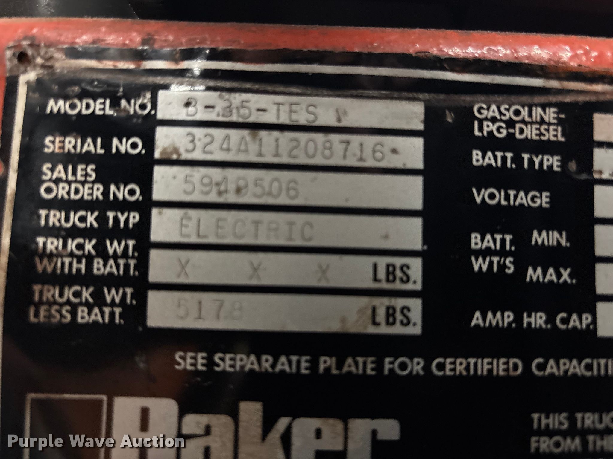 Baker 3-35-TES forklift. Hours: 5,762 on meter, Serial: 324A11208716. Electric Motor Volts: 36. Transmission Electric drive. Operators station Canopy. Features Maximum lift capacity: 4,000 lbs, Collapsed mast height: 81", Mast stages: 3, Side shift, Mast tilt, Fork length: 42". Tires Rear: 15x4.5-8. Notes Weak batteries, Main lift cylinder issues, leaks. Aegis Fire Protection. Lenexa, KS 66215