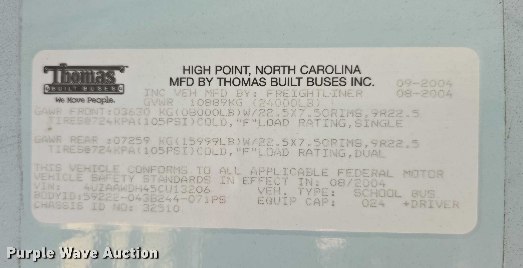 Purple Wave is selling a used Bus in Kansas. This item is a 2005 Freightliner Thomas school bus with the following: Miles: 117,765 on odometer, VIN: 4UZAAWDH45CU13206