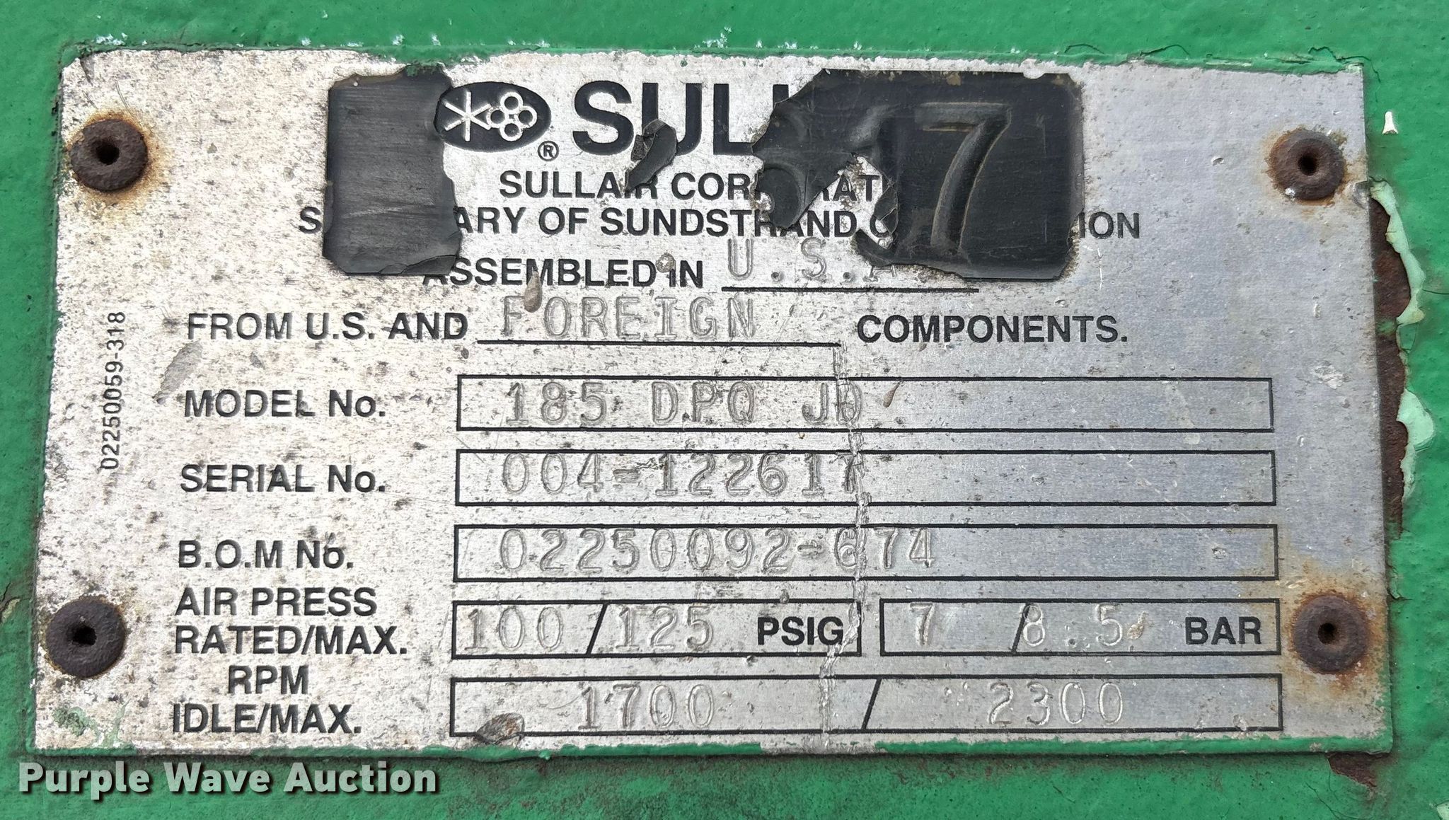 Purple Wave is selling a used Air Compressor in Pennsylvania. This item is a Sullair 185 DPQ JD air compressor with the following: Hours: 1,906 on meter, Serial: 004-122617