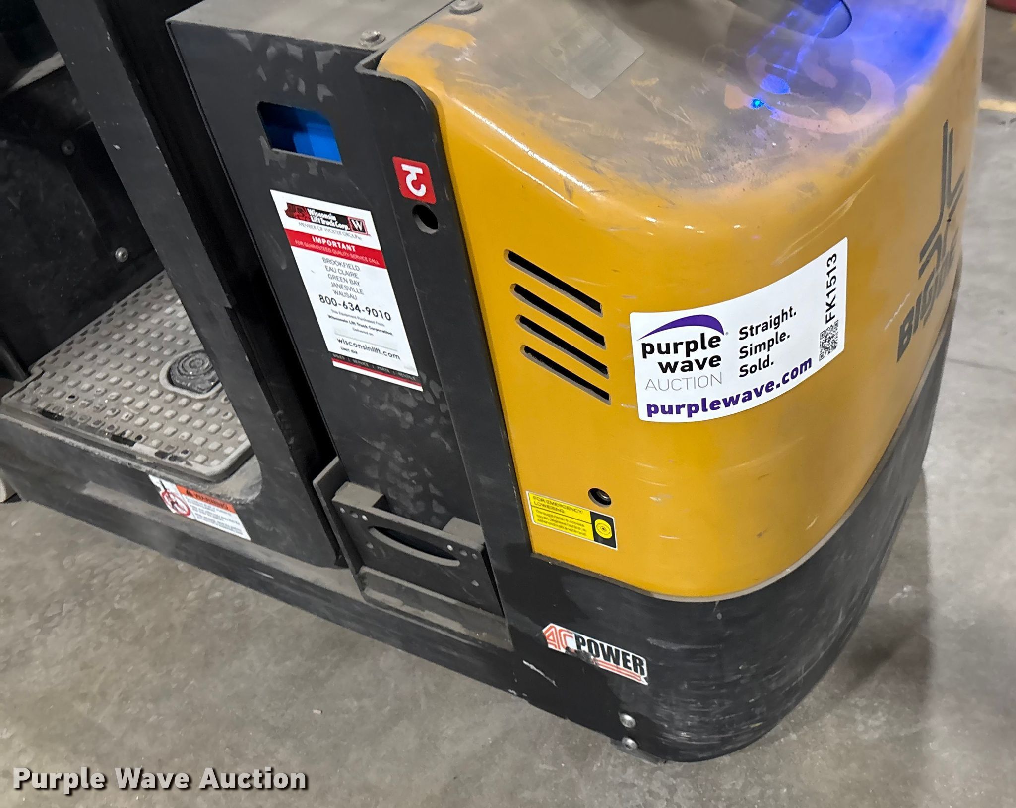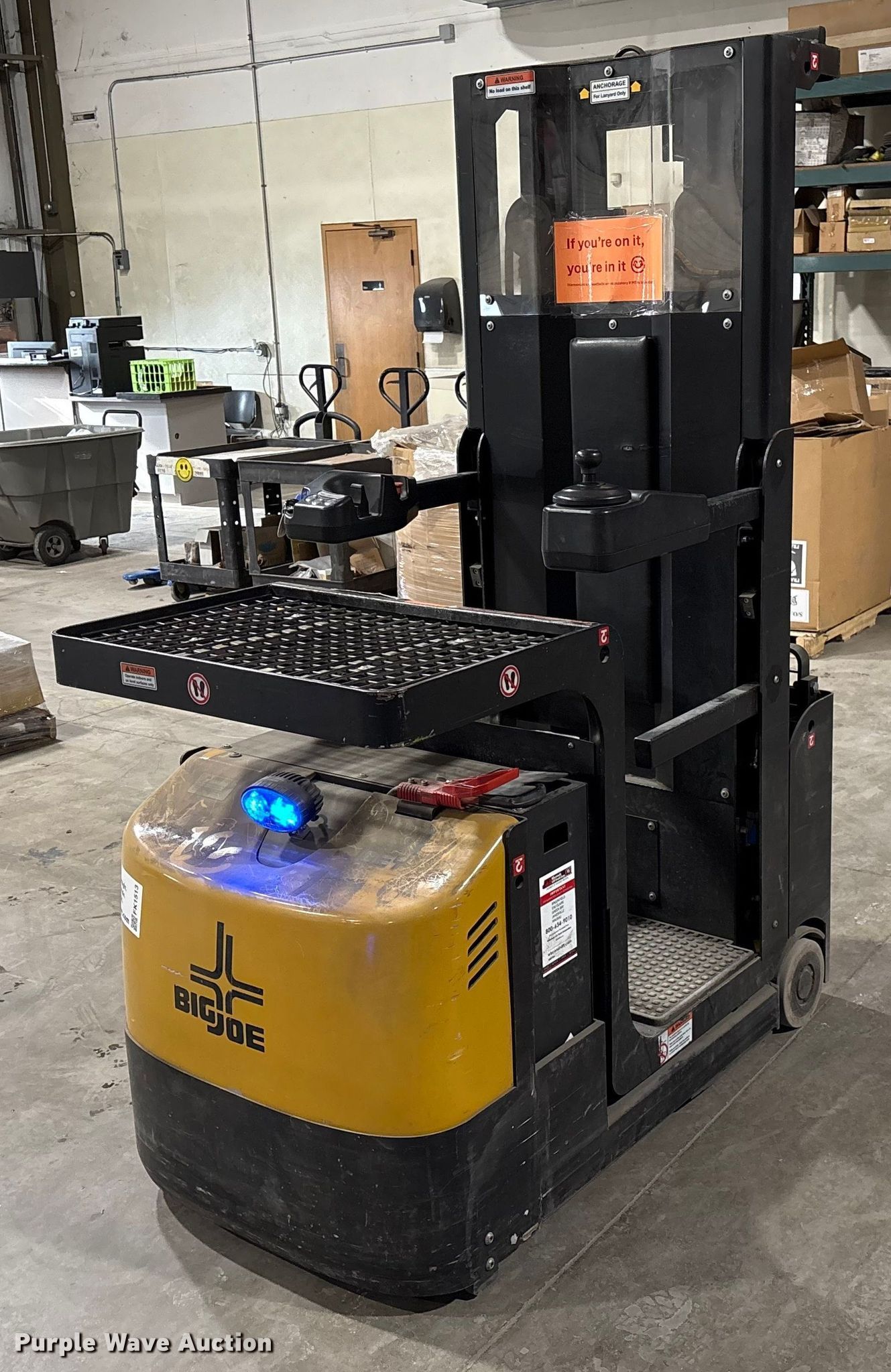 Purple Wave is selling a used Warehouse Forklift in Wisconsin. This item is a 2020 Big Joe J1 order picker with the following: Hours: 427 on meter, Serial: 2282100489, Unit #: SFS1555