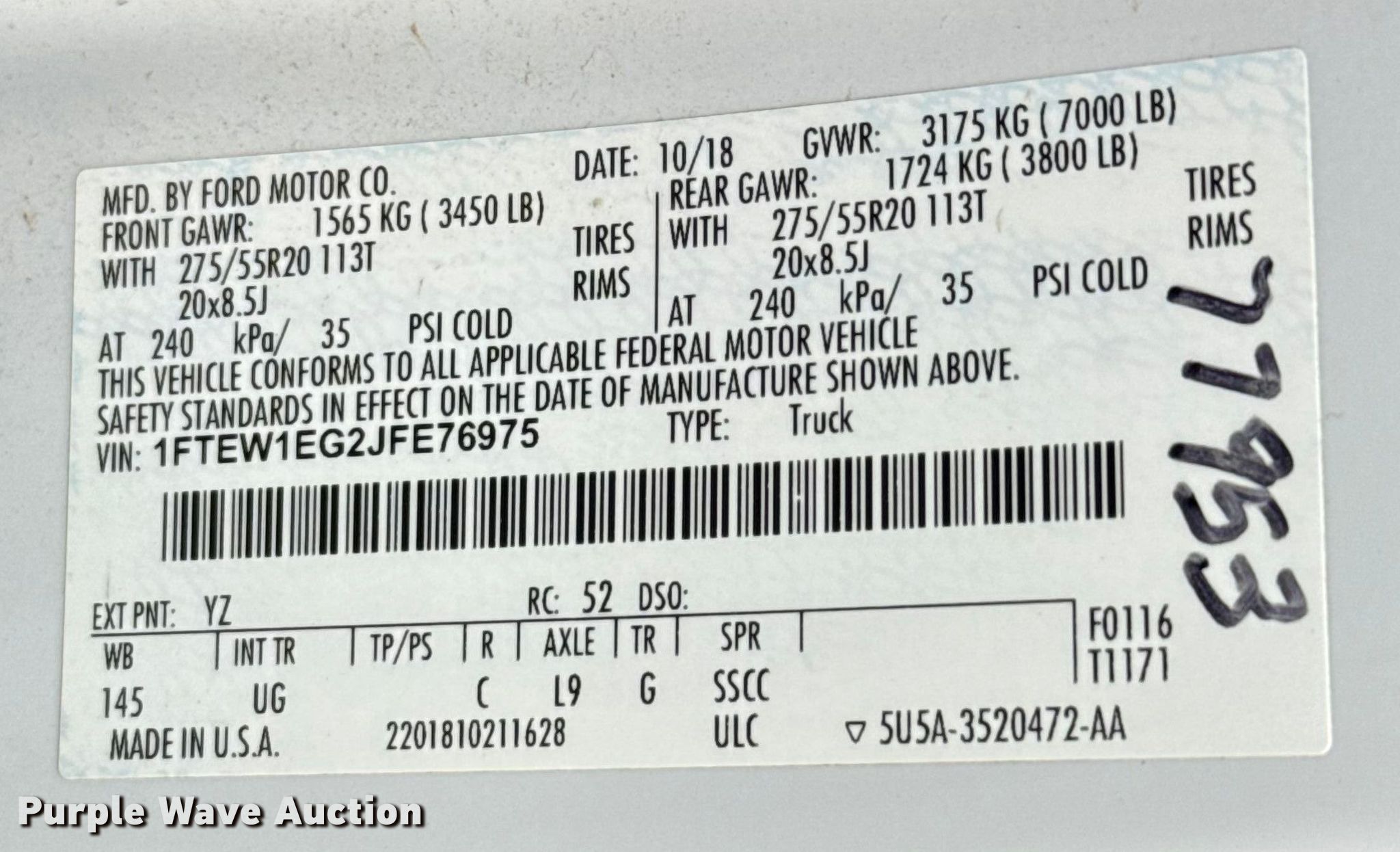 2018 Ford F150 Crew Cab pickup truck. Miles: 181,278 on odometer, VIN: 1FTEW1EG2JFE76975. Engine Displacement: 3.5L, Cylinders: 6, Fuel type: Gas. Transmission Automatic, Four wheel drive. Interior AC, Heat, Seat: Power driver, Power passenger, Heated mirrors, Power windows, Power locks, Cruise control, Backup camera. Tires Size: P275/60R20. Notes Dash warning indicator: Check engine, Airbag, Windshield chipped or cracked. Oklahoma rebuilt salvage title. Title distribution may be delayed up to 30 days from verification of funds. Pintail Oilfield Services, LLC. Guthrie, OK 73044