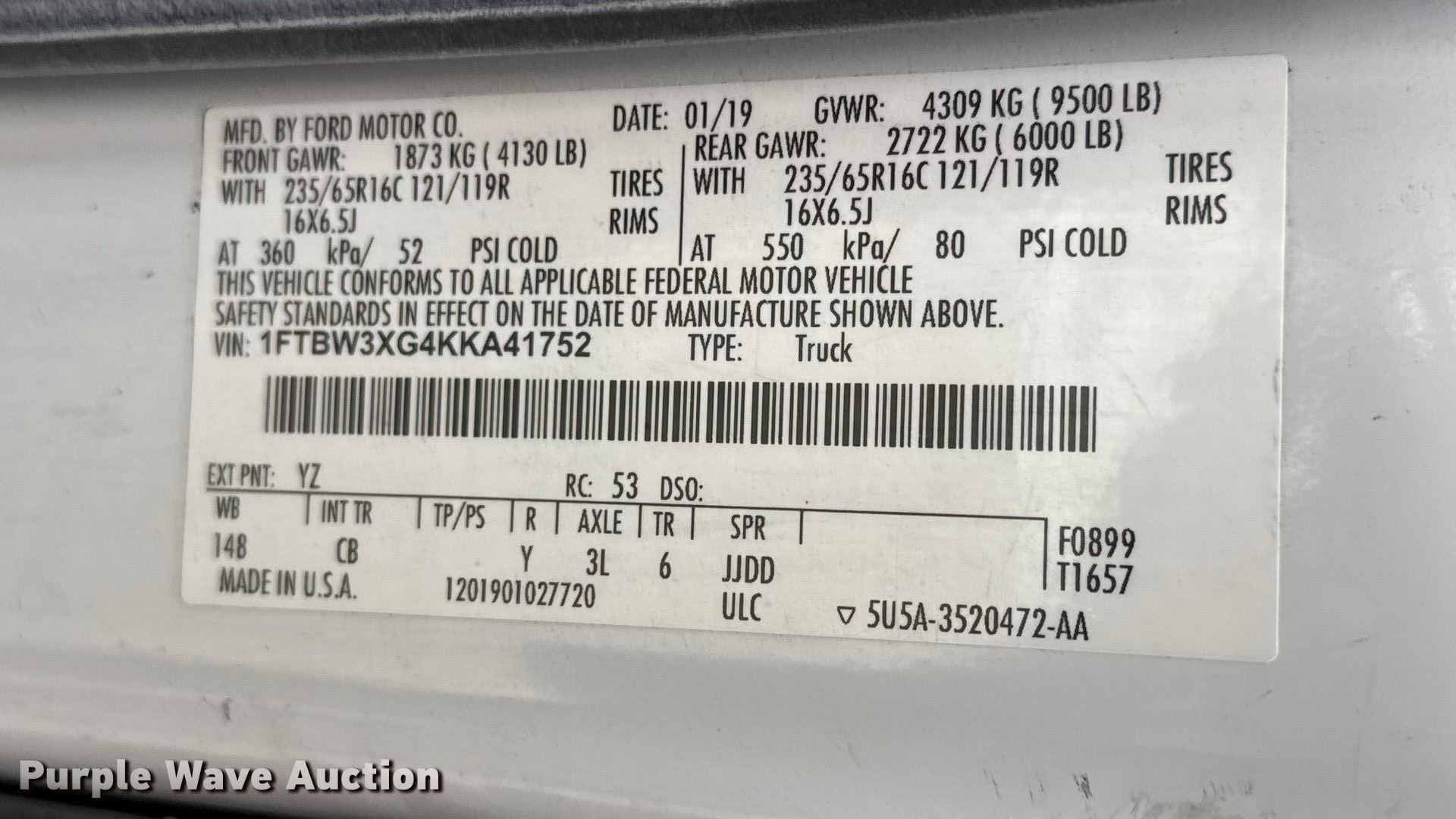 Purple Wave is selling a used 3/4 or 1 Ton Pickup or Van in Kansas. This item is a 2019 Ford Transit 350 van with the following: Miles: 518,344 on odometer, VIN: 1FTBW3XG4KKA41752, Unit #: T8