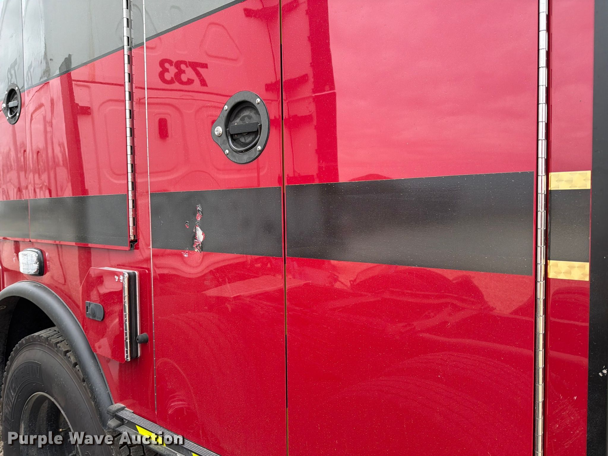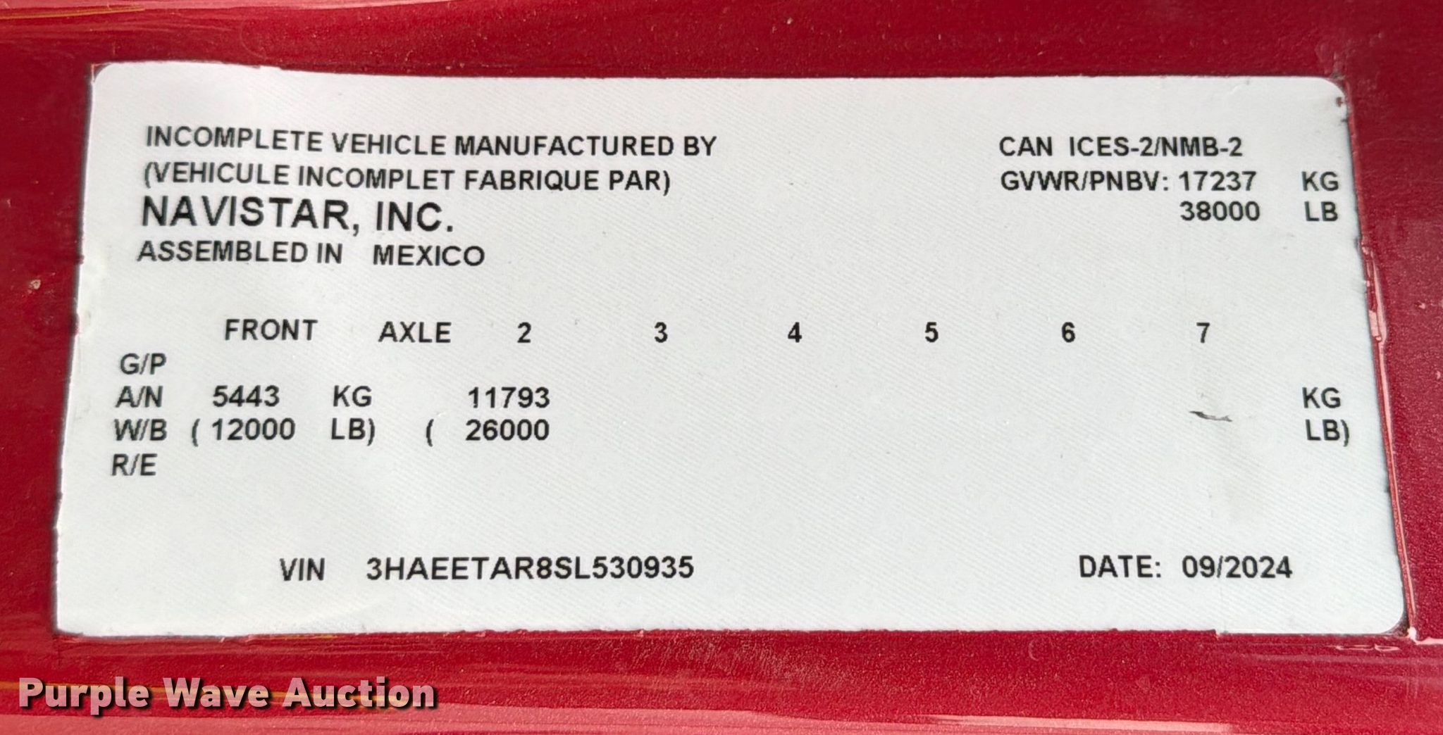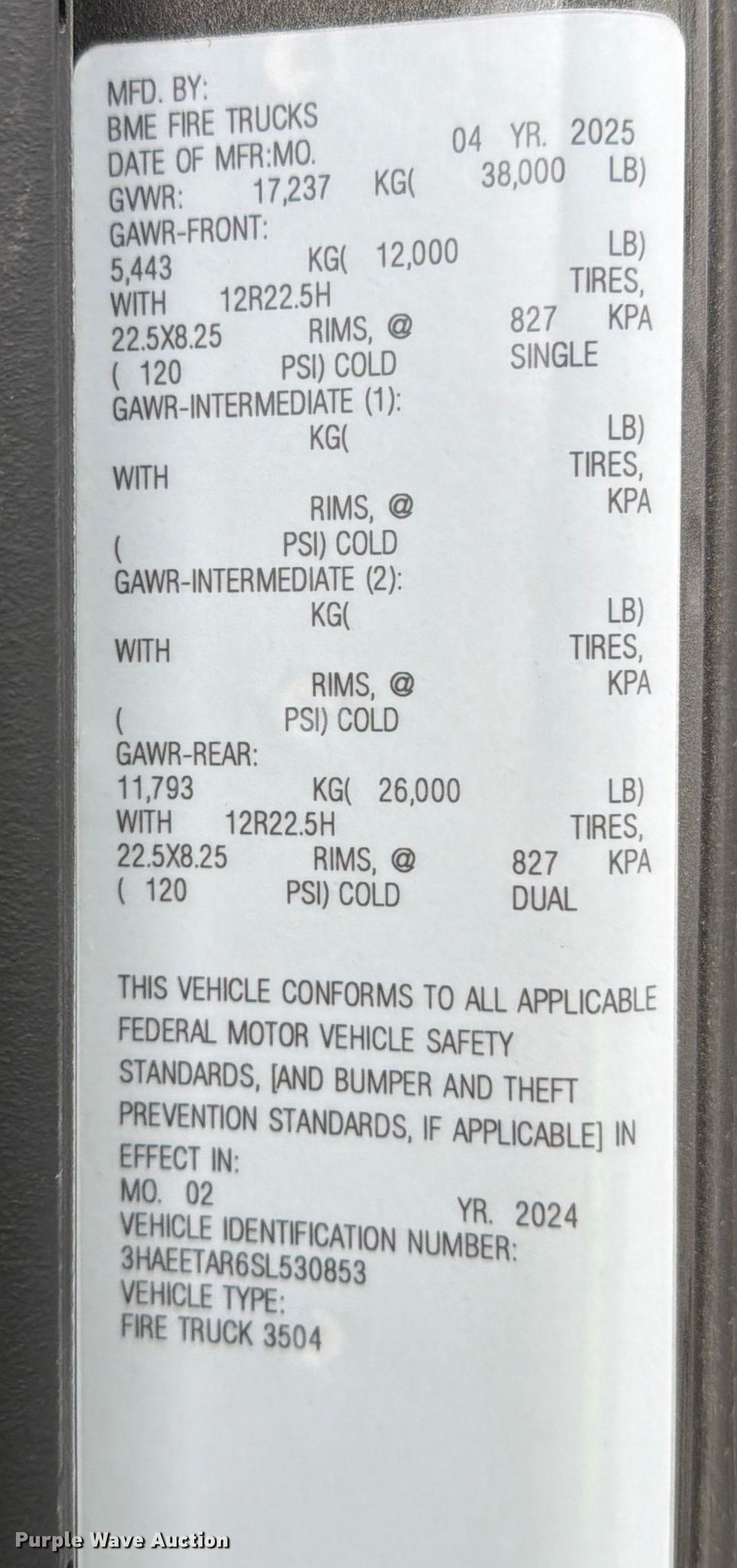 2025 International HV507 pumper fire truck. Miles: Unknown, VIN: 3HAEETAR8SL530935, Unit #: 96818135. Engine Cummins L9 360, Displacement: 8.9L, Cylinders: 6, Fuel type: Diesel, HP: 360, Engine brake. Transmission Automatic. Chassis Four wheel drive, Axles: Single, Suspension: Spring, Brakes: Air, GVWR: 38,000 lbs, Wheelbase: 183". Interior AC, Heat, Heated mirrors, Cruise control, Backup camera, Auxiliary controls. Features Fire truck body BME, Pump 500 gpm, Kubota engine Displacement: 0.898L, Fuel type: Diesel, Ground ladder, PA/ siren controls. Tires Size: 12R22.5, Brand: Michelin. Notes Engine partially disassembled Parts may be missing, Drivelines removed, Possible electrical issues, Windshield chipped or cracked, Flood damage, Non-operational unit Unit must be towed or hauled. Buyer responsible for all aspects of loadout and removal. Insurance salvage, stored at a secured facility. Please review REQUIRED REMOVAL INSTRUCTIONS. Titles will be distributed after confirmation of payment and removal. Texas salvage flood damage title. Mileage has not been verified. Exempt will be written in the odometer disclosure on the title. Title distribution may be delayed up to 30 days from verification of funds. Insurance Salvage. 11130 Applewhite Road. San Antonio, TX 78224