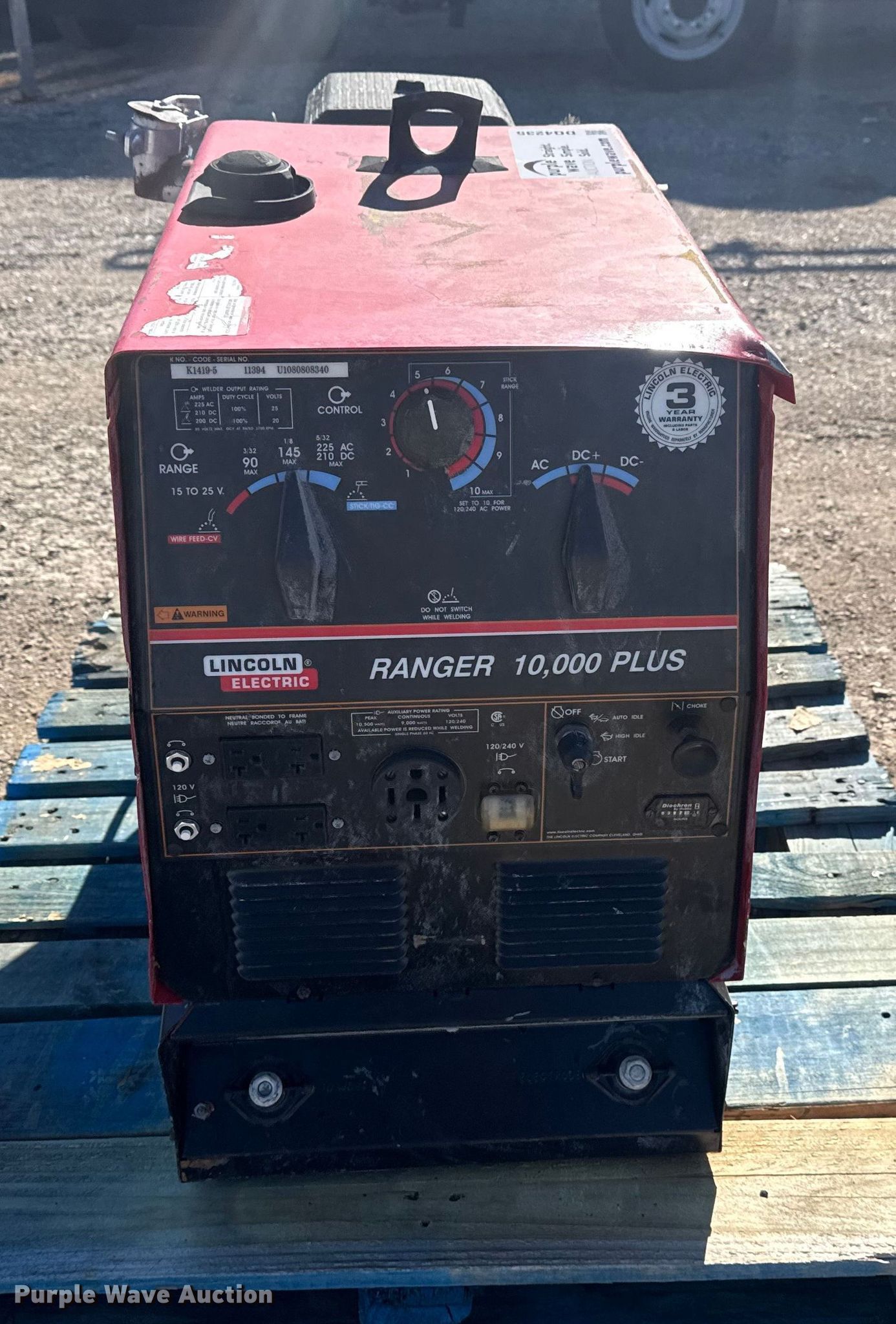 Purple Wave is selling a used Welder (Manual) in Oklahoma. This item is a Lincoln Electric Ranger 10,000 Plus welder/generator with the following: Hours: 383 on meter, Serial: U1080808340