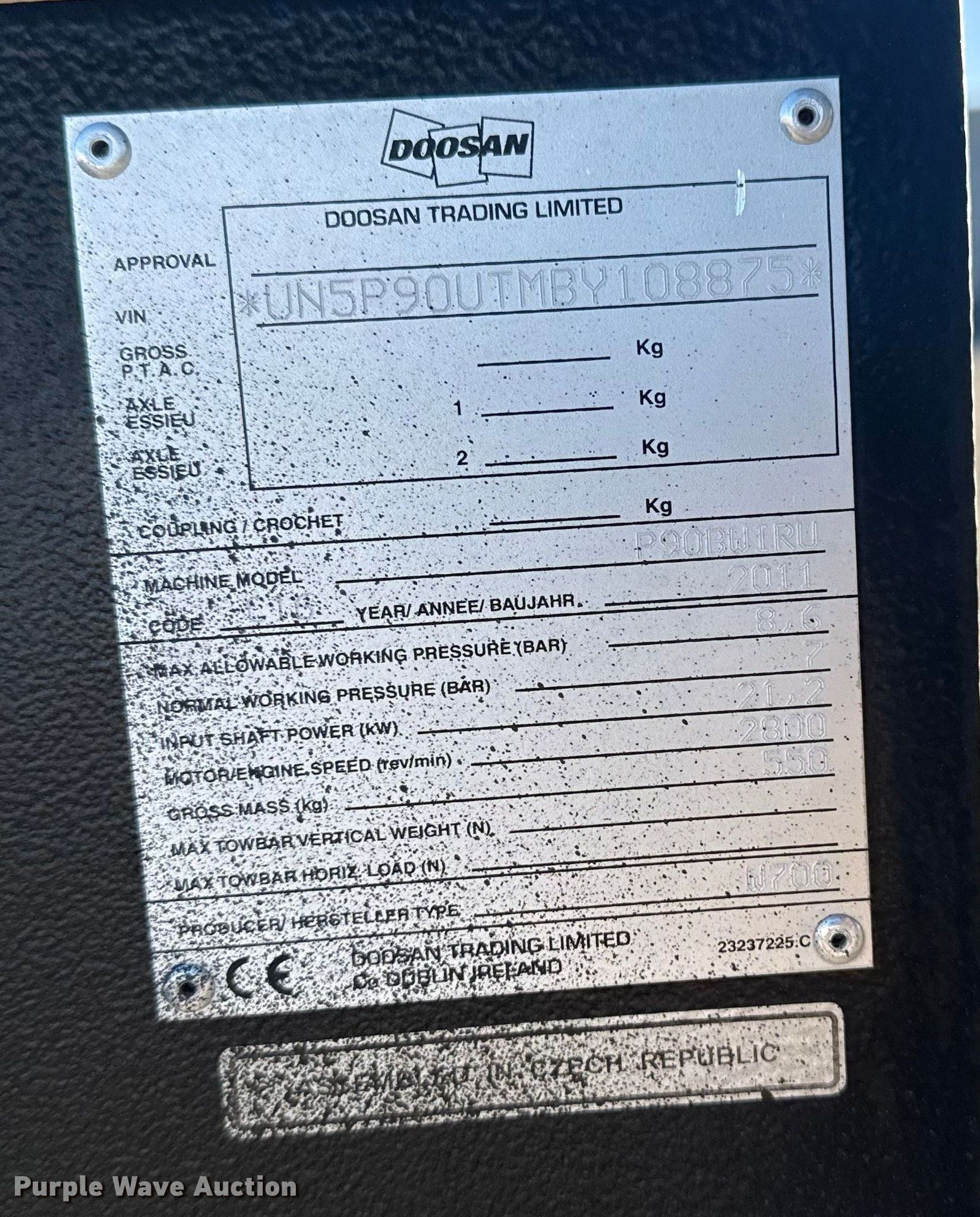 Purple Wave is selling a used Air Compressor in Oklahoma. This item is a 2011 Ingersoll Rand P90 air compressor with the following: Hours: 112 on meter, Serial: UN5P90UTMBY108875