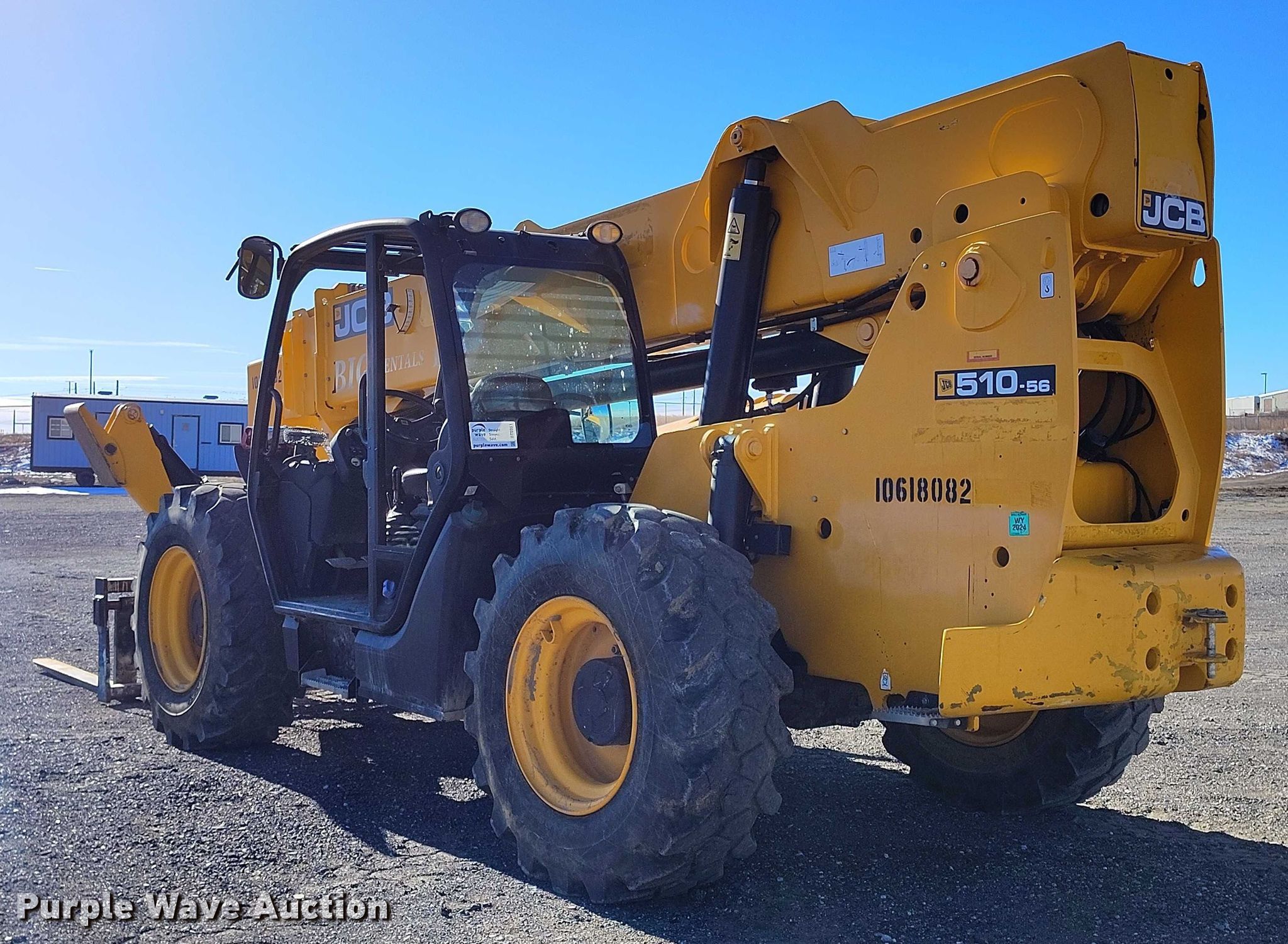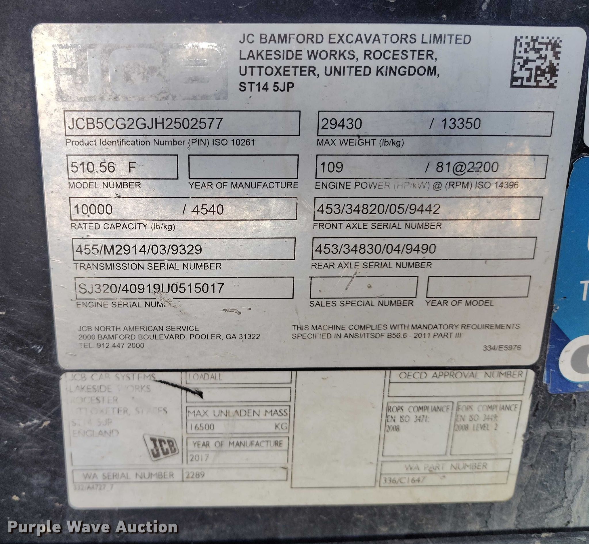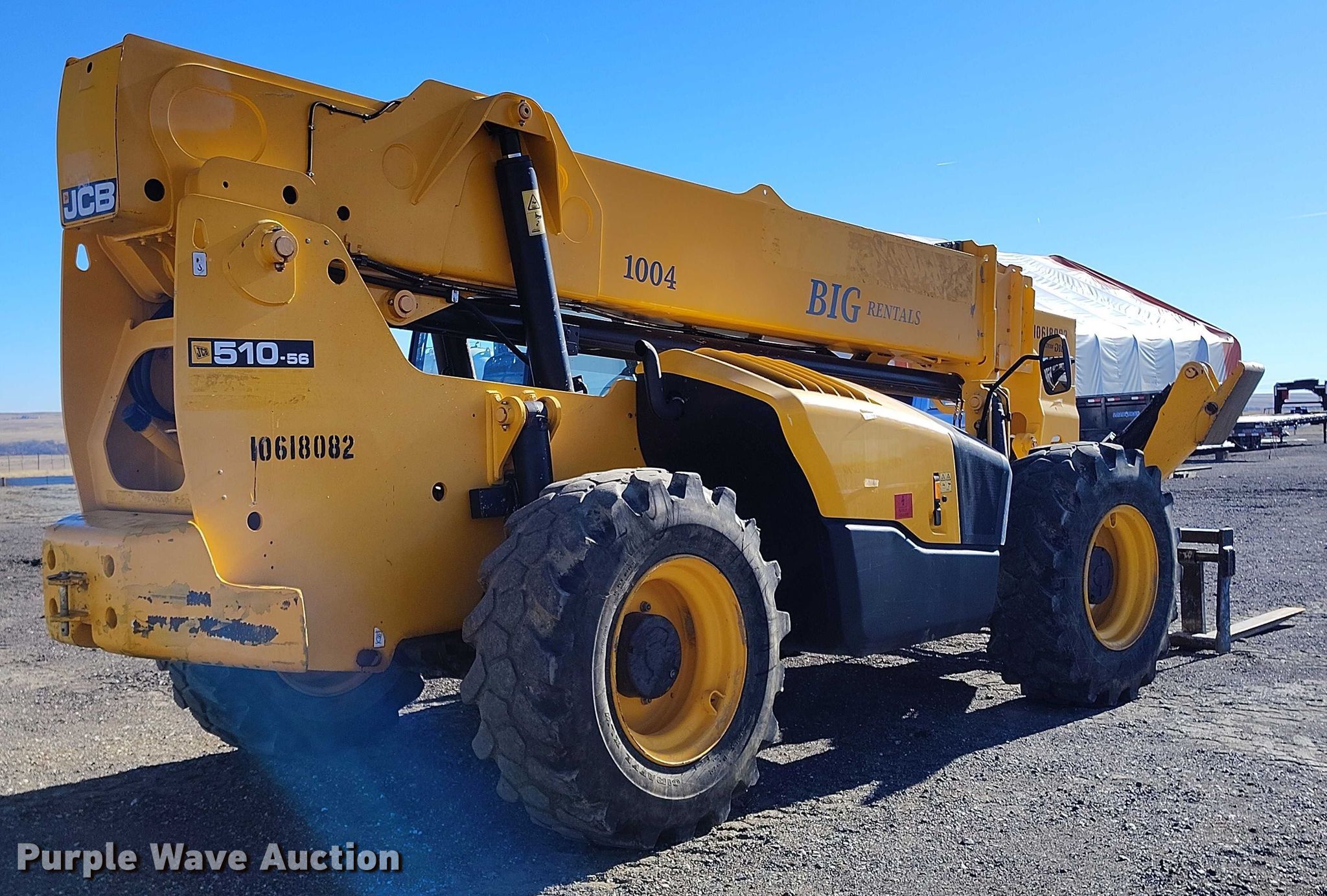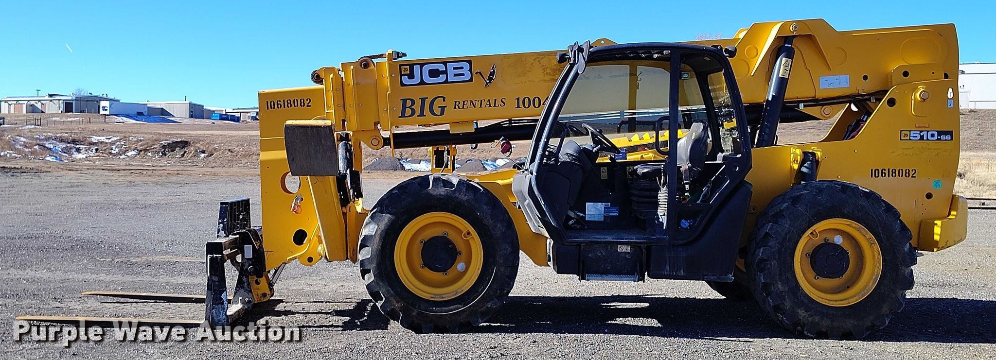 Purple Wave is selling a used Telehandler in Colorado. This item is a 2017 JCB 510.56 telehandler with the following: Hours: 4,400 on meter, Serial: JCB5CG2GJH2502577
