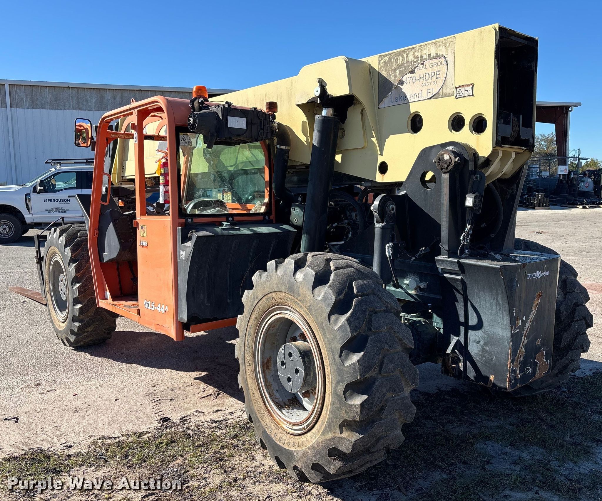 2017 JPG G15-44A telehandler. Hours: 2,643 on meter, Serial: 160078784, Unit #: SFS2835. Engine Cummins QSB4.5 130, Serial: 74060642, Displacement: 4.5L, Cylinders: 4, Fuel type: Diesel. Transmission Powershift, 4F - 4R. Operators station OROPS, Steering: Crab, Four wheel. Features Maximum lift capacity: 15,000 lbs, Maximum lift height: 44', Boom stages: 3, Fork length: 72", Auxiliary hydraulics, Hydraulic leveling, Quick attach: Manual. Tires Size: 17.5-25 L-2. Notes Jump start required during on-site data collection, Possible front differential issues, noise, Non-operational crab steering. Ferguson. Lakeland, FL 33801