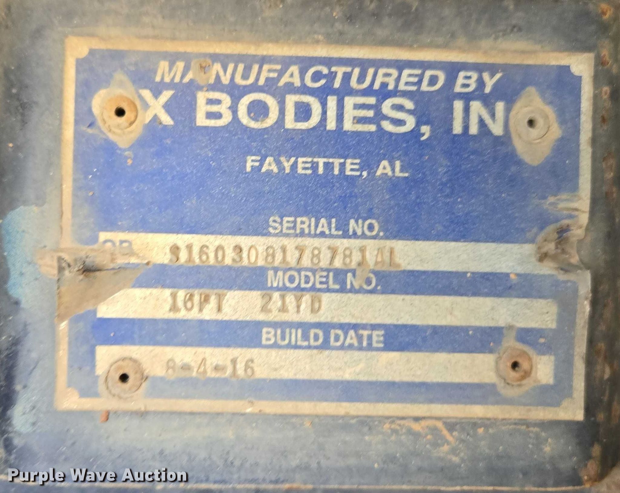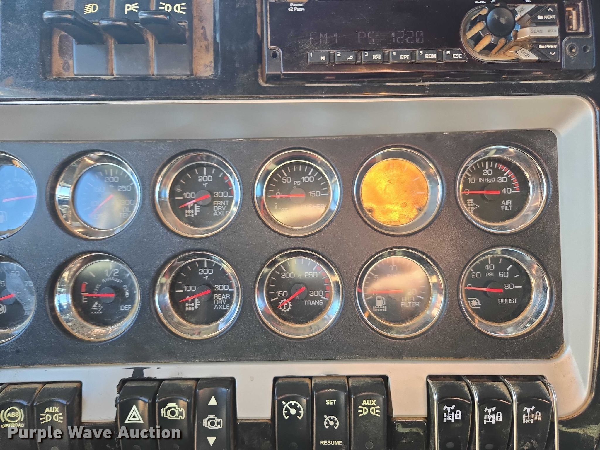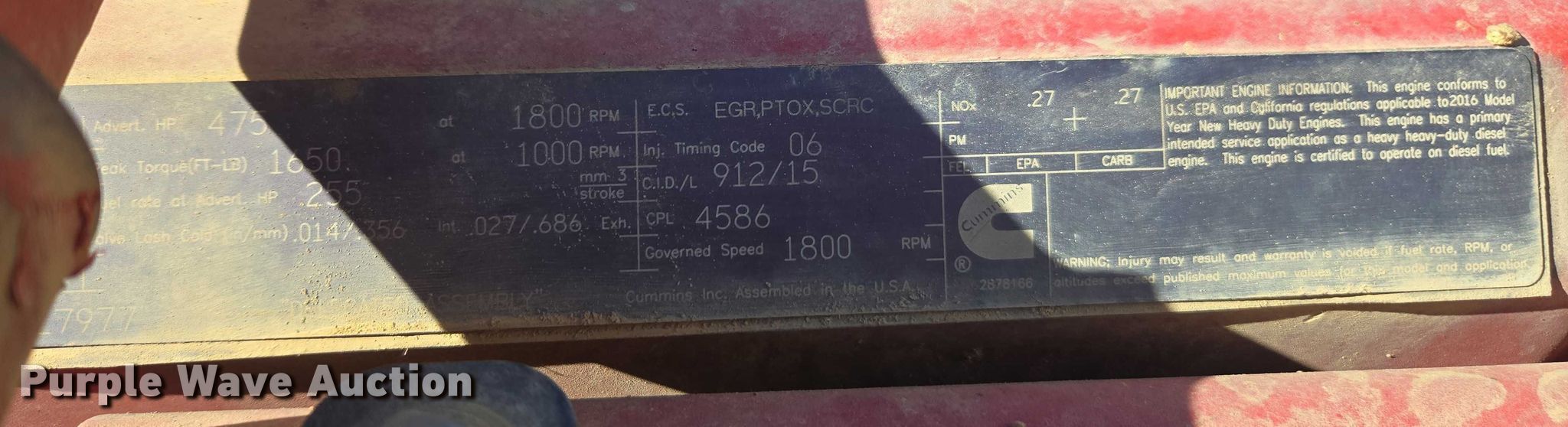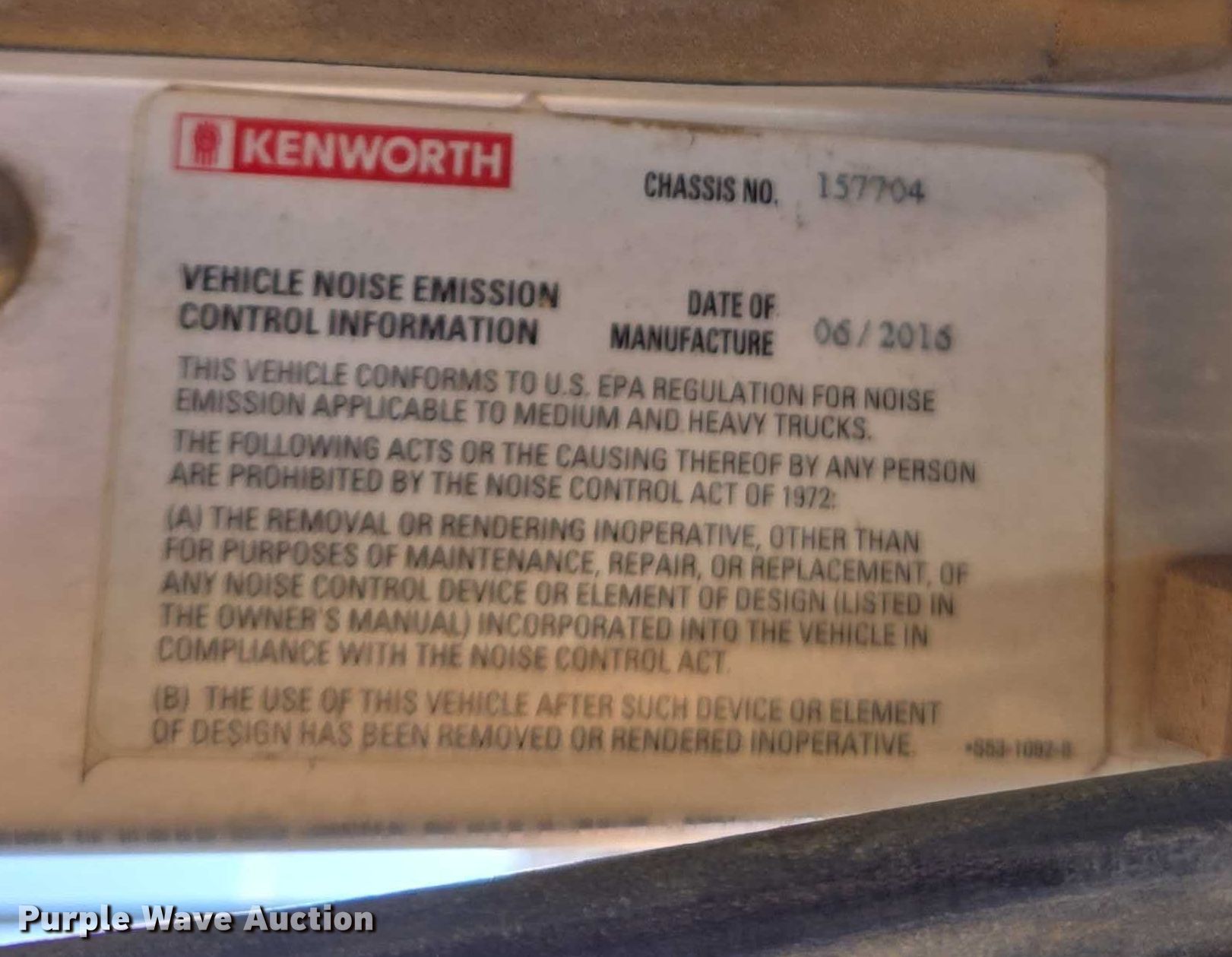 2017 Kenworth T800 dump truck. Miles: 440,529 on odometer, Hours: 17,854 on meter, VIN: 3BKDX4TX7HF157704. Engine Cummins ISX, Displacement: 15.0L, Cylinders: 6, Fuel type: Diesel, Engine brake. Transmission Eaton Fuller, Manual, Speed: 10. Chassis Double frame, Axles: Triple, Pusher axle, Differential lock: Full, Suspension: Spring, Brakes: Air, PTO, GVWR: 88,500 lbs. Interior AC, Heat, Heated mirrors, Power windows, Cruise control. Features Bed Dump bed, ox bodies, Length: 16', Width: 96", Side height: 60", Bed type: Steel, Roll tarp, Ram: Single, End gate: Air operated. Tires Front: 385/65R22.5, Rear: 11R24.5, Lift axle: 11R22.5. Notes Decals will be removed prior to auction, Contents in cab not included, Dash warning indicator: Check engine, ABS, Engine derated, Driver door panel broken. Alabama title. Title distribution may be delayed up to 14 days from verification of funds. Area Sand & Gravel. Wetumpka, AL 36093
