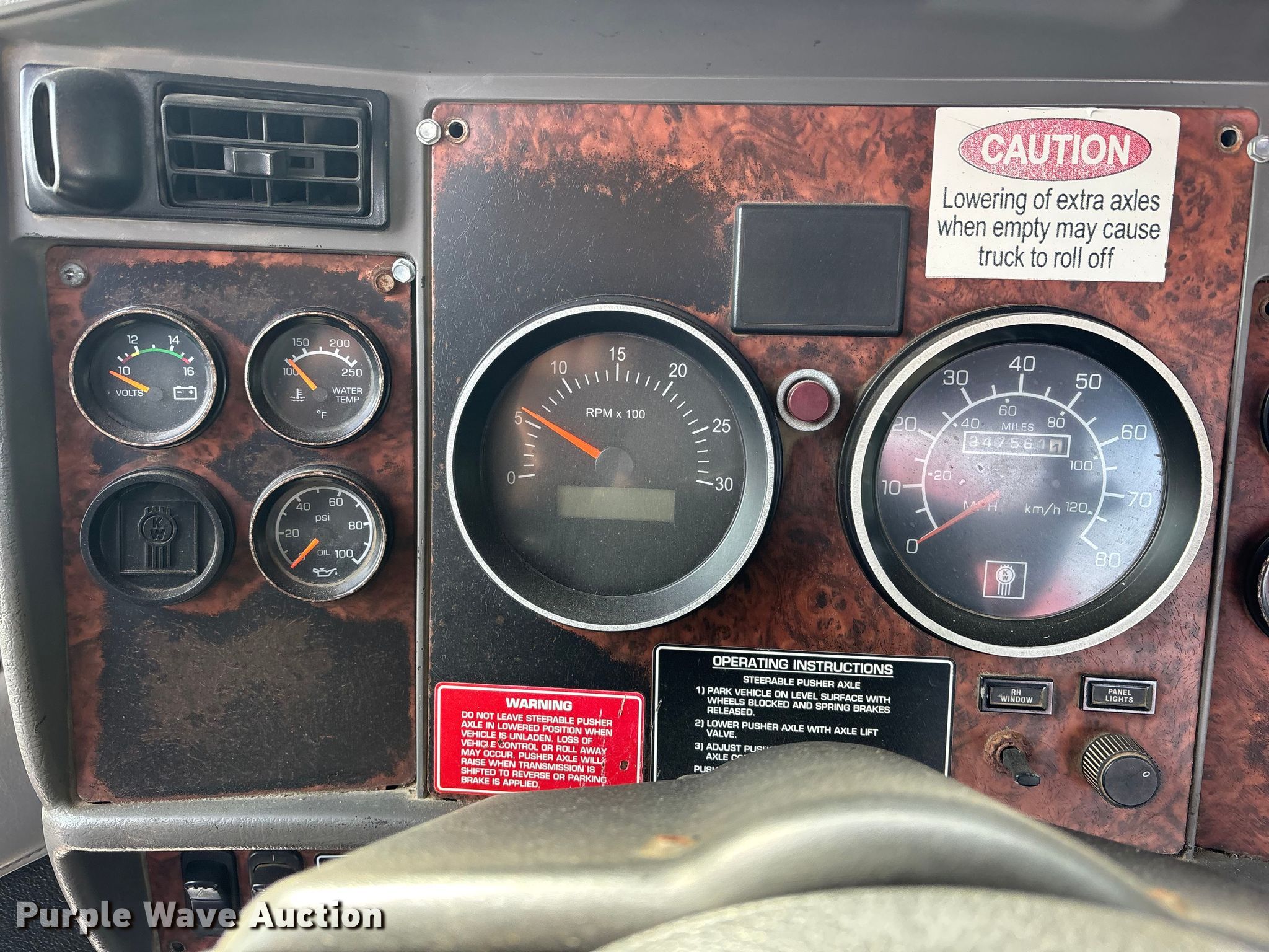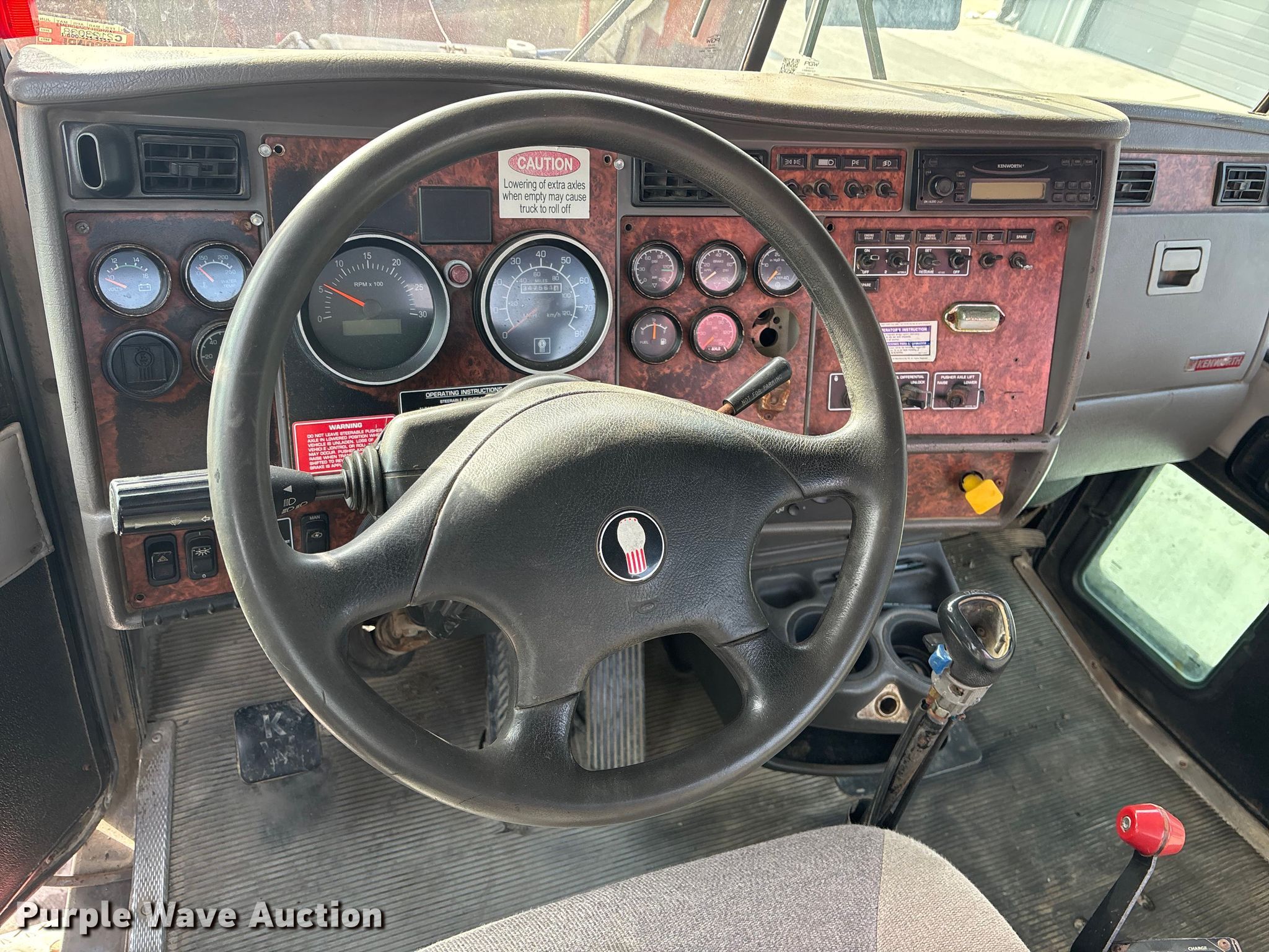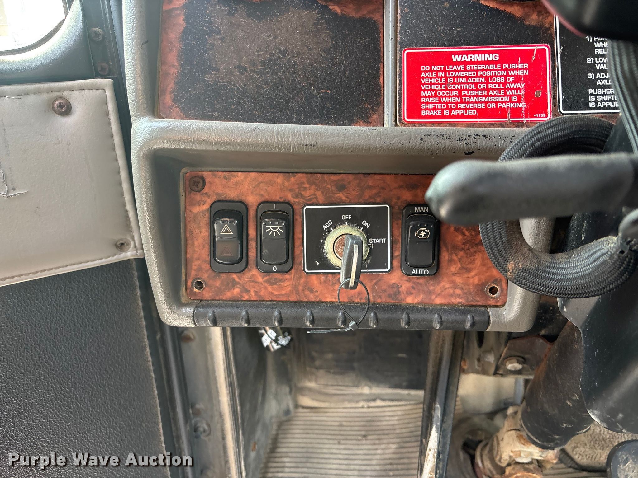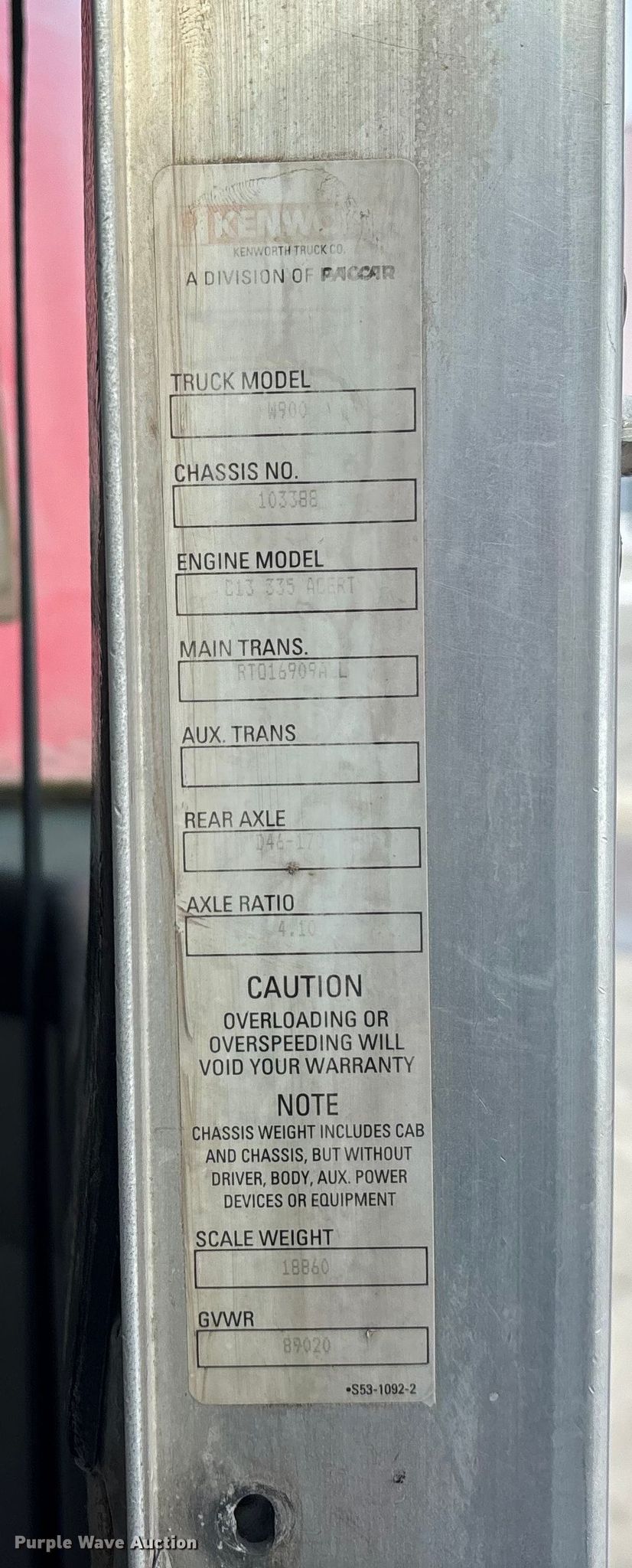 2005 Kenworth W900 ready mix truck. Miles: 347,561 on odometer, Hours: 3,200 on meter, VIN: 1NKWXUTX95J103388. Engine Caterpillar C13, Displacement: 12.0L, Cylinders: 6, Fuel type: Diesel, Engine brake. Transmission Eaton Fuller, Manual, Speed: 13. Chassis Axles: 4, Pusher axle Steerable, Tag axle Steerable, Differential lock: Inter-axle, Suspension: Spring, Brakes: Air, PTO, GVWR: 89,020 lbs. Interior AC, Heat, Heated mirrors, Cruise control. Features Mixer Mcneilus, Serial: 73310–24399, Capacity: 11 cu.yd., Rear drum controls, Water tank capacity: 125 gallons, Chute Extensions: 3.. Tires Front: 425/65R22.5, Rear: 11R22.5, Lift axle: 225/70R22.5. Notes Engine oil leak. Missouri title. Title distribution may be delayed up to 14 days from verification of funds. Calvert's Paving Inc... Kansas City, MO 64129