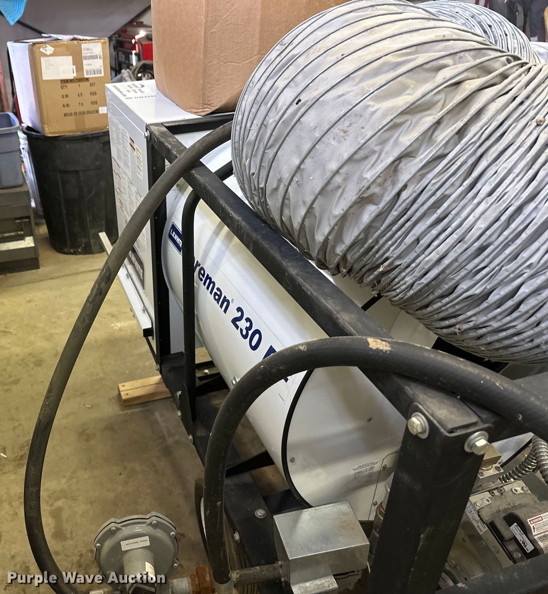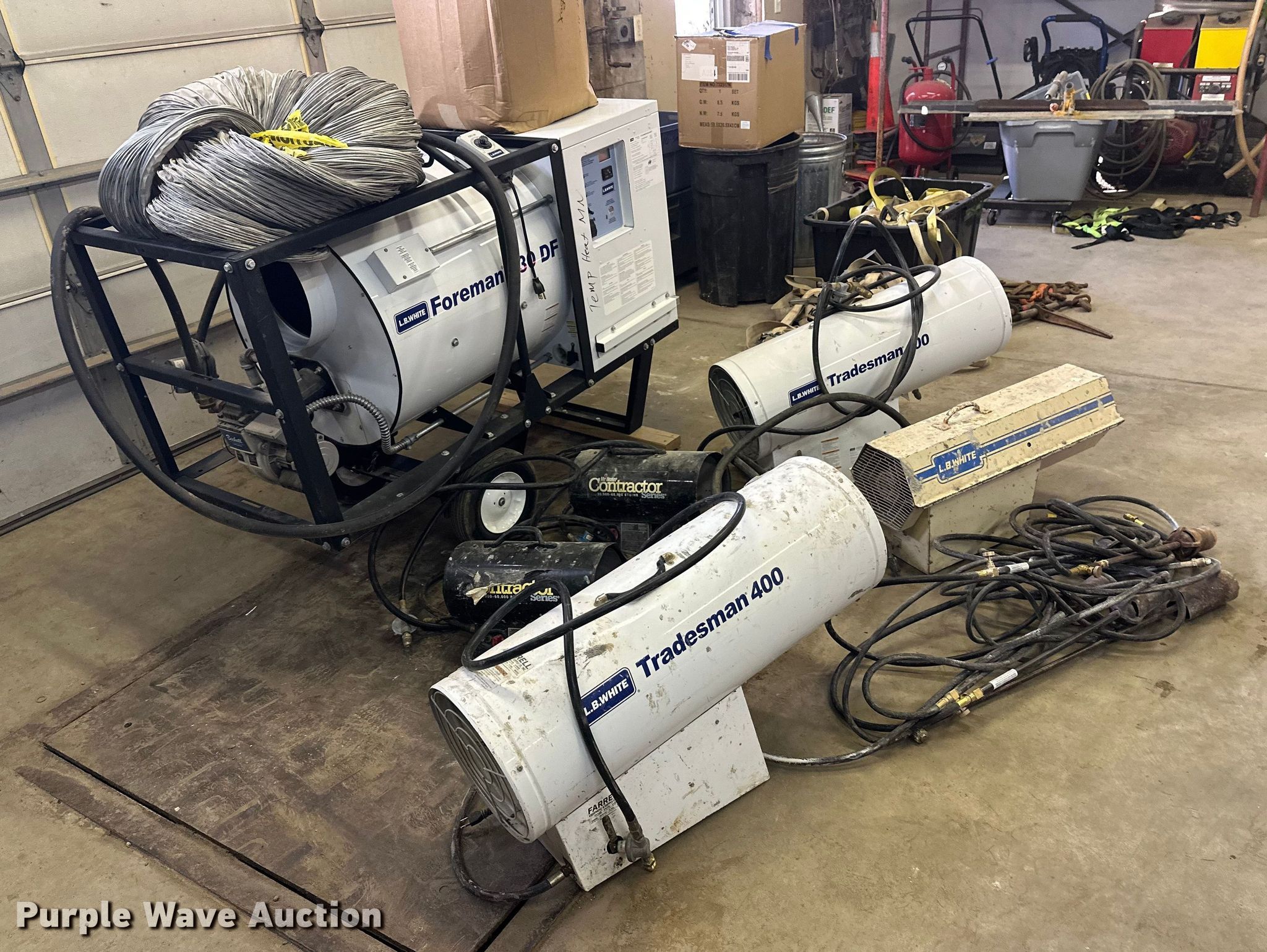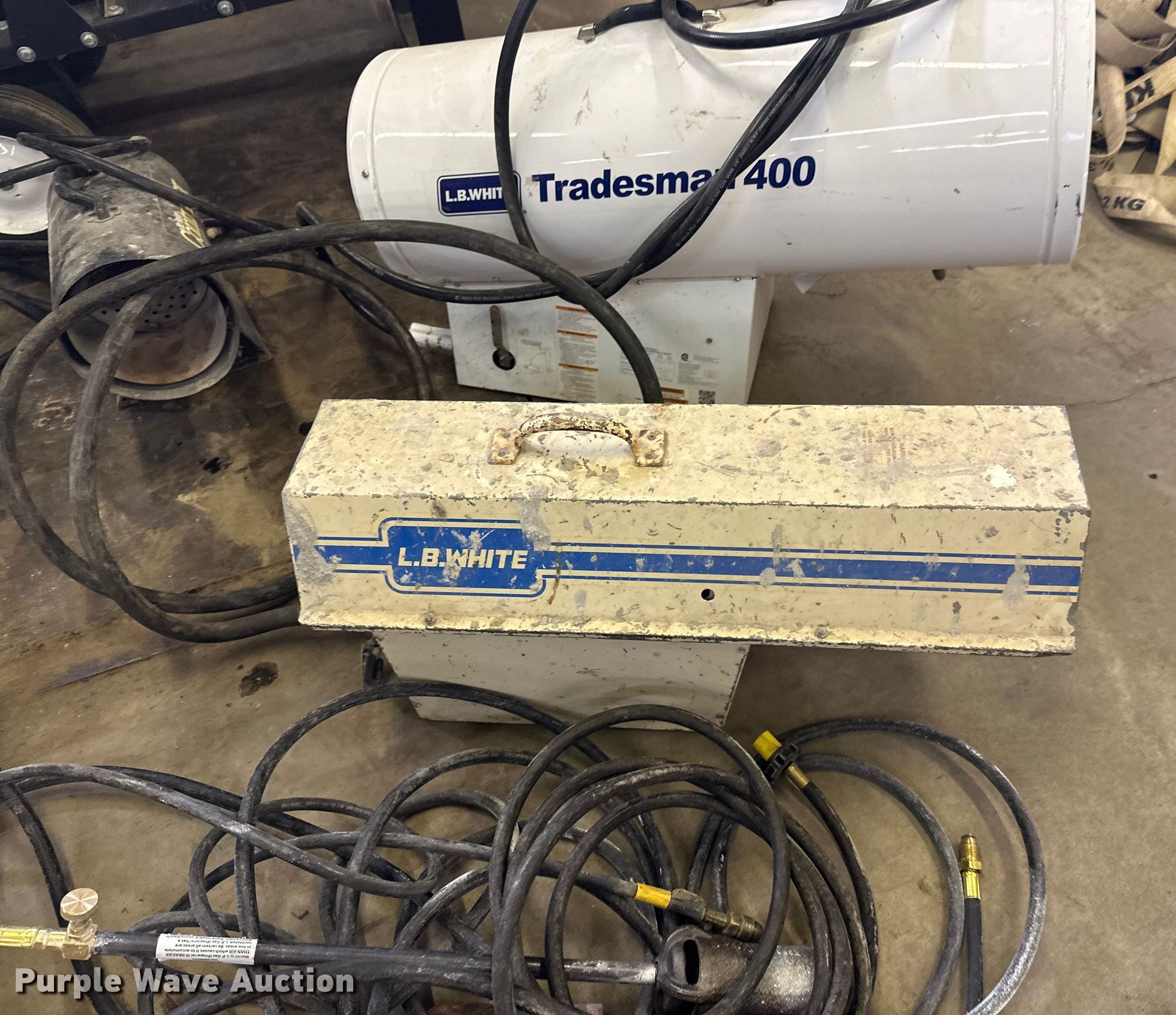 Purple Wave is selling a used Portable Heater or Fan in Minnesota. This item is a (10) heaters with the following: (2) 400,000btu LP, (2) 30-60,000 btu LP, 296E LP, (4) LP handheld burners, LB white foreman DF, Fuel type: Natural gas, Forced air, Hose